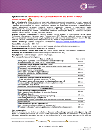 Tytuł szkolenia: Administracja bazą danych Microsoft SQL Server w wersji zaawansowanej Opis i cel szkolenia: Szkolenie jest przeznaczone dla osób zainteresowanych zarządzaniem serwerem bazy danych MS SQL Server, m.in. programistów baz danych, wdroŜeniowców aplikacji bazodanowych u klienta, przyszłych i obecnych administratorów baz danych. ZałoŜeniem szkolenia jest zapoznanie Uczestników z zaawansowanymi opcjami administracji serwerem. Uczestnik uzyskuje umiejętności związane z automatyzacją zadań administracyjnych, zarządzaniem i konfiguracją serwerem MS SQL Server, opcjami zarządzania wysoką dostępnością, replikacją baz danych, zarządzaniem serwerami połączonymi. KaŜdy z Uczestników otrzymuje materiały szkoleniowe oraz Certyfikat ukończenia szkolenia. Stopień trudności i wymagania1: Szkolenie trzeciego stopnia trudności – zaawansowane. Grupa szkoleń: Technologie Informatyczne. Wymagany status Partnera sektora ERP. Zalecana znajomość systemu operacyjnego Windows, znajomość relacyjnych baz danych i podstawowe wiadomości na temat architektury serwera MS SQL. Polecamy szkolenie Administracja bazą danych Microsoft SQL Server w wersji podstawowej. Termin i lokalizacja: Zgodnie z Ofertą szkoleń ERP na stronie: http://www.comarch.pl/erp/oferta/szkolenia. Koszt: 550 zł netto/osoba + 23% VAT. Czas trwania szkolenia: 16 godzin (z przerwami na usługi cateringowe i testem sprawdzającym). Grupa Uczestników: 10/13 osób (w zaleŜności od lokalizacji). Kategoria szkolenia i metoda nauczania: Stacjonarne. Wykład, warsztaty i ćwiczenia przy komputerze. Materiały dla Uczestników: W formie drukowanej i/lub elektronicznej (CD). Test/Egzamin: Test sprawdzający i egzamin certyfikujący. Plan nauczania i zakres tematyczny: I dzień szkolenia Rutynowe czynności administracyjne i ich automatyzacja Konfigurowanie MS SQL Server i MS SQL Server Agent Tworzenie zadań administracyjnych (Jobs) Definiowanie zadań i kroków wykonania, kategorie zadań, uruchamianie zadań Tworzenie harmonogramów Harmonogramowanie wykonania zadań Tworzenie operatorów i powiadomień Zarządzanie operatorami, powiadomieniami Przerwa obiadowa Tworzenie operatorów i powiadomień cd. Historia powiadomień, tworzenie operatorów Fail-Safe Tworzenie alertów i reagowanie w sytuacjach kryzysowych Tworzenie alertów dotyczących błędów i alertów wydajnościowych Konserwacja bazy danych Definiowanie planów konserwacji Maintenance Plans II dzień szkolenia Zarządzanie wysoką dostępnością Klastry bezpieczeństwa, Database Mirroring, Log Shipping Replikacja danych Cele replikacji, modele replikacji, konfiguracja replikacji Widoki dynamicznego zarządzania Wybrane widoki dynamicznego zarządzania związane z administracją serwerem Przerwa obiadowa Zarządzanie serwerami połączonymi Praca z serwerami połączonymi i danymi rozproszonymi Test sprawdzający/egzamin, podsumowanie i zakończenie szkolenia Czas trwania 60 min. 90 min. 60 min. 30 min. 60 min. 60 min. 60 min. 60 min. 60 min. 120 min. 60 min. 60 min. 150 min. 30 min. Test sprawdzający Szkolenie zakończone jest testem sprawdzającym (testem wielokrotnego wyboru), składającym się z 10 pytań. W kaŜdym pytaniu moŜe być dowolna liczba poprawnych odpowiedzi. Nie zaznaczenie w danym pytaniu wszystkich poprawnych odpowiedzi skutkuje nie naliczeniem punktów za dane pytanie. Nie ma punktów ujemnych 1 WyróŜniamy 3 stopnie trudności szkoleń: 1-podstawowy, 2-średniozaawansowany, 3-zaawansowany. www.comarch.pl/szkolenia Strona 1 25 sierpnia 2011 oraz ułamkowych. Czas trwania testu to 15 minut. W przypadku nie zaliczenia pozytywnie testu – nie ma testu poprawkowego. Warunkiem uzyskania pozytywnego wyniku jest udzielenie przynajmniej 60% poprawnych odpowiedzi. Wyniki testu podawane są przez Prowadzących szkolenie, a uzupełnione formularze testowe nie są wydawane Uczestnikom. Pozytywny wynik testu skutkuje odnotowaniem uczestnictwa w Programie Partnerskim. www.comarch.pl/szkolenia Strona 2 25 sierpnia 2011