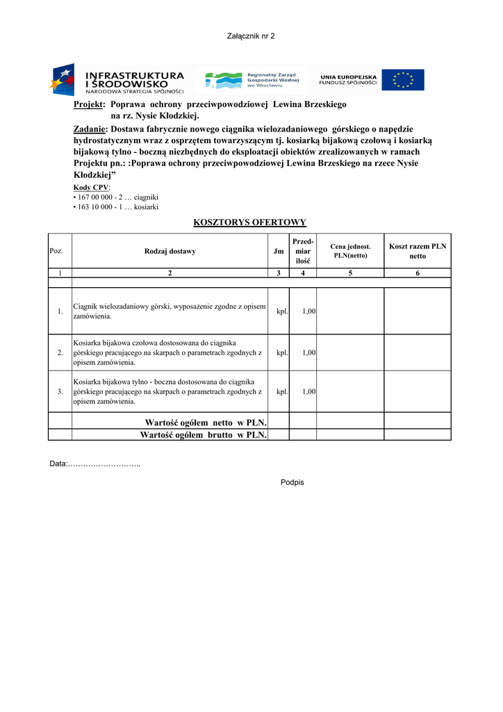 Załącznik nr 2 Projekt: Poprawa ochrony przeciwpowodziowej Lewina Brzeskiego na rz. Nysie Kłodzkiej. Zadanie: Dostawa fabrycznie nowego ciągnika wielozadaniowego górskiego o napędzie hydrostatycznym wraz z osprzętem towarzyszącym tj. kosiarką bijakową czołową i kosiarką bijakową tylno - boczną niezbędnych do eksploatacji obiektów zrealizowanych w ramach Projektu pn.: :Poprawa ochrony przeciwpowodziowej Lewina Brzeskiego na rzece Nysie Kłodzkiej” Kody CPV: • 167 00 000 - 2 … ciągniki • 163 10 000 - 1 … kosiarki KOSZTORYS OFERTOWY Rodzaj dostawy Jm Przedmiar ilość Cena jednost. PLN(netto) Koszt razem PLN netto 1 2 3 4 5 6 1. Ciągnik wielozadaniowy górski, wyposażenie zgodne z opisem zamówienia. kpl. 1,00 2. Kosiarka bijakowa czołowa dostosowana do ciągnika górskiego pracującego na skarpach o parametrach zgodnych z opisem zamówienia. kpl. 1,00 3. Kosiarka bijakowa tylno - boczna dostosowana do ciągnika górskiego pracującego na skarpach o parametrach zgodnych z opisem zamówienia. kpl. 1,00 Poz. Wartość ogółem netto w PLN. Wartość ogółem brutto w PLN. Data:……………………….. Podpis