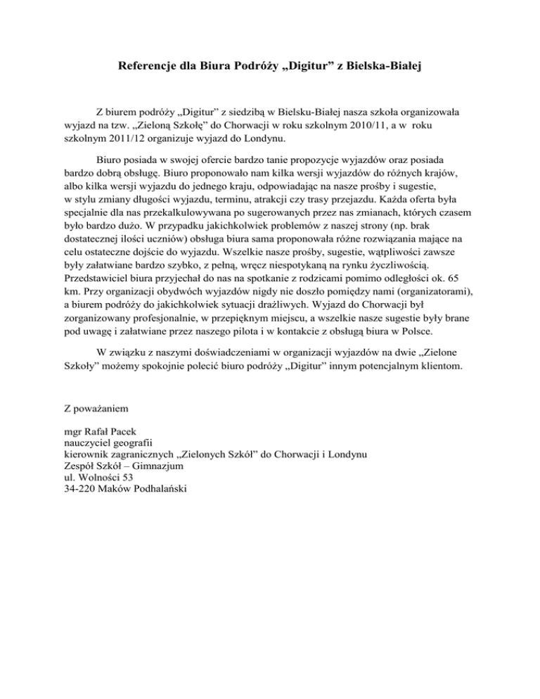 Referencje dla Biura Podróży „Digitur” z Bielska-Białej Z biurem podróży „Digitur” z siedzibą w Bielsku-Białej nasza szkoła organizowała wyjazd na tzw. „Zieloną Szkołę” do Chorwacji w roku szkolnym 2010/11, a w roku szkolnym 2011/12 organizuje wyjazd do Londynu. Biuro posiada w swojej ofercie bardzo tanie propozycje wyjazdów oraz posiada bardzo dobrą obsługę. Biuro proponowało nam kilka wersji wyjazdów do różnych krajów, albo kilka wersji wyjazdu do jednego kraju, odpowiadając na nasze prośby i sugestie, w stylu zmiany długości wyjazdu, terminu, atrakcji czy trasy przejazdu. Każda oferta była specjalnie dla nas przekalkulowywana po sugerowanych przez nas zmianach, których czasem było bardzo dużo. W przypadku jakichkolwiek problemów z naszej strony (np. brak dostatecznej ilości uczniów) obsługa biura sama proponowała różne rozwiązania mające na celu ostateczne dojście do wyjazdu. Wszelkie nasze prośby, sugestie, wątpliwości zawsze były załatwiane bardzo szybko, z pełną, wręcz niespotykaną na rynku życzliwością. Przedstawiciel biura przyjechał do nas na spotkanie z rodzicami pomimo odległości ok. 65 km. Przy organizacji obydwóch wyjazdów nigdy nie doszło pomiędzy nami (organizatorami), a biurem podróży do jakichkolwiek sytuacji drażliwych. Wyjazd do Chorwacji był zorganizowany profesjonalnie, w przepięknym miejscu, a wszelkie nasze sugestie były brane pod uwagę i załatwiane przez naszego pilota i w kontakcie z obsługą biura w Polsce. W związku z naszymi doświadczeniami w organizacji wyjazdów na dwie „Zielone Szkoły” możemy spokojnie polecić biuro podróży „Digitur” innym potencjalnym klientom. Z poważaniem mgr Rafał Pacek nauczyciel geografii kierownik zagranicznych „Zielonych Szkół” do Chorwacji i Londynu Zespół Szkół – Gimnazjum ul. Wolności 53 34-220 Maków Podhalański