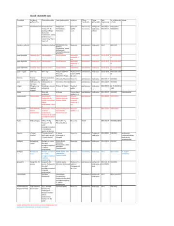 KLASA 1B LICEUM SMS Przedmiot Tytuł serii podręcznika Tytuł podręcznika Autor podręcznika j. polski Ponad słowami Ponad słowami. Małgorzata Podręcznik do Chmiel,Eliza języka polskiego Kostrzewa dla liceum i technikum. Zakres podstawowy i rozszerzony. Klasa I Część I, II Spotkania z kulturą Monika Bokiniec, wiedza o kulturze wydawca Zakres kształcenia Forma Data Nr ewidencyjny uwaga podręcznika dopuszczeni wykazie a Nowa Era Spółka z o.o. Podstawowy podręcznik rozszerzony tradycyjny, e-book 2012-01-27 425/1/2012 2012-07-11 425/2/2012 Nowa era podstawowy tradycyjny 2012 rozszerzony tradycyjna 19.03.2015 674/2/2013/20 15 rozszerzony tradycyjna 19.03.2015 674/3/2014/20 15 podstawowy tradycyjna 16.03.2015 717/2/2014/20 15 24.02.2015 294/1/2011/20 15 449/2012 Barbara Forysiewicz, Jacek Michałowski, Natalia MrozkowiakNastrożna język angielski Gateway plus * Gateway plus 2 David Spencer język angielski Gateway plus * Gateway plus 3 David Spencer język niemiecki Exakt für Dich * Exakt für Dich 1 Giorgio Motta Macmillan Polska Sp. z o.o. Macmillan Polska Sp. z o.o. LektorKlett język rosyjski Wot i my Wot i my 1 Małgorzata WiatrKmieciak, Sławomira Wujec Wydawnictwo podstawowy tradycyjna Szkolne PWN Sp. z o.o. historia Poznać przeszłość. Odkrywa--my na nowo. Z Bogiem na ludzkich drogach Poznać przeszłość. S.Roszak,J.Kłaczkow Nowa Era Wiek XX. Odkrywamy na Z.Smutek,J.Maleska Operon nowo. Świadczę o Jezusie R.Strus, W.Galant Gaudium w Kościele Lublin wos religia etyka podstawowy tradycyjna 2012-04-17 525/2012 podstawowy tradycyjna 2011-12-29 407/2011 podstawowy tradycyjna 2012-07-22 AZ-41-01/10-LU1/12 podstawowy tradycyjna 2011-07-15 354/2011 podstawowy 2012-01-03 412/1/2012 Wojciech Babiański, Nowa Era Lech Chańko, Spółka z o.o Dorota Ponczek podstawowy 2011-10-07 378/1/2011 Marcin Braun, Weronika Śliwa Nowa Era kl1 LO 2015-01-29 447/2012/2015 R. Hassa, A.Mrzigod, J. Mrzigod Etyka dla myślących Matematyka Matematyka. Podręcznik do liceów i techników. Zakres podstawowy. Klasa 1 MATeMAtyka. Matematyka. Klasa Zakres 1. Zakres podstawowy podstawowy. Podręcznik do szkół ponadgimnazjalnyc h Odkryć fizykę Odkryć fizykę. Podręcznik dla szkół ponadgimnazjalnyc h. Kształcenie ogólne w zakresie „To jest "To jest chemia" + chemia” Karty pracy ucznia „To jest chemia” M.Środa Nowa Era podstawowy Podręcznik tradycyjny 2012-02-03 438/2012 biologia Biologia na czasie Emilia Bonar, Nowa era Weronika Krzeszowiec-Jeleń, Stanisław Czachorowski podstawowy tradycyjny 2012-12-14 450/220 biologia Biologia na czasie Marek Guzik, Ewa Jastrzębska, Ryszard Kozik rozszerzony 2012 geografia Geografia. Po prostu matematyka matematyka fizyka chemia informatyka wychowanie do bezpieczeństwa Żyję i działam bezpiecznie. Biologia na czasie dla szkół ponagimnazjalknyc h. Zakres podstawowy Biologia na czasie 1 dla szkół ponagimnazjalknyc h. Zakres rozszerzony Geografia. Po prostu. Podręcznik dla szkół ponadgimnazjalnyc h. Zakres podstawowy Jarosław Skłodowski Żyję i działam bezpiecznie Edukacja dla bezpieczeństwa Zakres podstawowy Podręcznik dla szkół Marcin Kurczab, Elżbieta Kurczab, Elżbieta Świda Czarna Owca Spółka z o.o. Oficyna Edukacyjna Krzysztof Pazdro Sp. z o.o. Nowa era tradycyjny 564/1/2012 Izabella Łęcka, Wydawnictwa podstawow y podręcznik 2012-04- 04 511/2012 Mirosław Mularczyk Szkolne i tradycyjny, e-511/2012 1 Pedagogiczne book Sp. z o.o. Informatyka Europejczyka. Podręcznik dla szkół ponadgimnazjalnyc h. Zakres podstawowy Jarosław Słoma, Nowa Era wybór podręcznika we wrześniu po teście diagnostycznym podręcznik obowiązkowy w drugim semestrze podstawow y podręcznik tradycyjny, 2012 MEN 556/2012 podstawowy tradycyjny 2012 426/2012 fakultatywny podręcznik nieobowiązkowy, karty pracy obowiązkowe w drugim semestrze