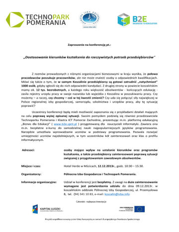 Zaproszenie na konferencję pt.: „Dostosowanie kierunków kształcenia do rzeczywistych potrzeb przedsiębiorców” Z rozmów prowadzonych z różnymi organizacjami biznesowymi w kraju wynika, że połowa pracodawców poszukuje pracowników, ale nie może znaleźć osoby o odpowiednich kwalifikacjach. Mówi się także o tym, że w samym Koszalinie przedsiębiorcy są gotowi zatrudnić „natychmiast” 1000 osób, gdyby zgłosili się do nich odpowiedni kandydaci. Z drugiej strony w powiecie koszalińskim mamy ok. 12 tys. bezrobotnych, a każdego roku większość absolwentów - kończących edukację zasila rejestry urzędu pracy w swoje nazwiska lub wyjeżdża z Koszalina w poszukiwaniu pracy. Czy możemy – a raczej, czy chcemy – coś w tej kwestii zmienić? Czy uda się połączyć siły największej w Polsce regionalnej izby gospodarczej, samorządu, szkolnictwa i urzędów pracy, aby tę sytuację poprawić? Uczestnicy konferencji będą mieli możliwość zapoznania się z przykładami działań mających na celu poprawę wyżej opisanej sytuacji. Swoim pomysłem podzielą się również przedstawiciele Technoparku Pomerania i Klastra ICT Pomorze Zachodnie, prezentując m.in. platformę edukacyjną „Biznes dla Edukacji” ( www.b2e.spnt.pl ) przygotowaną dla nauczycieli informatyki. Zawiera ona m.in. bezpłatne e-kursy do samodzielnej nauki najpopularniejszych języków programowania. Narzędzie umożliwia wprowadzanie uczniów w podstawy programowania. Pozwala rozwijać umiejętności uczniów najzdolniejszych, w tym uczestników kół zainteresowań oraz klas o profilu informatycznym. Adresaci: osoby mające wpływ na ustalanie kierunków oraz programów kształcenia, a także przedsiębiorcy zainteresowani poprawą sytuacji związanej z przygotowaniem zawodowym absolwentów. Miejsce i czas: Hotel Verde w Mścicach, 12.12.2013r., godz. 10:30 – 15:30. Organizatorzy: Północna Izba Gospodarcza i Technopark Pomerania. Informacje organizacyjne: Udział w konferencji jest bezpłatny. Z uwagi na duże zainteresowanie wymagane jest potwierdzenia udziału do dnia 09.12.2013r. w koszalińskim oddziale Północnej Izby Gospodarczej, ul. Przemysłowa 8, tel. (94) 341 10 83, e-mail: [email protected] Agenda: 10.30 – 11.00 Rejestracja uczestników 11.00 – 11.45 Sytuacja na rynku pracy z perspektywy przedsiębiorców Robert Bodendorf - Północna Izba Gospodarcza 11.45 – 12.30 TECHNOPARK - realizator modelu współpracy edukacji z biznesem Andrzej Feterowski Prezes Szczecińskiego Parku Naukowo-Technologicznego Sp. z o.o. w Szczecinie 12.30 – 13.00 Przerwa kawowa 13.00 – 13.20 Model współpracy w obszarze jakości kształcenia młodzieży w kierunkach informatycznych Rafał Malujda Członek Zarządu Klaster ICT Pomorze Zachodnie 13.20 – 13.40 Struktura absolwentów vs. struktura bezrobotnych Karolina Dubanowska - Północna Izba Gospodarcza 13.40 – 14.30 Dostosowanie kierunków kształcenia do rzeczywistych potrzeb przedsiębiorców – debata z przedstawicielami samorządu, szkół i przedsiębiorstw 14.30 – 15.30 Lunch ICT (B)usiness to(2) (E)ducation czyli modernizacja oferty kształcenia zawodowego szkół o profilu informatycznym w powiązaniu z potrzebami lokalnego/ regionalnego rynku pracy” Priorytet IX Rozwój wykształcenia i kompetencji w regionach, Działanie 9.2 Podniesienie atrakcyjności i jakości szkolnictwa zawodowego, współfinansowanego przez Unię Europejską w ramach Europejskiego Funduszu Społecznego oraz budżetu państwa.