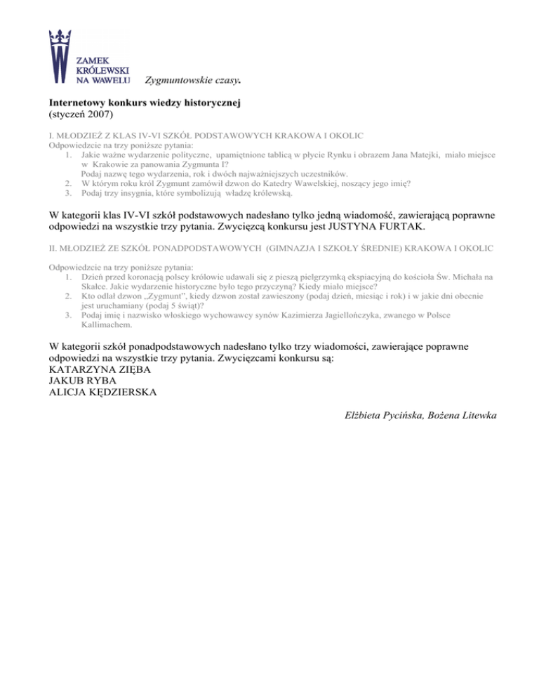 Zygmuntowskie czasy. Internetowy konkurs wiedzy historycznej (styczeń 2007) I. MŁODZIEŻ Z KLAS IV-VI SZKÓŁ PODSTAWOWYCH KRAKOWA I OKOLIC Odpowiedzcie na trzy poniższe pytania: 1. Jakie ważne wydarzenie polityczne, upamiętnione tablicą w płycie Rynku i obrazem Jana Matejki, miało miejsce w Krakowie za panowania Zygmunta I? Podaj nazwę tego wydarzenia, rok i dwóch najważniejszych uczestników. 2. W którym roku król Zygmunt zamówił dzwon do Katedry Wawelskiej, noszący jego imię? 3. Podaj trzy insygnia, które symbolizują władzę królewską. W kategorii klas IV-VI szkół podstawowych nadesłano tylko jedną wiadomość, zawierającą poprawne odpowiedzi na wszystkie trzy pytania. Zwycięzcą konkursu jest JUSTYNA FURTAK. II. MŁODZIEŻ ZE SZKÓŁ PONADPODSTAWOWYCH (GIMNAZJA I SZKOŁY ŚREDNIE) KRAKOWA I OKOLIC Odpowiedzcie na trzy poniższe pytania: 1. Dzień przed koronacją polscy królowie udawali się z pieszą pielgrzymką ekspiacyjną do kościoła Św. Michała na Skałce. Jakie wydarzenie historyczne było tego przyczyną? Kiedy miało miejsce? 2. Kto odlał dzwon „Zygmunt”, kiedy dzwon został zawieszony (podaj dzień, miesiąc i rok) i w jakie dni obecnie jest uruchamiany (podaj 5 świąt)? 3. Podaj imię i nazwisko włoskiego wychowawcy synów Kazimierza Jagiellończyka, zwanego w Polsce Kallimachem. W kategorii szkół ponadpodstawowych nadesłano tylko trzy wiadomości, zawierające poprawne odpowiedzi na wszystkie trzy pytania. Zwycięzcami konkursu są: KATARZYNA ZIĘBA JAKUB RYBA ALICJA KĘDZIERSKA Elżbieta Pycińska, Bożena Litewka