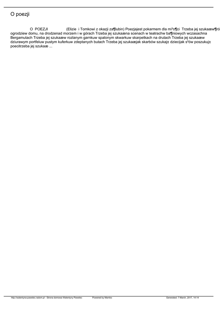 O poezji O POEZJI (Elizie i Tomkowi z okazji za¶lubin) Poezjajest pokarmem dla mi³o¶ci Trzeba jej szukaæw¶ród ogrodziew domu, na drodzenad morzem i w górach Trzeba jej szukaæna scenach w teatrachw ba¶niowych wczasachna Bergamutach Trzeba jej szukaæw rozlanym garnkuw spalonym skwarkuw skarpetkach na drutach Trzeba jej szukaæw dziurawym portfeluw pustym kuferkuw zdeptanych butach Trzeba jej szukaæjak skarbów szukaj± dziecijak s³ów poszukuj± poecitrzeba jej szukaæ ... http://walentyna-pawelec.radom.pl - Strona domowa Walentyny Pawelec Powered by Mambo Generated: 7 March, 2017, 14:14