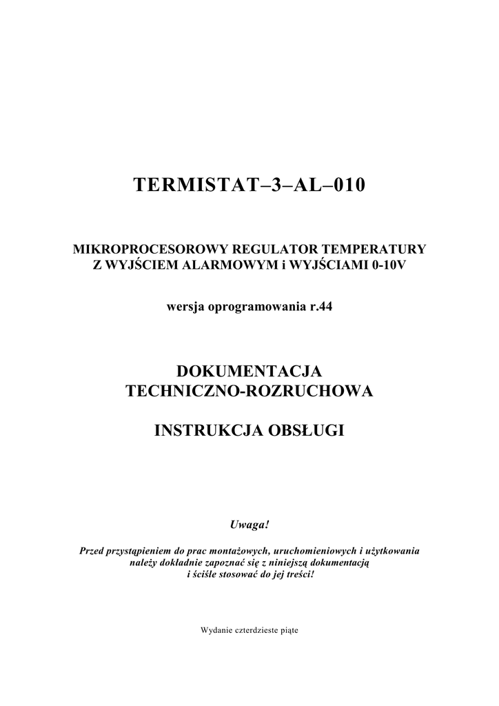TERMISTAT–3–AL–010 MIKROPROCESOROWY REGULATOR TEMPERATURY Z WYJŚCIEM ALARMOWYM i WYJŚCIAMI 0-10V wersja oprogramowania r.44 DOKUMENTACJA TECHNICZNO-ROZRUCHOWA INSTRUKCJA OBSŁUGI Uwaga! Przed przystąpieniem do prac montażowych, uruchomieniowych i użytkowania należy dokładnie zapoznać się z niniejszą dokumentacją i ściśle stosować do jej treści! Wydanie czterdzieste piąte Instalacja elektryczna, do której jest dołączone urządzenie MUSI POSIADAĆ zgodne z aktualnymi przepisami, sprawne technicznie obwody ochrony przeciwporażeniowej. Musi posiadać także przynajmniej drugi stopień ochrony przeciwprzepięciowej. Urządzenie jest przeznaczone do pracy ciągłej i nie posiada wyłącznika zasilania. Jeżeli zachodzi potrzeba wyłączania urządzenia, należy zainstalować wyłącznik zewnętrzny. UWAGA !!! Wszelkie prace związanie z montażem i uruchomieniem urządzenia powinna wykonywać osoba posiadająca odpowiednie kwalifikacje i uprawnienia. Jakiekolwiek elektryczne czynności łączeniowe oraz prace mechaniczne (elektromechaniczne) przy urządzeniu Z DOŁĄCZONYM ZASILANIEM SĄ NIEDOPUSZCZALNE. GROŻĄ PORAŻENIEM PRĄDEM ELEKTRYCZNYM – ZAGROŻENIEM ZDROWIA LUB ŻYCIA Przed przystąpieniem do prac wyłączyć napięcie zasilania, wykonać widoczną przerwę w obwodzie elektrycznym zasilania urządzenia i upewnić się o braku napięcia. Instalacja elektryczna, do okresowych przeglądów i badań! której jest dołączone urządzenie wymaga Spis treści 1. ZASTOSOWANIE REGULATORA ...............................................................................5 2. WSKAZÓWKI BEZPIECZEŃSTWA.............................................................................5 3. TRANSPORT, MAGAZYNOWANIE.............................................................................6 4. DANE TECHNICZNE I WYMAGANIA SPRZĘTOWE..............................................6 5. MONTAŻ I DOŁĄCZENIE REGULATORA DO INSTALACJI ELEKTRYCZNEJ7 6. PRZED PIERWSZYM URUCHOMIENIEM ................................................................9 7. FUNKCJE MIKROPRZEŁĄCZNIKÓW .......................................................................9 8. PRZYGOTOWANIE REGULATORA DO PRACY ...................................................10 9. OBSŁUGA REGULATORA ..........................................................................................11 9.1. ZAŁĄCZENIE ZASILANIA ..........................................................................................11 9.2. PODSTAWOWE FUNKCJE WYŚWIETLACZA I KLAWIATURY.......................12 9.3. ZMIANA TEMPERATURY ZADANEJ.......................................................................12 9.4. ZAŁĄCZENIE I WYŁĄCZENIE PROCESU REGULACJI TEMPERATURY. ....12 9.5. PODGLĄD BIEŻĄCEGO POZIOMU REGULACJI. ................................................13 9.6. UZYSKIWANIE DOSTĘPU DO NASTAW POZIOMU SET I CAL........................13 9.7. SPOSÓB ZMIANY NASTAW........................................................................................13 10. NASTAWY REGULATORA..........................................................................................14 11. PODGLĄD BIEŻĄCEGO STANU REGULATORA ..................................................18 12. STABILIZACJA TEMPERATURY - ALGORYTM REGULACJI PROSTY I ZAAWANSOWANY .......................................................................................................18 13. WYJŚCIA ANALOGOWE 0-10V..................................................................................21 14. FUNKCJE SPECJALNE REGULATORA...................................................................21 14.1. FUNKCJA PRZEWIETRZANIA (DOGRZEWANIA) ...............................................21 14.2. PRZEDZIAŁ ZABRONIONY ........................................................................................22 15. KOMUNIKATY ALARMOWE.....................................................................................23 16. GWARANCJA .................................................................................................................25 17. ZASADY SERWISOWANIA URZĄDZEŃ SYSTEMU STEROWANIA MIKROKLIMATEM ORAZ ICH INSTALACJI ELEKTRYCZNEJ. .....................26 Mikroprocesorowy Regulator Temperatury TERMISTAT–3–AL-010 1. Zastosowanie regulatora Regulator TERMISTAT–3–AL–010 jest urządzeniem elektronicznym służącym do utrzymywania temperatury w pomieszczeniu na stałym, zadanym poziomie poprzez płynną regulację mocy (łącznikiem półprzewodnikowym) urządzenia schładzającego (np. wentylatora z jednofazowym silnikiem indukcyjnym) albo nagrzewającego (elektrycznego promiennika podczerwieni). Wyposażony jest w moduł umożliwiający konwersję sterowania na dwa napięcia analogowe 0..10V, dzięki czemu istnieje możliwość dołączenia do regulatora urządzeń i modułów peryferyjnych (takich jak regulatory płynne obrotów, moduły serwomotorów okien uchylnych, kalenic, falowniki) sterowanych napięciem analogowym. Tryb pracy (schładzanie albo nagrzewanie) oraz inne, krytyczne parametry regulacji są ustawiane za pomocą ośmiu mikroprzełączników umieszczonych wewnątrz obudowy regulatora. Pozostałe parametry (nastawy) są przechowywane w pamięci regulatora, ich doboru dokonuje się z klawiatury podczas pracy urządzenia. Pomiar temperatury odbywa się za pomocą cyfrowego czujnika połączonego z regulatorem czterożyłowym, ekranowanym kablem. Istnieje możliwość zainstalowania do czterech czujników temperatury, przy czym jeden z nich może mierzyć temperaturę na zewnątrz obiektu. Komunikacja pomiędzy regulatorem i czujnikiem jest dwukierunkowa, co zapewnia ciągłą kontrolę poprawności jego pracy. Jeden czujnik jest dostarczany wraz z regulatorem (bez kabla dołączeniowego). Maksymalna długość kabla wynosi 100 metrów. Przy długości większej niż 2 metry konieczne jest zastosowanie kabla ekranowanego, którego ekran jest połączony z 