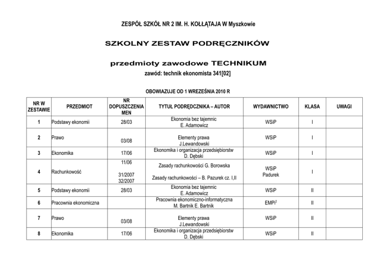 ZESPÓŁ SZKÓŁ NR 2 IM. H. KOŁŁĄTAJA W Myszkowie SZKOLNY ZESTAW PODRĘCZNIKÓW przedmioty zawodowe TECHNIKUM zawód: technik ekonomista 341[02] OBOWIAZUJE OD 1 WREZEŚNIA 2010 R NR W ZESTAWIE PRZEDMIOT 1 Podstawy ekonomii 2 Prawo 3 Ekonomika NR DOPUSZCZENIA MEN TYTUŁ PODRĘDCZNIKA – AUTOR WYDAWNICTWO KLASA 28/03 Ekonomia bez tajemnic E. Adamowicz WSiP I WSiP I WSiP I WSiP Padurek I WSiP II EMPi2 II WSiP II WSiP II 03/08 17/06 11/06 4 Rachunkowość 5 Podstawy ekonomii 6 Pracownia ekonomiczna 7 Prawo 8 Ekonomika 31/2007 32/2007 28/03 03/08 17/06 Elementy prawa J.Lewandowski Ekonomika i organizacja przedsiębiorstw D. Dębski Zasady rachunkowości G. Borowska Zasady rachunkowości – B. Pazurek cz. I,II Ekonomia bez tajemnic E. Adamowicz Pracownia ekonomiczno-informatyczna M. Bartnik E. Bartnik Elementy prawa J.Lewandowski Ekonomika i organizacja przedsiębiorstw D. Dębski UWAGI 9 Rachunkowość 10 Przedmiot specjalizacyjny 11 Prawo 12 Ekonomika 13 Rachunkowość 14 Pracownia ekonomiczna 15 Przedmiot specjalizacyjny 16 Ekonomika przedsiębiorstw 17 Rachunkowość przedsiębiorstw 15/02 05/06 30/2007 33/2007 03/08 31/06 05/06 15/02 30/2007 33/2007 24/06 31/06 05/06 15/02 30/2007 33/2007 ,,Rachunkowość Przedsiębiorstw" Zb .Kołaczyk ,, Rachunkowość przedsiębiorstw" J.Frymark „Rachunkowość przedsiębiorstw” – B. Pazurek cz.I,II EMPi2 WSiP Padurek II Bankowość i finanse – Z. Mielczarczyk WSiP II Elementy prawa J.Lewandowski Ekonomika i organizacja przedsiębiorstw Cz. 2 D.Dębski ,,Rachunkowość przedsiębiorstw" J. Frymark ,,Rachunkowość Przedsiębiorstw" Zb .Kołaczyk WSiP III WSiP III WSiP EMPi2 Padurek III EMPi2 III Difin WSiP III WSiP IV WSiP EMPi2 Padurek IV „Rachunkowość przedsiębiorstw” – B. Pazurek cz.I,II Pracownia ekonomiczno-informatyczna M. Bartnik E. Bartnik Reklama R. Nowacki Bankowość i finanse – Z. Mielczarczyk Ekonomika organizacja przedsiębiorstw Cz. II D. Dębski ,,Rachunkowość przedsiębiorstw" J. Frymark ,,Rachunkowość Przedsiębiorstw" Zb .Kołaczyk „Rachunkowość przedsiębiorstw” – B. Pazurek cz.I,II 18 Język angielski zawodowy - Brak podręcznika - IV 19 Język niemiecki zawodowy - Brak podręcznika - IV 20 Kultura zawodu Ekonomik IV 21 Pracownia ekonomicznoinformatyczna EMPi2 IV 22 Przedmiot specjalizacyjny Difin WSiP IV 14/03 24/06 A.Komosa Kultura Zawodu Pracownia ekonomiczno-informatyczna M. Bartnik E. Bartnik Reklama R. Nowacki Bankowość i finanse – Z. Mielczarczyk