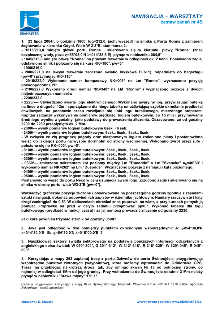 NAWIGACJA – WARSZTATY zestaw zadań nr 4B 1. 23 lipca 2004r. o godzinie 1800, log=212,0, jacht wyszedł na silniku z Portu Ronne z zamiarem żeglowania w kierunku Gdyni. Wiatr W 2-3°B, stan morza 2. - 1815/213,0 minięto główki portu Ronne i skierowano się w kierunku pławy "Ronne" (znak bezpiecznej wody, poz.: ϕ=55°05,0'N λ=014°38,5'E) płynąc w nabieżniku 064,5° - 1845/215,0 minięto pławę "Ronne" na prawym trawersie w odległości ok. 2 kabli. Postawiono żagle, odstawiono silnik i położono się na kurs KK=180°, pw=5° - 1900/216,0 - 2000/221,0 na lewym trawersie zaoczono światło błyskowe Fl(6+1), odpadnięto do bagsztagu (pw=0°) przyjmując KK=110° - 2015/222,0 Wykonano namiar kompasowy NK=006° na Lm "Ronne", wyznaczono pozycję prawdopodobną PP - 2100/227,0 Wykonano drugi namiar NK=340° na LM "Ronne" i wyznaczono pozycję z dwóch niejednoczesnych namiarów - 2200/232,0 - 2220/---- Stwierdzono awarię logu elektronicznego. Wykonano awaryjny log, przywiązując butelkę na lince o długości 12m i sporządzono dla niego tabelkę umożliwiającą szybkie określanie prędkości chwilowych, na podstawie czasu rozwijania się linki logu butelkowego, mierzonego stoperem. Kapitan zarządził wykonywanie pomiarów prędkości logiem butelkowym, co 15 min i przyjmowanie średniego wyniku z godziny, jako podstawy do prowadzenia zliczenia. Oszacowano, że od godziny 2200 do 2230 przepłynięto ok. 2 Mm. - 2300/--- wynik pomiarów logiem butelkowym 6sek. i 6 sek. - 2400/--- wynik pomiarów logiem butelkowym: 6sek., 6sek., 8sek., 8sek. - W związku ze złą prognozą pogody oraz niesprawnym logiem zmieniono plany i postanowiono wejść do jakiegoś portu na wyspie Bornholm od strony wschodniej. Wykonano zwrot przez rufę i położono się na KK=000°, pw=5°. - 0100/--- wyniki pomiarów logiem butelkowym: 8sek., 8sek., 8sek., 8sek. - 0200/--- wyniki pomiarów logiem butelkowym: 8sek., 8sek., 8sek., 8sek. - 0300/--- wyniki pomiarów logiem butelkowym: 8sek., 8sek., 8sek., 8sek. - 0330/--- zmierzono sekstantem kąt poziomy między Lm "Dueodde" a Lm "Svaneke" αh=46°30' i wykonano namiar NK=262° na Lm "Dueodde". Wyznaczono pozycję z namiaru i kąta poziomego. - 0400/--- wyniki pomiarów logiem butelkowym: 8sek., 8sek., 8sek., 8sek. - 0500/--- wyniki pomiarów logiem butelkowym: 8sek., 8sek., 8sek., 8sek. Postanowiono wejść do portu Nexo w celu usunięcia awarii logu. Zrzucono żagle i skierowano się na silniku w stronę portu, wiatr W3-2°B (pw=0°). Wyznaczyć graficznie pozycje zliczone i obserwowane na poszczególne godziny zgodnie z zasadami sztuki nawigacji, dokonać odpowiednich zapisów w dzienniku jachtowym. Namiary rzeczywiste i kąty drogi zaokrąglać do 0,5°. W obliczeniach określać znak poprawki na wiatr, a przy kursach pełnych ją pomijać. Poprawkę na prąd w całym zadaniu przyjmować pp=0°. Wykonać tabelkę dla logu butelkowego (prędkość w funkcji czasu) i za jej pomocą prowadzić zliczenie od godziny 2230. Jaki kurs powinien trzymać sternik od godziny 0500? 2. Jaka jest odległość w Mm pomiędzy punktami określonymi współrzędnymi: A: ϕ=54°30,0'N λ=014°30,0'E B: ϕ=54°30,0'N λ=015°00,0'E ? 3. Naszkicować sektory światła sektorowego na podstawie poniższych informacji odczytanych z angielskiego spisu świateł: W 090°-301°, G 301°-312°, W 312°-318°, R 318°-329°, W 329°-045°, R 045°090° 4. Korzystając z mapy 252 zaplanuj trasę z portu Dziwnów do portu Świnoujście, przygotowując współrzędne punktów zwrotnych (waypointów), które możemy wprowadzić do Odbiornika GPS. Trasa ma przebiegać najkrótszą drogą, tak, aby ominąć akwen Nr 13 od północnej strony, co najmniej w odległości 1Mm od jego granicy. Przy wchodzeniu do Świnoujścia ostatnie 3 Mm należy płynąć w nabieżniku "Stawa młyny" 170,1°. (zadania przygotowano korzystając z mapy Biura Hydrograficznego Marynarki Wojennej RP nr 252 INT 1219 Bałtyk Wybrzeże Południowe – część zachodnia) opracował: D. Kluczka wydrukowano z serwisu www.SEAMASTER.pl