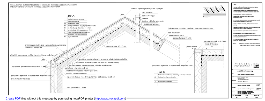 UWAGA: ŚWIETLIK ZAMOCOWAĆ I USZCZELNIĆ KOŁNIERZEM ZGODNIE Z ZALECENIAMI PRODUCENTA PRZEBICIA W DACHU WYKOŃCZYĆ ZGODNIE Z ZALECENIAMI PRODUCENTA kalenica z podwójnymi rąbkami kątowymi uszczelnienie 4.49 opaska mocująca min 15 cm DK-S blacha tytanowo-cynkowa mata strukturalna 4.23 2.5 deskowanie pełne 10 izolacja termiczna- płyty styropianowe FS 15 11 podkonstrukcja drewniana 11 x 3 cm 5 termoizolacja-płyty styropianowe FS 15 5 podkonstrukcja drewniana 5 x 3 cm okapnik kołnierz z blachy tytan cynk połączenie lutowane kołnierz uszczelniający zgodnie z zaleceniami producenta blok drewniany szlamowa zaprawa izolacyjna 15 kątownik mocujący 40 płyta żelbetowa okno połaciowe 78 x 98 blacha tytan cynk gr. 0.7 mm 40 drabinka przeciwśnieżna- rurka stalowa ocynkowana mocowana do rąbków mata strukuralna łaty drewniane 3.5 x 5 cm 60 4 rzędna zmienna 40 m płyty OSB konstrukcja pod koryto odwodnienia gr. 2.2 cm in 25 c m 40 3 3.16 w miejscu montażu barierki wzmocnic rąbek dodatkową haftką m 0c 4 n1 mi mocowanie na haftki płaskie lub poprzez owalne otwory 3 10,5 "wychylenie" pasa nadrynnowego min 25 mm3.03 15,4 40 pas nadrynnowy na usztywnieniu z blachy ocynkowanej połączenie płyty OSB ze styropianem wzmocnić siatką ocieplenie- styrodur gr. 5 cm koryto odwodniające z blachy tytan cynk EW-b obróbka koryta rynnowego połączenie płyty OSB ze styropianem wzmocnić siatką kątownik stalowy- konstrukcja koryta z OSB rozstaw co 35 cm tynk cienkowarstwowy mineralny- barwiony w masie 20 izolacja termiczna- styropian 15 konstrukcja żelbetowa tynk mineralny na siatce detale dachu rura spustowa ∅ 7.5 cm 23.06.2011 Create PDF files without this message by purchasing novaPDF printer (http://www.novapdf.com) 1:5 DET.2