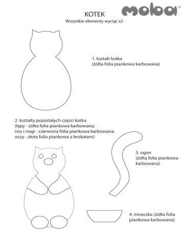 KOTEK Wszystkie elementy wyciąć x2 1. kształt kotka (żółta folia piankowa karbowana) 2. kształty pozostałych części kotka (łapy - żółta folia piankowa karbowana; nos i nogi - czerwona folia piankowa karbowana; oczy - złota folia piankowa z brokatem) 3. ogon (żółta folia piankowa karbowana) 4. miseczka (żółta folia piankowa karbowana)