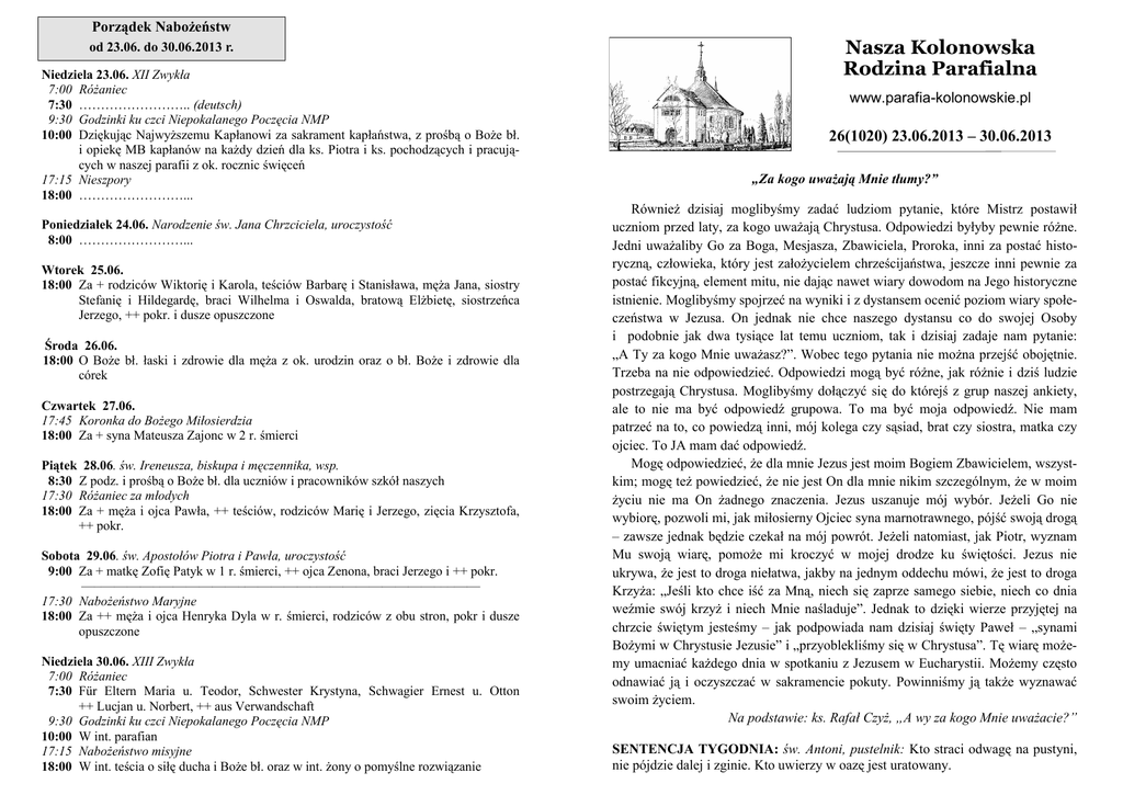 Porządek Nabożeństw od 23.06. do 30.06.2013 r. Niedziela 23.06. XII Zwykła 7:00 Różaniec 7:30 …………………….. (deutsch) 9:30 Godzinki ku czci Niepokalanego Poczęcia NMP 10:00 Dziękując Najwyższemu Kapłanowi za sakrament kapłaństwa, z prośbą o Boże bł. i opiekę MB kapłanów na każdy dzień dla ks. Piotra i ks. pochodzących i pracujących w naszej parafii z ok. rocznic święceń 17:15 Nieszpory 18:00 ……………………... Poniedziałek 24.06. Narodzenie św. Jana Chrzciciela, uroczystość 8:00 ……………………... Wtorek 25.06. 18:00 Za + rodziców Wiktorię i Karola, teściów Barbarę i Stanisława, męża Jana, siostry Stefanię i Hildegardę, braci Wilhelma i Oswalda, bratową Elżbietę, siostrzeńca Jerzego, ++ pokr. i dusze opuszczone Środa 26.06. 18:00 O Boże bł. łaski i zdrowie dla męża z ok. urodzin oraz o bł. Boże i zdrowie dla córek Czwartek 27.06. 17:45 Koronka do Bożego Miłosierdzia 18:00 Za + syna Mateusza Zajonc w 2 r. śmierci Piątek 28.06. św. Ireneusza, biskupa i męczennika, wsp. 8:30 Z podz. i prośbą o Boże bł. dla uczniów i pracowników szkół naszych 17:30 Różaniec za młodych 18:00 Za + męża i ojca Pawła, ++ teściów, rodziców Marię i Jerzego, zięcia Krzysztofa, ++ pokr. Sobota 29.06. św. Apostołów Piotra i Pawła, uroczystość 9:00 Za + matkę Zofię Patyk w 1 r. śmierci, ++ ojca Zenona, braci Jerzego i ++ pokr. —–————–——————–—————–—————————–––—— 17:30 Nabożeństwo Maryjne 18:00 Za ++ męża i ojca Henryka Dyla w r. śmierci, rodziców z obu stron, pokr i dusze opuszczone Niedziela 30.06. XIII Zwykła 7:00 Różaniec 7:30 Für Eltern Maria u. Teodor, Schwester Krystyna, Schwagier Ernest u. Otton ++ Lucjan u. Norbert, ++ aus Verwandschaft 9:30 Godzinki ku czci Niepokalanego Poczęcia NMP 10:00 W int. parafian 17:15 Nabożeństwo misyjne 18:00 W int. teścia o siłę ducha i Boże bł. oraz w int. żony o pomyślne rozwiązanie Nasza Kolonowska Rodzina Parafialna www.parafia-kolonowskie.pl 26(1020) 23.06.2013 – 30.06.2013 „Za kogo uważają Mnie tłumy?” Również dzisiaj moglibyśmy zadać ludziom pytanie, które Mistrz postawił uczniom przed laty, za kogo uważają Chrystusa. Odpowiedzi byłyby pewnie różne. Jedni uważaliby Go za Boga, Mesjasza, Zbawiciela, Proroka, inni za postać historyczną, człowieka, który jest założycielem chrześcijaństwa, jeszcze inni pewnie za postać fikcyjną, element mitu, nie dając nawet wiary dowodom na Jego historyczne istnienie. Moglibyśmy spojrzeć na wyniki i z dystansem ocenić poziom wiary społeczeństwa w Jezusa. On jednak nie chce naszego dystansu co do swojej Osoby i podobnie jak dwa tysiące lat temu uczniom, tak i dzisiaj zadaje nam pytanie: „A Ty za kogo Mnie uważasz?”. Wobec tego pytania nie można przejść obojętnie. Trzeba na nie odpowiedzieć. Odpowiedzi mogą być różne, jak różnie i dziś ludzie postrzegają Chrystusa. Moglibyśmy dołączyć się do którejś z grup naszej ankiety, ale to nie ma być odpowiedź grupowa. To ma być moja odpowiedź. Nie mam patrzeć na to, co powiedzą inni, mój kolega czy sąsiad, brat czy siostra, matka czy ojciec. To JA mam dać odpowiedź. Mogę odpowiedzieć, że dla mnie Jezus jest moim Bogiem Zbawicielem, wszystkim; mogę też powiedzieć, że nie jest On dla mnie nikim szczególnym, że w moim życiu nie ma On żadnego znaczenia. Jezus uszanuje mój wybór. Jeżeli Go nie wybiorę, pozwoli mi, jak miłosierny Ojciec syna marnotrawnego, pójść swoją drogą – zawsze jednak będzie czekał na mój powrót. Jeżeli natomiast, jak Piotr, wyznam Mu swoją wiarę, pomoże mi kroczyć w mojej drodze ku świętości. Jezus nie ukrywa, że jest to droga niełatwa, jakby na jednym oddechu mówi, że jest to droga Krzyża: „Jeśli kto chce iść za Mną, niech się zaprze samego siebie, niech co dnia weźmie swój krzyż i niech Mnie naśladuje”. Jednak to dzięki wierze przyjętej na chrzcie świętym jesteśmy – jak podpowiada nam dzisiaj święty Paweł – „synami Bożymi w Chrystusie Jezusie” i „przyoblekliśmy się w Chrystusa”. Tę wiarę możemy umacniać każdego dnia w spotkaniu z Jezusem w Eucharystii. Możemy często odnawiać ją i oczyszczać w sakramencie pokuty. Powinniśmy ją także wyznawać swoim życiem. Na podstawie: ks. Rafał Czyż, „A wy za kogo Mnie uważacie?” SENTENCJA TYGODNIA: św. Antoni, pustelnik: Kto straci odwagę na pustyni, nie pójdzie dalej i zginie. Kto uwierzy w oazę jest uratowany. 26/2013 O dwóch miastach: Pewien wędrowiec, zbliżając się do wielkiego miasta, napotkał kobietę, która siedziała na skraju drogi. Jacy ludzie zamieszkują ten gród? – zapytał. A jacy mieszkali tam, skąd przybywasz? Okropni – odparł. Skąpi, niegodni zaufania, wstrętni pod każdym względem. Ach – rzekła kobieta, takich znajdziesz i w tym miejscu Kiedy tylko pierwszy podróżnik zniknął za horyzontem, kolejny się pojawił i spytał o mieszkańców pobliskiego miasta. Staruszka i tym razem chciała się dowiedzieć, jakich ludzi opuścił. Wspaniałych – odpowiedział drugi wędrowiec. Uczciwych, pracowitych i nad wymiar hojnych. Z prawdziwymi żalem się z nimi rozstawałem. Takich znajdziesz i w tym miejscu - powiedziała mądra kobieta. —–————–——————–—————–—————————–––——–————— Kamień: Pewna mądra kobieta, podczas wędrówki po górach, znalazła w strumieniu cenny kamień. Następnego dnia napotkała podróżnika, który był bardzo głodny. Mądra kobieta otworzyła wtedy torbę i podzieliła się z nim swoim jedzeniem. Głodny człowiek dostrzegł drogocenny kamień w jej tobołku, zachwycił się nim, po czym zwrócił się do niej z prośbą, by mu go po-darowała. Mądra kobieta zrobiła, jak prosił, bez chwili zwłoki. Podróżnik odszedł, radując się s