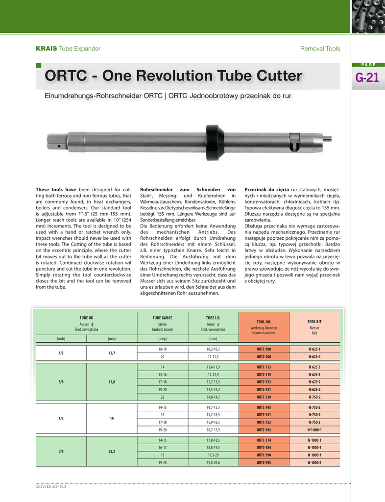 KRAIS Tube Expander Removal Tools PAG E ORTC - One Revolution Tube Cutter G-21 Einumdrehungs-Rohrschneider ORTC | ORTC Jednoobrotowy przecinak do rur These tools have been designed for cutting both ferrous and non-ferrous tubes, that are commonly found, in heat exchangers, boilers and condensers. Our standard tool is adjustable from 1”-6” (25 mm-155 mm). Longer reach tools are available in 10” (254 mm) increments. The tool is designed to be used with a hand or ratchet wrench only. Impact wrenches should never be used with these tools. The Cutting of the tube is based on the eccentric principle, where the cutter bit moves out to the tube wall as the cutter is rotated. Continued clockwise rotation wil puncture and cut the tube in one revolution. Simply rotating the tool counterclockwise closes the bit and the tool can be removed from the tube. TUBE OD Aussen ф Śred. zewnętrzna [inch] [mm] 1/2 12,7 5/8 3/4 7/8 CAT.VER:05-013 15,8 19 22,2 Rohrschneider zum Schneiden von Stahl-, Messing- und Kupferrohren in Wärmeaustauschern, Kondensatoren, Kühlern, Kesselnu.s.w.DietypischewirksameSchneidelänge beträgt 155 mm. Längere Werkzeuge sind auf Sonderbestellung erreichbar. Die Bedienung erfordert keine Anwendung des mechanischen Antriebs. Das Rohrschneiden erfolgt durch Umdrehung des Rohrschneiders mit einem Schlüssel, z.B. einer typischen Knarre. Sehr leicht in Bedienung. Die Ausführung mit dem Werkzeug einer Umderhung links ermöglicht das Rohrschneiden, die nächste Ausführung einer Umdrehung rechts verursacht, dass das Messer sich aus seinem Sitz zurückzieht und uns es erlauben wird, den Schneider aus dem abgeschnittenen Rohr auszunehmen. TUBE GAUGE Stärke Grubość ścianki TUBE I.D. Innen ф Śred. wewnętrzna [bwg] [mm] 18-19 20 Przecinak do cięcia rur stalowych, mosiężnych i miedzianych w wymiennikach ciepła, kondensatorach, chłodnicach, kotłach itp. Typowa efektywna długość cięcia to 155 mm. Dłuższe narzędzia dostępne są na specjalne zamówienia. Obsługa przecinaka nie wymaga zastosowania napędu mechanicznego. Przecinanie rur następuje poprzez pokręcanie nim za pomocą klucza, np. typowej grzechotki. Bardzo łatwy w obsłudze. Wykonanie narzędziem jednego obrotu w lewo pozwala na przecięcie rury, następne wykonywanie obrotu w prawo spowoduje, że nóż wycofa się do swojego gniazda i pozwoli nam wyjąć przecinak z obciętej rury. TOOL NO. Werkzeug-Nummer Numer narzędzia TOOL BIT Messer Nóż 10,2-10,7 ORTC-100 N-625-1 11-11,3 ORTC-108 N-625-4 14 11,4-11,9 ORTC-113 N-625-3 15-16 12-12,9 ORTC-119 N-625-3 17-18 12,7-13,5 ORTC-123 N-625-2 19-20 13,5-14,2 ORTC-131 N-625-2 22 14,0-14,7 ORTC-139 N-750-2 14-15 14,7-15,5 ORTC-145 N-750-2 16 15,2-16,5 ORTC-151 N-750-2 17-18 15,9-16,5 ORTC-153 N-750-2 19-20 16,7-17,5 ORTC-163 N-1 000-1 14-15 17,8-18,5 ORTC-174 N-1000-1 16-17 18,8-19,5 ORTC-184 N-1000-1 18 19,3-20 ORTC-190 N-1000-1 19-20 19,8-20,6 ORTC-193 N-1000-2 Removal Tools PAG E KRAIS Tube Expander TUBE OD Aussen ф Śred. zewnętrzna G-22 [inch] 1 1-1/4 1-1/2 1-3/4 2 2-1/4 2-1/2 [mm] 25,4 31,7 38,1 44,45 50,8 57,15 63,5 TUBE GAUGE Stärke Grubość ścianki TUBE I.D. Innen ф Śred. wewnętrzna [bwg] [mm] 12 14 TOOL NO. Werkzeug-Nummer Numer narzędzia TOOL BIT Messer Nóż 19,8-20,6 ORTC-193 N-1000-2 20,8-21,6 ORTC-205 N-1000-2 15 21,3-22,1 ORTC-210 N-1000-2 16-17 21,8-22,6 ORTC-215 N-1000-2 18-20 22,6-23,1 ORTC-223 N-1000-2 22 23,9-24,6 ORTC-232 N-1000-2 10-11 24,9-25,6 ORTC-245 N-1000-2 12 25,9-26,7 ORTC-255 N-1000-2 13-14 26,7-27,4 ORTC-264 N-1000-2 15-16 27,9-28,7 ORTC-274 N-1000-2 17-19 28,7-29,6 ORTC-283 N-1000-2 10-11 31,3-32,1 ORTC-309 N-1500-1 12-13 32,5-33,3 ORTC-320 N-1500-1 14-15 33,8-34,5 ORTC-333 N-1500-1 16-17 34,5-35,3 ORTC-339 N-1500-1 18-19 35,3-36,1 ORTC-350 N-1500-1 10-11 37,0-38,5 ORTC-369 N-1500-1 12-14 38,8^0,3 ORTC-383 N-1500-1 15-16 40,8-41,2 ORTC-403 N-1500-1 17-18 41,3-42,0 ORTC-410 N-1500-1 10 44.0 ORTC-435 N-1500-1 11 44,7 ORTC-442 N-1500-1 12-13 45,0-46,0 ORTC-447 N-1500-1 14-15 46,2-48,2 ORTC-457 N-1500-1 16-17 47,2-48,2 ORTC-468 N-1500-1 18-19 48,0-49,0 ORTC-476 N-1500-1 10 50,3 ORTC-497 N-2250-1 11 51.0 ORTC-505 N-2250-1 12-13 51,6-52,3 ORTC-511 N-2250-1 14-15 52,9-53,5 ORTC-524 N-2250-1 16-17 53,8-54,8 ORTC-533 N-2250-1 18-19 54,6-55,6 ORTC-541 N-2250-1 10 56,7 ORTC-562 N-2250-1 11 57,4 ORTC-569 N-2250-1 12-13 57,6-58,6 ORTC-572 N-2250-1 14-15 58,9-60 ORTC-585 N-2250-1 16-17 60-61 ORTC-586 N-2250-1 18-19 60,7-61,7 ORTC-602 N-2250-1 CAT.VER:05-013