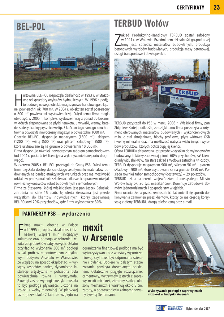 CERTYFIKATY TERBUD Wołów BEL-POL Z akład Produkcyjno-Handlowy TERBUD został założony w 1991 r. w Wołowie. Przedmiotem działalności gospodarczej firmy jest: sprzedaż materiałów budowlanych, produkcja betonowych wyrobów budowlanych, produkcja masy betonowej, usługi transportowe i developerskie. H urtownia BEL-POL rozpoczęła działalność w 1993 r. w Staszowie od sprzedaży artykułów hydraulicznych. W 1996 r. podjęto budowę nowego obiektu magazynowo-handlowego o łącznej powierzchni ok. 700 m². W 2004 r. obiekt ten został poszerzony o 800 m² powierzchni wystawienniczej. Dzięki temu firma mogła otworzyć, w 2005 r., kompleks wystawienniczy z ponad 50 boxami, w których eksponowane są płytki, terakota, umywalki, wanny, baterie, sedesy, kabiny prysznicowe itp. Z końcem tego samego roku hurtownia otworzyła nowoczesny magazyn o powierzchni 1000 m². Obecnie BEL-POL dysponuje magazynem (1800 m²), sklepem (1200 m²), wiatą (500 m²) oraz placem składowym (500 m²), które usytuowane są na gruncie o powierzchni 10 000 m². Firma dysponuje również nowoczesnym taborem samochodowym (od 2004 r. posiada też licencję na wykonywanie transportu drogowego). W czerwcu 2005 r. BEL-POL przystąpił do Grupy PSB. Dzięki temu firma uzyskała dostęp do szerokiego asortymentu materiałów budowlanych na bardzo atrakcyjnych warunkach oraz ma możliwość udziału w profesjonalnych szkoleniach dla swoich pracowników jak również wykonawców robót budowlanych i remontowych. Firma ze Staszowa, której właścicielem jest pan Leszek Belusiak, zatrudnia na stałe 15 osób. Jej oferta kierowana jest przede wszystkim do klientów indywidualnych, którzy zapewniają BEL-POLowi 70% przychodów, gdy firmy wykonawcze 30%. TERBUD przystąpił do PSB w marcu 2006 r. Właściciel firmy, pan Zbigniew Kadej, podkreśla, że dzięki temu firma poszerzyła asortyment oferowanych materiałów budowlanych i wykończeniowych m.in. o stal zbrojeniową, blachy profilowe, płyty wiórowe OSB i wełnę mineralna oraz ma możliwość nabycia wielu innych wyrobów produktów, których potrzebują jej klienci. Oferta TERBUDu skierowana jest przede wszystkim do wykonawców budowlanych, którzy zapewniają firmie 60% przychodów, zaś klienci indywidualni 40%. Na stałe zakład z Wołowa zatrudnia 44 osoby. TERBUD dysponuje magazynem 900 m², sklepem 50 m² i placem składowym 900 m², które usytuowane są na gruncie 1850 m². Posiada również tabor samochodowy (dostawczy) – 29 pojazdów. TERBUD działa na terenie województwa dolnośląskiego. Miasto Wołów liczy ok. 20 tys. mieszkańców. Dominuje zabudowa domów jednorodzinnych i gospodarstw wiejskich. Firma ocenia, że na przestrzeni ostatnich lat zmienił się sposób dokonywania zamówień przez klientów, którzy co raz częściej korzystają z oferty TERBUDU drogą telefoniczną oraz e-mail. PARTNERZY PSB – w y d a r z e n i a F irma maxit, obecna w Polsce od 1995 r., oprócz działalności biznesowej wspiera m.in. inicjatywy kulturalne oraz pomaga w ochronie i rewitalizacji obiektów zabytkowych. Ostatni przykład to wykonanie 300 m2 podłogi w sali prób w remontowanym zabytkowym budynku Arsenału w Warszawie. Ze względu na sposób eksploatacji – występy zespołów, taniec, dynamiczne instalacje artystyczne – potrzebna była powierzchnia równa i wytrzymała. Z uwagi zaś na wymogi akustyki, musiała to być podłoga pływająca, ułożona na izolacji z wełny mineralnej. W pierwszej fazie (przez około 2 lata, ze względu na maxit w Arsenale ograniczenia finansowe) podłoga ma być wykorzystywana bez warstwy wykończeniowej, czyli musi być odporna na ścieranie i pylenie. Dopiero w dalszym etapie zostanie przykryta drewnianym parkietem. Ostatecznie przyjęto rozwiązanie: cementowy, wytrzymały jastrych z zaprawy maxit mixokret, zbrojony siatką, ułożony mechanicznie warstwą około 5 cm, zatarty, a po wyschnięciu zaimpregnowany żywicą Deitermann. Wykonywanie podłogi z zaprawy maxit mixokret w budynku Arsenału lipiec–sierpień 2007 23