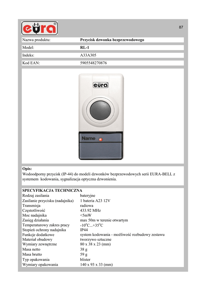 87 Nazwa produktu: Przycisk dzwonka bezprzewodowego Model: RL-1 Indeks: A33A305 Kod EAN: 5905548270876 Opis: Wodoodporny przycisk (IP-44) do modeli dzwonków bezprzewodowych serii EURA-BELL z systemem kodowania, sygnalizacja optyczna dzwonienia. SPECYFIKACJA TECHNICZNA Rodzaj zasilania bateryjne Zasilanie przycisku (nadajnika) 1 bateria A23 12V Transmisja radiowa Częstotliwość 433.92 MHz Moc nadajnika <5mW Zasięg działania max 50m w terenie otwartym Temperaturowy zakres pracy -10oC...+35oC Stopień ochrony nadajnika IP44 system kodowania - możliwość rozbudowy zestawu Funkcje dodatkowe Materiał obudowy tworzywo sztuczne Wymiary zewnętrzne 80 x 38 x 23 (mm) Masa netto 38 g Masa brutto 59 g Typ opakowania blister Wymiary opakowania 140 x 93 x 33 (mm)