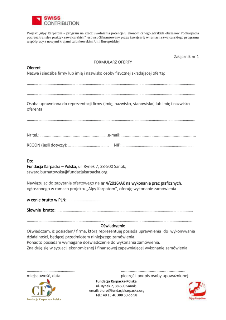 Projekt „Alpy Karpatom – program na rzecz uwolnienia potencjału ekonomicznego górskich obszarów Podkarpacia poprzez transfer praktyk szwajcarskich” jest współfinansowany przez Szwajcarię w ramach szwajcarskiego programu współpracy z nowymi krajami członkowskimi Unii Europejskiej Załącznik nr 1 FORMULARZ OFERTY Oferent Nazwa i siedziba firmy lub imię i nazwisko osoby fizycznej składającej ofertę: ……..…………………………………….……………………………………………………………………….…………….…….……. ……..…………………………………….……………………………………………………………………………….………..………. Osoba uprawniona do reprezentacji firmy (imię, nazwisko, stanowisko) lub imię i nazwisko oferenta: ……..……………………………….……………………….…………………………………………………………………….……….. Nr tel.: ......................................................…….e-mail: ................................................................... REGON (jeśli dotyczy): ……………………….……….. NIP: …………………………………………………………… Do: Fundacja Karpacka – Polska, ul. Rynek 7, 38-500 Sanok, [email protected] Nawiązując do zapytania ofertowego na nr 4/2016/AK na wykonanie prac graficznych, ogłoszonego w ramach projektu „Alpy Karpatom”, oferuję wykonanie zamówienia w cenie brutto w PLN: …………………………… Słownie brutto: ………………….…………………………………………………..…………..………………………………. ……..…………………………………….……………………………………………………...……………………………………….. Oświadczenie Oświadczam, iż posiadam/ firma, którą reprezentuję posiada uprawnienia do wykonywania działalności, będącej przedmiotem niniejszego zamówienia. Ponadto posiadam wymagane doświadczenie do wykonania zamówienia. Znajduję się w sytuacji ekonomicznej i finansowej zapewniającej wykonanie zamówienia. ……………………………………….. miejscowość, data .......................................................... pieczęć i podpis osoby upoważnionej Fundacja Karpacka-Polska ul. Rynek 7, 38-500 Sanok, email: [email protected] Tel.: 48 13 46 388 50 do 58 Fundacja Karpacka - Polska