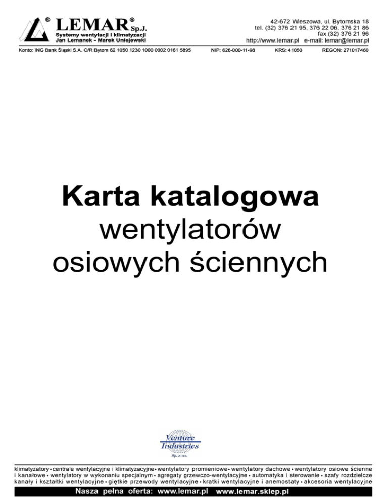 Karta katalogowa wentylatorów osiowych ściennych wentylatory osiowe HIT/HIB - NP Zastosowanie Przetłaczanie dużych ilości powietrza przy małym ciśnieniu i niskim poziomie hałasu. Szczególnie polecane do stosowania w rolnictwie i ogrodnictwie (fermy, suszarnie, szklarnie), a także przemyśle (fabryki, duże warsztaty). Specjalnie do zastosowań w ogrodnictwie i hodowlach dostępna jest wersja z zabudową ograniczającą wnikanie światła dziennego do pomieszczenia przez wentylator. Wentylatory mogą pracować w temperaturze od - 20 oC do +40 oC. Konstrukcja Wentylatory osiowe o dużej wydajności przystosowane do montażu ściennego. Napęd pasowy. Obudowa z galwanizowanej blachy stalowej z siatką ochronną na wlocie. Standardowo wentylator wyposażony jest w automatyczną żaluzję na wylocie (-NP). Na życzenie może być zastąpiona siatką ochronną (-N). Wirnik z galwanizowanej blachy stalowej. Silnik elektryczny Asynchroniczny, trójfazowy 230/400V, 50Hz lub jednofazowy 230V, 50Hz, wykonany zgodnie ze standardem IEC 34-1. Stopień ochrony IP 55. Klasa izolacji F. Silnik posiada termiczne zabezpieczenie przed przeciążeniem. Schemat podłączenia elektrycznego dla HIB: rys. 9a str. 776. Schemat podłączenia elektrycznego dla HIT: rys. 10 str. 776. Dane techniczne typ wentylatora trójfazowy lub jednofazowy maksymalne natężenie prądu (A) 230 V 400 V HIT/HIB-800 NP (0,37) 3 moc silnika [kW] prędkość obrotowa siln. [obr./min] prędkość obrotowa [obr./min] wydajność max. [m3/h] poziom ciśnienia akustycznego [dB(A)] masa 1,8 / 1,1 0,37 2800 575 13500 71 48 [kg] HIT/HIB-800 NP (0,55) 4 2,5 / 1,4 0,55 2800 650 15700 72 48 HIT/HIB-1000 NP (0,37) 3 2,05 / 1,2 0,37 1400 420 16900 63 63 HIT/HIB-1000 NP (0,55) 4,4 2,65 / 1,53 0,55 1400 475 19400 66 64 HIT/HIB-1000 NP (0,75) 5,5 3,5 / 2,0 0,75 1400 490 21200 67 66 HIT/HIB-1250 NP (0,75) 5,5 3,7 / 2,1 0,75 1400 430 30500 64 87 HIT/HIB-1250 NP (1,1) 7,6 4,7 / 2,72 1,1 1400 480 36000 67 90 HIT/HIB-1250 NP (1,5) 10,9 6,3 / 3,66 1,5 1400 535 40700 69 92 Wymiary [mm] Typ O HIT/HIB-800 A B C D OE F G 925 925 427 470 10,5 227 165 HIT/HIB-1000 1125 1125 447 685 10,5 345 205 HIT/HIB-1250 1375 1375 480 560 10,5 283 180 Akcesoria Obudowa ochronna Dodatkowa obudowa zabezpieczająca dostęp do części ruchomych - niezbędna, gdy wentylator jest zamontowany w zasięgu osób przebywających w pomieszczeniu, lub na wysokości poniżej 2,5 m. www.venture.pl 135 wentylatory osiowe HIT/HIB - NP Charakterystyki pracy HIT/HIB-1000 Ciśnienie statyczne Ciśnienie statyczne HIT/HIB-800 Q [m3/h] Q [m3/h] Q [m3/s] Q [m3/s] Wydajność Wydajność Ciśnienie statyczne HIT/HIB-1250 Q [m3/h] Q [m3/s] Wydajność 136 Venture Industries Sp. z o.o. ul. Mokra 27, 05-092 Łomianki - Kiełpin tel. +48 22 751 95 50, 751 20 31 fax +48 22 751 22 59, 751 12 02 e-mail: [email protected]