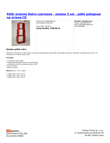 Półki ścienne Retro czerwone - zestaw 3 szt - półki pokojowe na ścianę CD Producent: HomeStyle4u.pl Kod produktu: HSU_581 Cena netto: 193,50 zł Kontakt z Handlowcem: Tel/Fax: (68) 506 50 56 Email: [email protected] GG: 45303488 Cena brutto: 238.00 zł Zestaw półek retro Efektowne i nowoczesne regały. Piękna i praktyczna ozdoba pokoju gościnnego, dziecięcego lub sypialni. Wspaniały i niepowtarzalny prezent. Do zastosowania w sklepie, biurze, domu. Szczegóły: ● ● ● ● ● 3-częściowy zestaw półek zastosowanie jako półki ścienne lub wolnostojące w zestawie akcesoria montażowe (wkręty, kołki) Kolor: czerwony Materiał: drewno Wymiary (wys. x szer. x głęb.): ● ● ● 1 półka: 38,5 x 38,5 x 20 cm 2 półka: 33,5 x 33,5 x 20 cm 3 półka: 28,5 x 28,5 x 20 cm Kod produktu:HSU_581 ID produktu:94962 Granos Group sp. z o.o. ul. Sulechowska 4a budynek 45 65-001 Zielona Góra