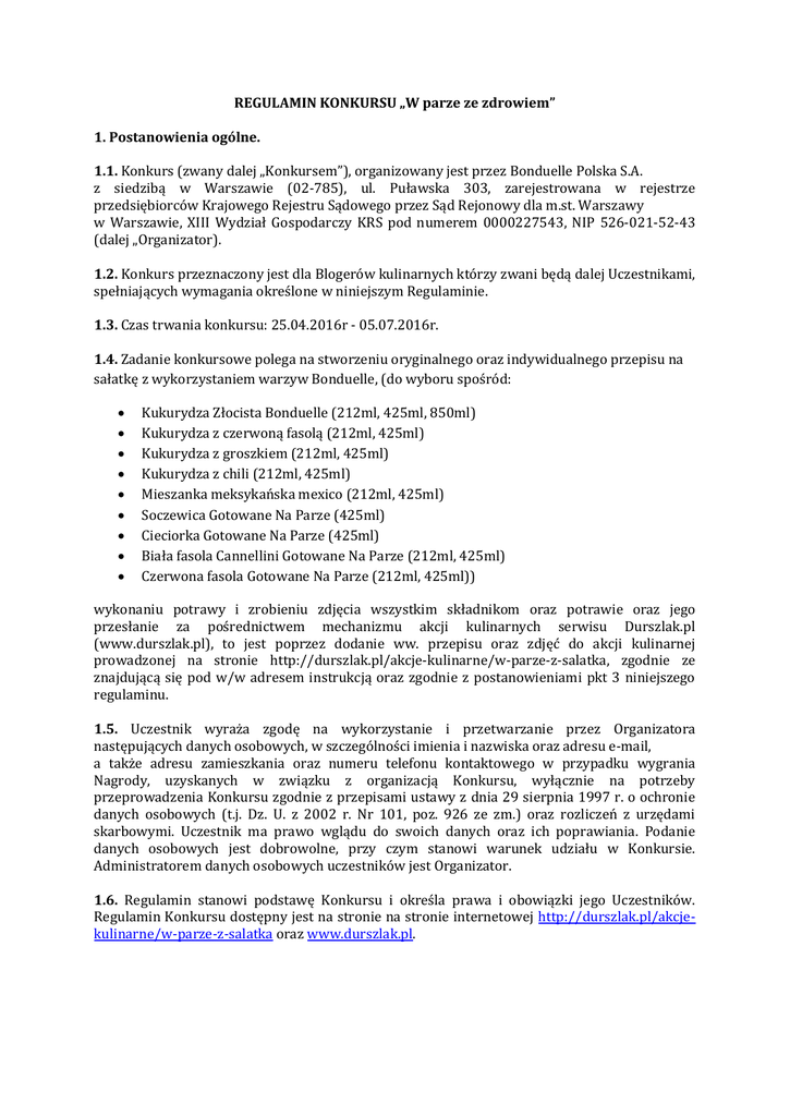 REGULAMIN KONKURSU „W parze ze zdrowiem” 1. Postanowienia ogólne. 1.1. Konkurs (zwany dalej „Konkursem”), organizowany jest przez Bonduelle Polska S.A. z siedzibą w Warszawie (02-785), ul. Puławska 303, zarejestrowana w rejestrze przedsiębiorców Krajowego Rejestru Sądowego przez Sąd Rejonowy dla m.st. Warszawy w Warszawie, XIII Wydział Gospodarczy KRS pod numerem 0000227543, NIP 526-021-52-43 (dalej „Organizator). 1.2. Konkurs przeznaczony jest dla Blogerów kulinarnych którzy zwani będą dalej Uczestnikami, spełniających wymagania określone w niniejszym Regulaminie. 1.3. Czas trwania konkursu: 25.04.2016r - 05.07.2016r. 1.4. Zadanie konkursowe polega na stworzeniu oryginalnego oraz indywidualnego przepisu na sałatkę z wykorzystaniem warzyw Bonduelle, (do wyboru spośród: Kukurydza Złocista Bonduelle (212ml, 425ml, 850ml) Kukurydza z czerwoną fasolą (212ml, 425ml) Kukurydza z groszkiem (212ml, 425ml) Kukurydza z chili (212ml, 425ml) Mieszanka meksykańska mexico (212ml, 425ml) Soczewica Gotowane Na Parze (425ml) Cieciorka Gotowane Na Parze (425ml) Biała fasola Cannellini Gotowane Na Parze (212ml, 425ml) Czerwona fasola Gotowane Na Parze (212ml, 425ml)) wykonaniu potrawy i zrobieniu zdjęcia wszystkim składnikom oraz potrawie oraz jego przesłanie za pośrednictwem mechanizmu akcji kulinarnych serwisu Durszlak.pl (www.durszlak.pl), to jest poprzez dodanie ww. przepisu oraz zdjęć do akcji kulinarnej prowadzonej na stronie http://durszlak.pl/akcje-kulinarne/w-parze-z-salatka, zgodnie ze znajdującą się pod w/w adresem instrukcją oraz zgodnie z postanowieniami pkt 3 niniejszego regulaminu. 1.5. Uczestnik wyraża zgodę na wykorzystanie i przetwarzanie przez Organizatora następujących danych osobowych, w szczególności imienia i nazwiska oraz adresu e-mail, a także adresu zamieszkania oraz numeru telefonu kontaktowego w przypadku wygrania Nagrody, uzyskanych w związku z organizacją Konkursu, wyłącznie na potrzeby przeprowadzenia Konkursu zgodnie z przepisami ustawy z dnia 29 sierpnia 1997 r. o ochronie danych osobowych (t.j. Dz. U. z 2002 r. Nr 101, poz. 926 ze zm.) oraz rozliczeń z urzędami skarbowymi. Uczestnik ma prawo wglądu do swoich danych oraz ich poprawiania. Podanie danych osobowych jest dobrowolne, przy czym stanowi warunek udziału w Konkursie. Administratorem danych osobowych uczestników jest Organizator. 1.6. Regulamin stanowi podstawę Konkursu i określa prawa i obowiązki jego Uczestników. Regulamin Konkursu dostępny jest na stronie na stronie internetowej http://durszlak.pl/akcjekulinarne/w-parze-z-salatka oraz www.durszlak.pl. 2. Uczestnictwo w Konkursie. 2.1. Uczestnictwo w Konkursie jest dobrowolne i nieodpłatne. 2.2. Uczestnikami Konkursu mogą być osoby fizyczne, pełnoletnie, posiadające pełną zdolność do czynności prawnych. W Konkursie nie mogą brać udziału pracownicy, członkowie władz I przedstawiciele Organizatora oraz innych podmiotów biorących bezpośredni udział w przygotowaniu i prowadzeniu Konkursu oraz członkowie ich rodzin. Przez członków rodziny, o których mowa powyżej rozumie się: wstępnych, zstępnych, rodzeństwo, małżonków, rodziców, małżonków i osoby pozostające z nimi w stosunku przysposobienia. 2.3. W Konkursie mogą wziąć udział blogerzy zajmujący się tematyką kulinarną zarejestrowani w serwisie Durszlak.pl. 2.4. Przystąpienie do Konkursu jest równoznaczne z akceptacją przez uczestnika Regulaminu w całości. Uczestnik zobowiązuje się do przestrzegania określonych w nim zasad, jak również potwierdza, iż spełnia wszystkie warunki, które uprawniają go do udziału w Konkursie. 3. Przebieg i warunki udziału w Konkursie. 3.1. Konkurs polega na przygotowaniu i przesłaniu autorskiego przepisu na danie z warzywami Bonduelle, według zasad zamieszczonych na stronie http://durszlak.pl/akcje-kulinarne/wparze-z-salatka. 3.2. Aby zgłosić przepis należy: 3.2.1. przygotować przepis na sałatkę z warzywami Bonduelle (do wyboru spośród: Kukurydza Złocista Bonduelle (212ml, 425ml, 850ml) Kukurydza z czerwoną fasolą (212ml, 425ml) Kukurydza z groszkiem (212ml, 425ml) Kukurydza z chili (212ml, 425ml) Mieszanka meksykańska mexico (212ml, 425ml) Soczewica Gotowane Na Parze (425ml) Cieciorka Gotowane Na Parze (425ml) Biała fasola Cannellini Gotowane Na Parze (212ml, 425ml) Czerwona fasola Gotowane Na Parze (212ml, 425ml)) 3.2.2. wykonać zdjęcie wszystkich składników wykorzystanych w przepisie oraz zdjęcie przygotowanej sałatki. 3.2.3. opublikować przepis wraz ze zdjęciem w formie wpisu na prowadzonym przez Uczestnika blogu. 3.2.4. zgłosić wpis z daniem konkursowym oraz wraz ze stosownymi zdjęciami do Konkursu za pośrednictwem strony www.durszlak.pl oraz http://durszlak.pl/akcjekulinarne/w-parze-z-salatka. 3.2.5. zamieścić we wpisie aktywny link do strony: www.warzywneinspiracje.pl. 3.2.6. w przepisie oraz zdjęciach zgłoszonych do konkursu nie mogą być lokowane produkty innych marek. 3.3. Jeden uczestnik może zgłosić maksymalnie 4 przepisy, z tym ograniczeniem, że jeden Uczestnik może być nagrodzony tylko raz (otrzymać tylko jedną Nagrodę). 3.4. Poprzez zgłoszenie przepisu do Konkursu w sposób wyżej określony, Uczestnik Konkursu oświadcza, że treść i forma każdej z zamieszczonych wypowiedzi konkursowych nie narusza przepisów prawa, ani prawem chronionych dóbr osób trzecich, a uczestnik Konkursu jest w pełni uprawniony do zgłoszenia każdej z wypowiedzi konkursowych. 3.5. Z tytułu złożonego powyżej oświadczenia, Uczestnik przyjmuje na siebie pełną odpowiedzialność prawną. W przypadku jakichkolwiek roszczeń ze strony osób trzecich Uczestnik, po zawiadomieniu go przez Organizatora, nie uchyli się od niezwłocznego przystąpienia do wyjaśnienia sprawy oraz wystąpi przeciwko takim roszczeniom – nie wyłączając wstąpienia do toczącego się postępowania, na własny koszt i ryzyko, a nadto zaspokoi wszelkie u