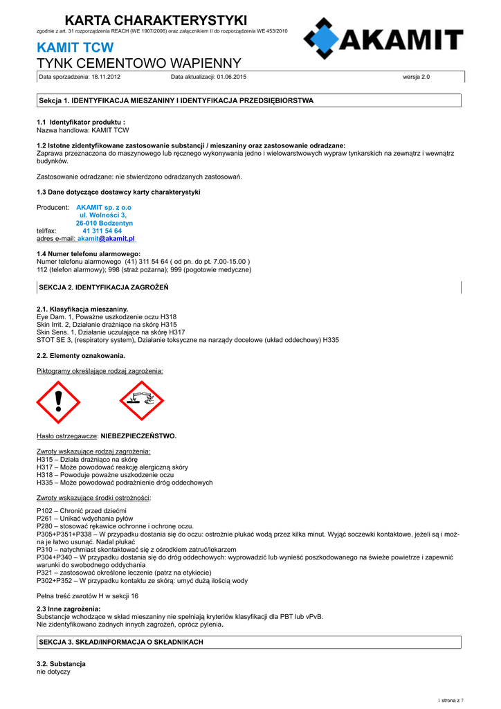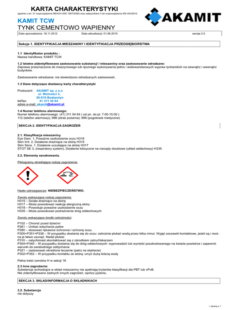 KARTA CHARAKTERYSTYKI zgodnie z art. 31 rozporządzenia REACH (WE 1907/2006) oraz załącznikiem II do rozporządzenia WE 453/2010 KAMIT TCW TYNK CEMENTOWO WAPIENNY Data sporzadzenia: 18.11.2012 Data aktualizacji: 01.06.2015 wersja 2.0 Sekcja 1. IDENTYFIKACJA MIESZANINY I IDENTYFIKACJA PRZEDSIĘBIORSTWA 1.1 Identyfikator produktu : Nazwa handlowa: KAMIT TCW 1.2 Istotne zidentyfikowane zastosowanie substancji / mieszaniny oraz zastosowanie odradzane: Zaprawa przeznaczona do maszynowego lub ręcznego wykonywania jedno i wielowarstwowych wypraw tynkarskich na zewnątrz i wewnątrz budynków. Zastosowanie odradzane: nie stwierdzono odradzanych zastosowań. 1.3 Dane dotyczące dostawcy karty charakterystyki Producent: AKAMIT sp. z o.o ul. Wolności 3, 26-010 Bodzentyn tel/fax: 41 311 54 64 adres e-mail: [email protected] 1.4 Numer telefonu alarmowego: Numer telefonu alarmowego (41) 311 54 64 ( od pn. do pt. 7.00-15.00 ) 112 (telefon alarmowy); 998 (straż pożarna); 999 (pogotowie medyczne) SEKCJA 2. IDENTYFIKACJA ZAGROŻEŃ 2.1. Klasyfikacja mieszaniny. Eye Dam. 1, Poważne uszkodzenie oczu H318 Skin Irrit. 2, Działanie drażniące na skórę H315 Skin Sens. 1, Działanie uczulające na skórę H317 STOT SE 3, (respiratory system), Działanie toksyczne na narządy docelowe (układ oddechowy) H335 2.2. Elementy oznakowania. Piktogramy określające rodzaj zagrożenia: Hasło ostrzegawcze: NIEBEZPIECZEŃSTWO. Zwroty wskazujące rodzaj zagrożenia: H315 – Działa drażniąco na skórę H317 – Może powodować reakcję alergiczną skóry H318 – Powoduje poważne uszkodzenie oczu H335 – Może powodować podrażnienie dróg oddechowych Zwroty wskazujące środki ostrożności: P102 – Chronić przed dziećmi P261 – Unikać wdychania pyłów P280 – stosować rękawice ochronne i ochronę oczu. P305+P351+P338 – W przypadku dostania się do oczu: ostrożnie płukać wodą przez kilka minut. Wyjąć soczewki kontaktowe, jeżeli są i można je łatwo usunąć. Nadal płukać P310 – natychmiast skontaktować się z ośrodkiem zatruć/lekarzem P304+P340 – W przypadku dostania się do dróg oddechowych: wyprowadzić lub wynieść poszkodowanego na świeże powietrze i zapewnić warunki do swobodnego oddychania P321 – zastosować określone leczenie (patrz na etykiecie) P302+P352 – W przypadku kontaktu ze skórą: umyć dużą ilością wody Pełna treść zwrotów H w sekcji 16 2.3 Inne zagrożenia: Substancje wchodzące w skład mieszaniny nie spełniają kryteriów klasyfikacji dla PBT lub vPvB. Nie zidentyfikowano żadnych innych zagrożeń, oprócz pylenia. SEKCJA 3. SKŁAD/INFORMACJA O SKŁADNIKACH 3.2. Substancja nie dotyczy 1 strona z 7 KARTA CHARAKTERYSTYKI zgodnie z art. 31 rozporządzenia REACH (WE 1907/2006) oraz załącznikiem II do rozporządzenia WE 453/2010 KAMIT TCW TYNK CEMENTOWO WAPIENNY Data sporzadzenia: 18.11.2012 Data aktualizacji: 01.06.2015 wersja 2.0 3.2. Mieszanina Klasyfikacja wg rozp. 1272/2008 klasa zagrożenia i kody Kody zwrotów wskazujących kategorii rodzaj zagrożenia Substancja Klinkier cementu portlandzkiego Nr WE 266-043-4* Nr CAS 65997-15-1 Nr rejestracji wg REACH: nie podlega obowiązkowi rejestracji * nr dotyczy cementu portlandzkiego, ale zgodnie z informacją od dostawcy obejmuje również klinkier portlandzki Skin Irrit. 2 Skin Sens.1 Eye Dam. 1 STOT SE H315 H317 H335 H318 Pyły z produkcji cementu portlandzkiego Nr WE 270-659-9 Nr CAS 68475-76-3 Nr rejestracji wg REACH: 01-2119486767-17-0012 Skin Irrit. 2 Skin Sens.1 Eye Dam. 1 STOT SE H315 H317 H318 H335 Hydratyzowany wodorotlenek wapnia Nr WE 215-137-3 Nr CAS 1305-62-0 Nr rejestracji wg REACH:01-2119475151-45-0071 Skin Irrit. 2 Eye Dam. 1 STOT SE 3 H315 H318 H335 Mieszanina zawiera cement, w którym zawartość chromu VI w uwodnionej formie jest poniżej 2 ppm i wolną, krystaliczną 2%) Stężenie wagowe [%] <40% <3% <5% krzemionkę poniżej Pełna treść zwrotów H w sekcji 16 SEKCJA 4. ŚRODKI PIERWSZEJ POMOCY 4.1 Opis środków pierwszej pomocy: Rodzaj drogi narażenia Sposób udzielania pierwszej pomocy Drogi oddechowe Usunąć źródło pyłu i wyprowadzić osobę z miejsca narażenia na świeże powietrze. Gardło oraz kanały nosowe powinny się oczyścić samoczynnie. Kontakt z lekarzem jest niezbędny w przypadku stałego podrażnienia lub późniejszych objawach dyskomfortu. Kontakt ze skórą Suchą mieszaninę usunąć i obficie spłukać wodą. Mokrą mieszaninę spłukać dużą ilością wody. Zdjąć zanieczyszczone ubranie, obuwie itp. i wyczyścić przed ponownym użyciem. W przypadku jakichkolwiek reakcji alergicznych i podrażnień konieczna jest porada lekarska. Kontakt z oczami Nie trzeć oczu aby nie uszkodzić mechanicznie rogówki. Wyjąć soczewki kontaktowe, jeśli są. Pochylić głowę, otworzyć szeroko powieki i dokładnie wypłukać dużą ilością czystej wody przez 20min.aby usunąć wszystkie zanieczyszczenia. Jeżeli jest to możliwe używać wody izotonicznej ( 0,9% NaCl ). Konieczna jest konsultacja okulistyczna. Przewód pokarmowy Skontaktować się z lekarzem! Poszkodowanemu wypłukać usta wodą i podać dużą ilość wody do picia. Nie powodować wymiotów. 4.2 Najważniejsze ostre i opóźnione objawy i skutki narażenia: Wdychanie: Podrażnienie dróg oddechowych. Wielokrotne wdychanie pyłu mieszaniny przez dłuższy okres może powodować choroby układu oddechowego. Skóra: Mieszanina przy kontakcie ze skórą, zwłaszcza wilgotną, powoduje podrażnienia, stany zapalne skóry lub oparzenia. Może działać uczulająco. Oczy: Kontakt mieszaniny suchej lub mokrej z oczami może spowodować poważne i nieodwracalne uszkodzenia. 4.3 Wskazania dotyczące wszelkiej natychmiastowej pomocy lekarskiej i szczególnego postępowania z poszkodowanym W przypadku konsultacji lekarskiej okazać kartę charakterystyki. Jeżeli występujące objawy nie wymagają pomocy lekarskiej postępować zgodnie z zaleceniami podanymi w sekcji 4.1 SEKCJA 5. POST