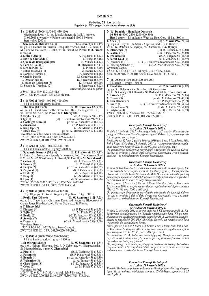 DZIEŃ 2 Sobota, 21 kwietnia Pogodnie (+17°C), po gon. V deszcz, tor elastyczny (3,4) 1 (10) 6150 zł (3000-1650-900-450-150) Międzynarodowa. 4 l. i st. kłusaki francuskie (sulki), które od 01.01.2011 r. wygrały w Polsce sumę nagród 1500 € i więcej. Start wolny. 2200 m 1. Serenade du Betz (FRA) (3) T. Salivonchyk (17,49) kl. gn. 6 l. Hermes du Buisson - Jonquille d'Arnon, hod. C. Clozier, J.M. Bars, M. Boissiere, L. Colin, wł. O. Picard, St. Picard, tr O. Picard (Francja) 2. Siblis d’Alci (1) A. Najderski (14,42) 3. Rive de Clerlande (9) Ł. Kuryś (56,16) 4. Quana de Bourgogne (10) H. Miksha (34,42) 5. Lera de Ba (4) R. Mateusiak (12,17) 6. Sire du Puits (12) L. Picard (18,40) 7. Nitisa Josselyn (11) W. Kałuża (20,52) 8. Noblesse Buroise (7) A. Kupczak (44,46) 9. Qualida Pat (6) M. Ostrowska (82,08) 10. Obsess Oaks (8) D. Bińkowska (66,69) 11. Moon de Boisaubert (5) K. Beliński (106,70) D. Source du Tremblay (2) P. Żakowska (76,22) zdyskwalifikowana za galop 2’59.8” (18.2-39.9-40.2-39.9-41.6) ZWC 17,40 PDK 31,00 TRJ i CZW nie traf. 2 (11) 7000 zł (4000-1600-800-400-200) 4 l. i st. konie III grupy. 1800 m 1. The Blue (GER) (9) dż. W. Szymczuk 62 (9,38) og. gn. 4 l. Desert Prince - The Green, hod. Dr S. Pfennigwerth u.a., wł. Plavac Sp. z o.o., St. Plavac, tr T. Kluczyński 2. Dryblerka (5) dż. A. Turgaev 58 (6,19) 3. Igo (1) (-1) L. Reznikova-Wróblewska 59 (25,43) 4. Coolnight Man (8) pr. dż. A. Kabardov 60 (60,22) 5. Jansen (6) dż. P. Krowicki 60 (16,83) 6. King Jape (2) (-3) S. Mazur 57 (54,49) 7. Black Troy (3) pr. dż. A. Mazurkiewicz 62 (39,46) Wycofane Solicitor, Acer i Bonsai’s Blade. 1’53.2” (20.2-30.9-31-31.1); łat.; 4-9-¾-½-1-1½. ZWC 9,30 PDK 8,70 TRJ 89,50 CZW 743,20 zł. 3 (12) 6560 zł (3200-1760-960-480-160) 4 l. i st. konie arabskie III grupy. 2000 m 1. Spadassin Kossack (NL) (6) dż. P. Piątkowski 62 (9,17) kl. kaszt. 5 l. Nougatin - Speedy V Kossack, hod. The Kossack Stud B.V., wł. M. i P. Włostowscy i L. Kowal, St. Ekur II, tr M. Nowakowski 2. Celius (5) dż. A. Turgaev 62 (9,23) 3. Esteem (3) dż. C. Fraisl 62 (17,86) 4. Fuzjon (2) pr. dż. A. Kabardov 62 (61,69) 5. Pasjonat (7) dż. J. Ochocki 63 (18,59) 6. Etoile (1) dż. V. Popov 59 (43,78) 7. Barq (8) (-3) S. Mazur 59 (21,54) 8. Epos (4) dż. S. Wasiutow 59 (67,86) 2’22.6” (35.2-34.9-36.5-36); pew.; 3½-12-8-1¾-17-8-11. ZWC 9,10 PDK 11,30 TRJ 30,70 CZW 124,50 zł. 4 (13) 7000 zł (4000-1600-800-400-200) Hcp. III grupy. 3 l. konie. Wagi wg Hcp. Gen. +3 kg. 1600 m 1. Really Fast (GB) (6) dż. W. Szymczuk 61½ (7,25) og. s. 3 l. Trade Fair - Christmas Rose, hod. Redmyre Bloodstock & Gareth Jones Bloodstock, wł. Plavac Sp. z o.o., St. Plavac, tr T. Kluczyński 2. Diaxena (4) dż. P. Krowicki 56 (41,78) 3. Tejita (5) dż. M. Pilich 57½ (25,83) 4. Benijo (2) (-3) D. Panczew 53½ (23,28) 5. Astehja (7) (-1) M. Březina 57½ (19,19) 6. Dagger (1) (-2) A. Mazurkiewicz 55½ (7,60) Wycofany Dasman. 1’43” (8.3-30.9-31.1-32.7); łat.; 3-szy.-3-szy.-8. ZWC 7,20 PDK 62,10 TRJ 341,50 CZW 844,10 zł. 5 (14) 8200 zł (4000-2200-1200-600-200) 4 l. i st. konie arabskie II grupy. 1800 m 1. El Weiron (SE) (5) dż. W. Szymczuk 64 (4,54) og. s. 6 l. Neiron - Eldorana, hod. P.-O. Scherling, wł. Niespodzianka, St. Niespodzianka, tr mgr K. Ziemiański 2. Pirat (1) dż. S. Wasiutow 61 (15,43) 3. Fassan (6) dż. P. Piątkowski 59 (26,65) 4. Benefis (4) pr. dż. A. Kabardov 58 (51,30) 5. Walentino (3) dż. A. Turgaev 59 (16,42) 6. Chara Naenz (8) (-3) D. Panczew 52 (85,51) 7. Cobra (2) dż. M. Pilich 57 (78,93) Wycofany Werbel. 2’09.7” (23.9-35.7-34.7-35.4); w wal.; łeb-5-1½-szy.-3-6. ZWC 4,50 PDK 7,70 TRJ 21,10 CZW 75,30 KWN 573,00 zł. 6 (15) Dandolo - Handikap Otwarcia 10 500 zł (6000-2400-1200-600-300) Hcp. I grupy. 4 l. i st. konie. Wagi wg Hcp. Gen. -11 kg. 1800 m 1. Apex (8) (-3) S. Mazur 49½ (21,76) og. c.gn. 4 l. Fly To The Stars - Angelina, hod. J. i K. Dobosz, wł. J. i K. Dobosz i A. Wyrzyk, St. Diament II, tr A. Wyrzyk 2. Irlandczyk (2) (-1) M. Březina 60½ (9,80) 3. Scaloni (7) (-3) D. Panczew 55 (28,89) 4. Dżulietta (6) dż. A. Turgaev 56 (11,48) 5. Secret Gold (1) dż. E. Zahariev 61 (11,97) 6. Odrobina (4) (-1) L. Reznikova-Wróblewska 53½ (38,08) 7. Dancing Splendid (3) (-2) A. Mazurkiewicz 54½ (20,94) Wycofany Nepur. 1’57.2” (21.8-32.3-31.3-31.8); wys.; 3-6-3½-szy.-3-nos. ZWC 21,70 PDK 29,30 TRJ 329,00 CZW 881,50 TPL 61,90 zł. 7 (16) 7000 zł (4000-1600-800-400-200) 3 l. konie III grupy. 1800 m 1. Karoll (6) dż. P. Krowicki 59 (9,87) og. gn. 3 l. Belenus - Karolina, hod. SK Golejewko, wł. J. i S. Górscy i B. Olkowska, St. Red and White, tr W. Olkowski 2. Lascadell (5) dż. R. G.-Panczew 59 (22,85) 3. Chazar (3) pr. dż. A. Kabardov 59 (48,23) 4. Iron Dancer (7) dż. P. Piątkowski 59 (5,79) 5. Bonzo (1) (-1) L. Reznikova-Wróblewska 58 (54,26) 6. Dominikana (2) k. dż. A. Falchi 57 (51,07) 7. Instytucja (4) (-3) S. Mazur 54 (19,73) 1’58.3” (20.6-31.2-32.1-34.4); łat.; 3½-¾-4-13-8-15. ZWC 9,80 PDK 17,40 TRJ 90,10 CZW 127,40 zł. Orzeczenie Komisji Technicznej nr 2 z dnia 21 kwietnia 2012 r. W dniu 21 kwietnia 2012 roku po gonitwie 1 KT zdyskwalifikowała zaprzęg nr. 2 Source du Tremblay (powożąca P. Żakowska) z powodu przejścia w galop po raz trzeci. Podst. praw.: §27 ust. 2 pkt 8 i 10 oraz §68h ust. 1 pkt. 1 lit. g Rozp. Min. Rol. i Rozw. Wsi z dnia 23 sierpnia 2001 r. w sprawie ustalenia regulaminu wyścigów konnych (Dz. U. Nr 90, poz. 1006 z póź. zm.). Od powyższego Orzeczenia przysługuje odwołanie do Komisji Odwoławczej w terminie 3 dni od dnia doręczenia Orzeczenia wraz z uzasadnieniem – za pośrednictwem Komisji Technicznej. Orzeczenie Komisji Technicznej nr 3 z dnia 21 kwietnia 2012 r. W dniu 21 kwietnia 2012 r. właściciel konia Serenade du Betz zgłosił KT, że nie posiada barw stajni Picard dla tej klaczy (gon. 1). KT po przesłuchaniu właściciela konia Serenade du Betz O. Picarda ukarała go karą pieniężną w wy