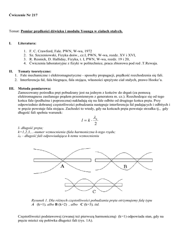 Ćwiczenie Nr 217 Temat: Pomiar prędkości dźwięku i modułu Younga w ciałach stałych. I. Literatura: 1. 2. 3. 4. II. F. C. Crawford, Fale. PWN, W-wa, 1972 Sz. Szczeniowski, Fizyka dośw., cz.I, PWN, W-wa, rozdz. XV i XVI, R. Resnick, D. Halliday, Fizyka, t. I, PWN, W-wa, rozdz. 19 i 20, Ćwiczenia laboratoryjne z fizyki w politechnice, praca zbiorowa pod red .T.Rewaja. Tematy teoretyczne: 1. Fale mechaniczne i elektromagnetyczne - sposoby propagacji, prędkość rozchodzenia się fali. 2. Interferencja fal, fala biegnąca, fala stojąca, własności sprężyste ciał stałych, prawo Hooke’a. III. Metoda pomiarowa: Zamocowany pośrodku pręt pobudzany jest na jednym z końców do drgań (za pomocą elektromagnesu zasilanego prądem przemiennym z generatora m. cz.). Rozchodzące się od tego końca fale (podłużna i poprzeczna) nakładają się na fale odbite od drugiego końca pręta. Przy odpowiednio dobranej częstotliwości pobudzania następuje interferencja fal padających i odbitych i w pręcie powstaje fala stojąca. Zachodzi to wtedy, gdy na końcach pręta powstaje strzałka tj., gdy długość fali spełnia warunek: l =k⋅ λk 2 l- długość pręta; k=1,2,3,...-numer wzmocnienia (fala harmoniczna k-tego rzędu; λk – długość fali odpowiadająca k-temu wzmocnieniu Rysunek 1. Dla różnych częstotliwości pobudzania pręta otrzymujemy falę typu A (k=1), albo B (k=2) , albo C (k=3), itd. Częstotliwości podstawowej (zwanej też pierwszą harmoniczną) (k=1) odpowiada stan, gdy na pręcie mieści się połówka długości fali (rys. 1A). Ta fala jest najsilniejsza (ma największą amplitudę), ma największą długość ze wszystkich fal harmonicznych i odpowiada najniższej częstotliwości. Mierząc długość pręta dowiadujemy się (korzystając z powyższego wzoru), jaka długość fali może zostać wytworzona w pręcie: λk = 2⋅l k Między długością fali λ a częstotliwością f zachodzi związek: λ= v ’ f gdzie v oznacza prędkość dźwięku (fali akustycznej) w pręcie. Prędkość ta praktycznie nie zależy od częstotliwości i długości fali (brak dyspersji), a jedynie od rodzaju materiału, z którego wykonano pręt. Prędkość wyznaczamy z zależności: v = λk ⋅ f k = 2⋅l ⋅ fk k (częstotliwość fk odczytuje się z podłączonego do generatora częstotliwościomierza w momencie, gdy na ekranie oscyloskopu obserwujemy wzmocnienie) Moduł Younga E wyznaczamy z zależności: E= ρ . v2 gdzie ρ- gęstość materiału pręta (z tabeli) IV. Zestaw pomiarowy: Generator drgań akustycznych (G) z wbudowanym częstotliwościomierzem (f), ława z przesuwanymi cewkami (A i B) i uchwytem (C) do mocowania prętów, oscyloskop (Osc), badane pręty, przymiar metrowy (wypożyczyć w pok. 619),. Rysunek 2 V. Wykonanie ćwiczenia: 1. Włączyć generator oraz oscyloskop (G, Osc). 2. Zmierzyć długość wybranego pręta, a następnie zamocować go w uchwycie (C). 3. Za pomocą dźwigni i śrub blokujących ustalić jak najmniejsze szczeliny między cewkami A i B oraz prętem (mniej niż 1mm). Uwaga! Proszę nie dociskać cewek do pręta, aby nie uszkodzić cewek. 4. Zmieniać częstotliwość drgań generatora (od ok. 3kHz w górę) i obserwować sygnał na ekranie oscyloskopu. Do zmiany częstotliwości służy tarcza na generatorze (zgrubne nastawiane częstotliwości) i plastikowe pokrętło (dokładne ustawianie częstotliwości). 5. Po uzyskaniu na oscyloskopie bardzo dużej amplitudy sygnału, zanotować częstotliwość wskazywaną przez częstotliwościomierz. Częstotliwość podstawowa (k=1) dla badanych prętów musi leżeć w przedziale 3kHz do 6kHz. Częstotliwości odpowiadające parzystym harmonicznym (k=2, 4, 6,...), mogą nie dać się zaobserwować ze względu na ich silne tłumienie * . 6. Pomiary opisane w punkcie „4” i „5” powtórzyć dla wszystkich prętów. 7. Gęstości materiałów, z których wykonano pręty odszukać w tabelach (np. Lit.4, Tab. s. 491) przyjmując wartość średnią z podanego przedziału wartości. 8. Wyniki umieścić w tabeli: Pręt Długość l f v vśr u(vśr) ρ E u(E) [kHz] [m/s] [m/s] [m/s] [kg/m3] [Pa] [Pa] k [m] Miedziany Mosiężny Brązowy Stalowy Aluminium 1 3 5 1 3 5 1 3 5 1 3 5- nie da się zmierzyć 1 3 5- nie da się zmierzyć 83008950 82008700 8780 ±10 76007850 2699 ±10 7. Określić niepewności standardowe prędkości u(v) oraz modułu Younga u(E). Jako wartość gęstości przyjąć średnią wartość z tabeli, a jako niepewność Δ(ρ) dla stali, mosiądzu i brązu przyjąć 2⋅l połowę przedziału podanych wartości. Wartości v obliczyć ze wzoru: v k = ⋅ fk k a ich niepewności standardowe ze wzoru: 2 2 u( f k ) u (l ) u (v ) = v ⋅ + ; f l k ∆f ∆l ∆ρ Należy przyjąć (są to niepewności typu B): u (l ) = ; u( f k ) = k ; u(ρ ) = ; 3 3 3 Obliczyć średnią prędkość jako średnią ważoną z 3 pomiarów według wzoru: v1 v2 v3 + + 2 2 wi ⋅ v śr (u (v1 ) ) (u (v2 ) ) (u (v3 ))2 ∑ v śr = = 1 1 1 ∑ wi + + 2 2 (u (v1 ) ) (u (v2 ) ) (u (v3 ))2 a jej niepewność z wzoru: 1 1 1 + + ∑ | wi ⋅ u(vi ) | = u(v1 ) u(v2 ) u(v3 ) ; u (v śr ) = 1 1 1 ∑ wi + + 2 2 (u (v1 ) ) (u (v2 ) ) (u (v3 ))2 wi = 1 (u (vi ) )2 Obliczyć moduł Younga ze wzoru: E = ρ ⋅ v śr 2 i jego niepewność ze wzoru: 2 2u (v śr ) u(ρ ) u(E) = E ⋅ + ρ v śr * 2 Na środku pręta dla parzystych harmonicznych (k=2, 4, 6...) powstaje strzałka. Ponieważ pręt jest w tym miejscu zamocowany „na sztywno”, to drgania są silnie tłumione. Dla harmonicznych nieparzystych (k=1, 3, 5, ... ) na środku pręta powstaje węzeł, a skoro nie ma tam drgań, fala nie jest tłumiona i dlatego nieparzyste harmoniczne dają bardzo silny sygnał na oscyloskopie.