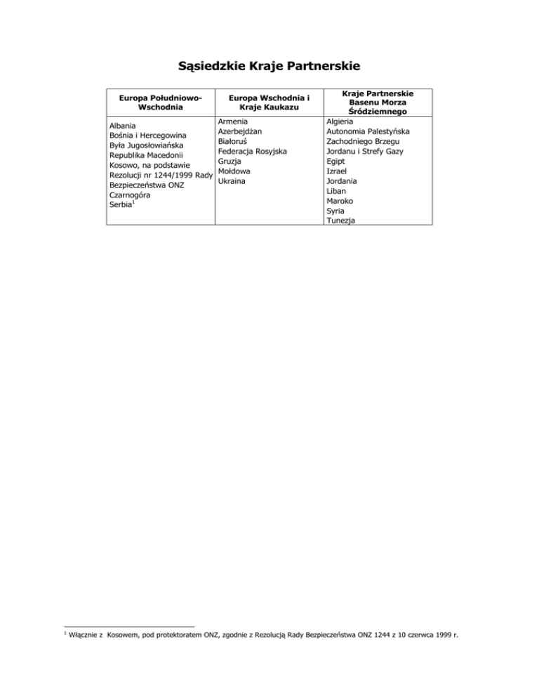 Sąsiedzkie Kraje Partnerskie Europa PołudniowoWschodnia Europa Wschodnia i Kraje Kaukazu Armenia Albania Azerbejdżan Bośnia i Hercegowina Białoruś Była Jugosłowiańska Federacja Rosyjska Republika Macedonii Gruzja Kosowo, na podstawie Mołdowa Rezolucji nr 1244/1999 Rady Ukraina Bezpieczeństwa ONZ Czarnogóra Serbia1 1 Kraje Partnerskie Basenu Morza Śródziemnego Algieria Autonomia Palestyńska Zachodniego Brzegu Jordanu i Strefy Gazy Egipt Izrael Jordania Liban Maroko Syria Tunezja Włącznie z Kosowem, pod protektoratem ONZ, zgodnie z Rezolucją Rady Bezpieczeństwa ONZ 1244 z 10 czerwca 1999 r.