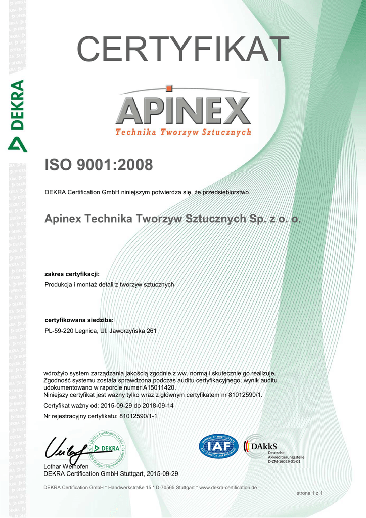 CERTYFIKAT ISO 9001:2008 DEKRA Certification GmbH niniejszym potwierdza się, że przedsiębiorstwo Apinex Technika Tworzyw Sztucznych Sp. z o. o. zakres certyfikacji: Produkcja i montaż detali z tworzyw sztucznych certyfikowana siedziba: PL-59-220 Legnica, Ul. Jaworzyńska 261 wdrożyło system zarządzania jakością zgodnie z ww. normą i skutecznie go realizuje. Zgodność systemu została sprawdzona podczas auditu certyfikacyjnego, wynik auditu udokumentowano w raporcie numer A15011420. Niniejszy certyfikat jest ważny tylko wraz z głównym certyfikatem nr 81012590/1. Certyfikat ważny od: 2015-09-29 do 2018-09-14 Nr rejestracyjny certyfikatu: 81012590/1-1 Lothar Weihofen DEKRA Certification GmbH Stuttgart, 2015-09-29 DEKRA Certification GmbH * Handwerkstraße 15 * D-70565 Stuttgart * www.dekra-certification.de strona 1 z 1