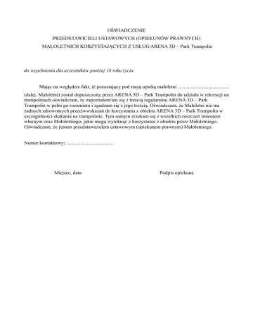 OŚWIADCZENIE PRZEDSTAWICIELI USTAWOWYCH (OPIEKUNÓW PRAWNYCH) MAŁOLETNICH KORZYSTAJĄCYCH Z USŁUG ARENA 3D – Park Trampolin do wypełnienia dla uczestników poniżej 18 roku życia Mając na względzie fakt, iż pozostający pod moją opieką małoletni ….................................... (dalej: Małoletni) został dopuszczony przez ARENA 3D – Park Trampolin do udziału w rekreacji na trampolinach oświadczam, że zapoznałem/am się z treścią regulaminu ARENA 3D – Park Trampolin w pełni go rozumiem i zgadzam się z jego treścią. Oświadczam, że Małoletni nie ma żadnych zdrowotnych przeciwwskazań do korzystania z obiektu ARENA 3D – Park Trampolin w szczególności skakania na trampolinie. Tym samym zrzekam się z wszelkich roszczeń imieniem własnym oraz Małoletniego, jakie mogą wyniknąć z korzystania z obiektu przez Małoletniego. Oświadczam, że jestem przedstawicielem ustawowym (opiekunem prawnym) Małoletniego. Numer kontaktowy:...................................... Miejsce, data Podpis opiekuna