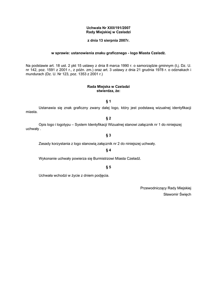 Uchwała Nr XXII/191/2007 Rady Miejskiej w Czeladzi z dnia 13 sierpnia 2007r. w sprawie: ustanowienia znaku graficznego - logo Miasta Czeladź. Na podstawie art. 18 ust. 2 pkt 15 ustawy z dnia 8 marca 1990 r. o samorządzie gminnym (t.j. Dz. U. nr 142, poz. 1591 z 2001 r., z późn. zm.) oraz art. 3 ustawy z dnia 21 grudnia 1978 r. o odznakach i mundurach (Dz. U. Nr 123, poz. 1353 z 2001 r.) Rada Miejska w Czeladzi stwierdza, że: §1 Ustanawia się znak graficzny zwany dalej logo, który jest podstawą wizualnej identyfikacji miasta. §2 Opis logo i logotypu – System Identyfikacji Wizualnej stanowi załącznik nr 1 do niniejszej uchwały . §3 Zasady korzystania z logo stanowią załącznik nr 2 do niniejszej uchwały. §4 Wykonanie uchwały powierza się Burmistrzowi Miasta Czeladź. §5 Uchwała wchodzi w życie z dniem podjęcia. Przewodniczący Rady Miejskiej Sławomir Święch