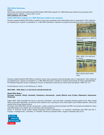 MOS WOLA Warszawa Źródło: http://www.moswola.pl/mos/aktualnosci/837,Kadeci-MOS-Wola-wygrali-31-z-MDK-Warszawa-ostatni-mecz-grupowy.html Wygenerowano: Wtorek, 7 marca 2017, 14:15 Data publikacji 16.12.2005 Kadeci MOS Wola wygrali 3:1 z MDK Warszawa ostatni mecz grupowy Pierwszy zespół kadetów MOS Wola w ostatnim meczu fazy grupowej stracił pierwszego seta w rozgrywkach. Nasi siatkarze, po kiepskiej grze, wygrali na wyjeździe 3:1 z MKS MDK Warszawa i obydwa te zespoły awansowały do finału wojewódzkiego. Kadeci wygrali 3:1 z MDK na wyjeździe MDK - MOS 1:3 w hali przy ul. Polnej Nasz zespół zagrał słaby mecz Pierwszy zespół kadetów MOS Wola w ostatnim meczu fazy grupowej stracił pierwszego seta w rozgrywkach. Nasi siatkarze, po kiepskiej grze, wygrali na wyjeździe 3:1 z MKS MDK Warszawa i obydwa te zespoły awansowały do finału wojewódzkiego. W finałowej rozgrywce sześciu najlepszych drużyn na Mazowszu zaliczone już mamy dwa zwycięstwa z MDK 3:0 i 3:1. W dziesiejszym meczu w hali OSiR przy ul. Polnej MKS MDK - MOS Wola 1:3 (25:21)(21:25)(20:25)(20:25) Skład MOS Wola I: Drzyzga, Łukasik, Iliński, Strzeżek, Pawlewicz, Kaczmarek , Jonak (libero) oraz Fryłow, Makowski, Kostrzewa, Walerzak. Kadeci MOS Wola przystąpili do meczu w sennych nastrojach , bez woli walki i przespali pierwszą partię 21:25. Nasz zespół słabo przyjmował zagrywkę, nie kończył wielu ataków oraz w pierwszym secie tylko jeden punkt zdobył blokiem, którzy jest zwykle silną stroną naszej drużyny. W drugim secie MOS Wola zaczął z animuszem i szybko uzyskał wyraźną przewgę nad MDK. Ale wysokie prowadzenie znowu zdemobilizowało nasz zespół i gra w końcówce seta wyrównała się. Trener K. Zimnicki zaczął szukać lepszej dyspozycji wśród rezerwowych i w rezultacie ostatniego seta MOS grał bez F. Drzyzgi, a następnie bez I.Łukasika, i P. Strzeżka. Zmiennicy poradzili sobie i wygrali czwartego seta 25:20. Komentarz (0) dodaj komentarz Brak komentarzy dodaj komentarz