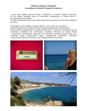 Relacja z pobytu w Hiszpanii na praktyce w ramach Programu Erasmus+ 1 lipca 2015 wzięłam ponowny udział w praktykach w ramach Programu Erasmus+. Po raz kolejny wybrałam pracę na stanowisku recepcjonistki w Hotelu Alexis*** w miejscowości Lloret de Mar. W miejscu zamieszkania jak i pracy miałam zapewnione wyżywienie oraz darmowy dostęp do Internetu. Pracowałam 5 dni w tygodniu - 8 godzin dziennie: 8-16, 16-24 lub 10-14/18-22. Dzięki doświadczeniu z zeszłego roku praca była jeszcze łatwiejsza i przyjemniejsza. Do obowiązków praktykantów na recepcji należał check-in, check-out, drukowanie kart do restauracji, wyrabianie kart all-inclusive, udzielanie informacji na temat hotelu i miejscowości, sporządzanie „raportów” oraz statystyk, sprzedaż wycieczek oraz wi-fi, rezerwacje hoteli, przyjmowanie skarg, rozwiązywanie problemów, odbieranie i wykonywanie telefonów, kontrola e-maili, obsługa drukarki, skanera itp. Dwa dni wolnego w tygodniu dają możliwość zwiedzenia pobliskich miejscowości, takich jak: Tossa de Mar, Malgrat de Mar, Blanes, Calella, Pineda, Santa Susana, Mataró i Barcelona. Wszyscy praktykanci mieli zapewnioną wycieczkę do „Castell Medieval Comte de Valltordera” w miejsowości Tordera -turniej rycerski oraz pokaz flamenco. Pracownicy HTOP mają wstęp wolny na prawie wszystkie imprezy więc również wieczorami każdy znajdzie coś dla siebie ;) Jestem bardzo wdzięczna za możliwość ponownego udziału w praktykach i z chęcią wybrałabym się po raz kolejny! ;) Wszystkim polecam wyjazd na praktyki bo to nie tylko odpowiedzialna praca ale i nowi przyjaciele, nowe wyzwania, przygody, wspomnienia i cenne doświadczenia. Studentka filologii hiszpańskiej Daria Patyjewicz
