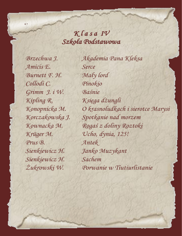 K l a s a IV Szkoła Podstawowa Brzechwa J. Amicis E. Burnett F. H. Collodi C. Grimm J. i W. Kipling R. Konopnicka M. Korczakowska J. Kownacka M. Krüger M. Prus B. Sienkiewicz H. Sienkiewicz H. Żukrowski W. Akademia Pana Kleksa Serce Mały lord Pinokio Baśnie Księga dżungli O krasnoludkach i sierotce Marysi Spotkanie nad morzem Rogaś z doliny Roztoki Ucho, dynia, 125! Antek Janko Muzykant Sachem Porwanie w Tiutiurlistanie