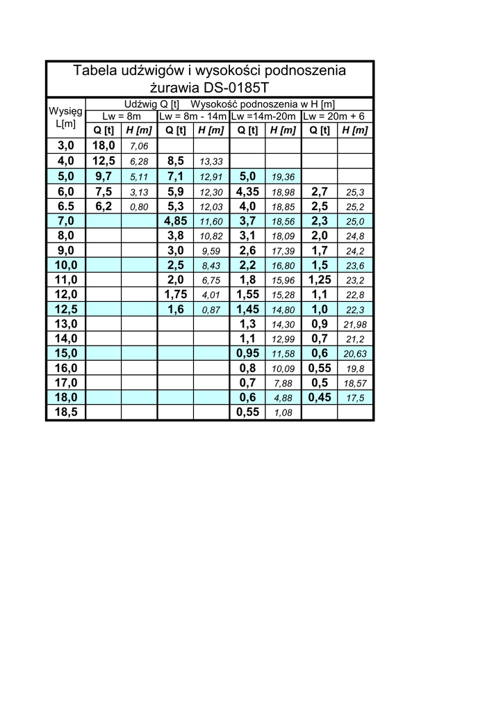 Tabela udźwigów i wysokości podnoszenia żurawia DS