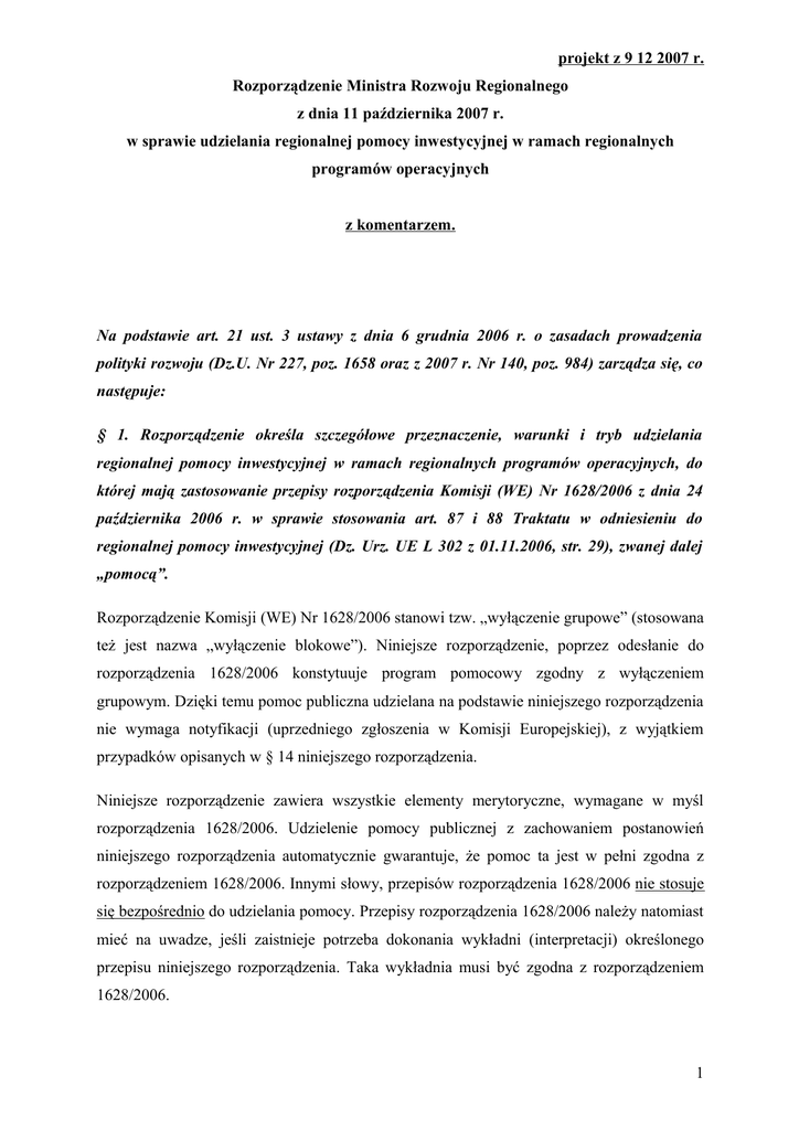 projekt z 9 12 2007 r. Rozporządzenie Ministra Rozwoju Regionalnego z dnia 11 października 2007 r. w sprawie udzielania regionalnej pomocy inwestycyjnej w ramach regionalnych programów operacyjnych z komentarzem. Na podstawie art. 21 ust. 3 ustawy z dnia 6 grudnia 2006 r. o zasadach prowadzenia polityki rozwoju (Dz.U. Nr 227, poz. 1658 oraz z 2007 r. Nr 140, poz. 984) zarządza się, co następuje: § 1. Rozporządzenie określa szczegółowe przeznaczenie, warunki i tryb udzielania regionalnej pomocy inwestycyjnej w ramach regionalnych programów operacyjnych, do której mają zastosowanie przepisy rozporządzenia Komisji (WE) Nr 1628/2006 z dnia 24 października 2006 r. w sprawie stosowania art. 87 i 88 Traktatu w odniesieniu do regionalnej pomocy inwestycyjnej (Dz. Urz. UE L 302 z 01.11.2006, str. 29), zwanej dalej „pomocą”. Rozporządzenie Komisji (WE) Nr 1628/2006 stanowi tzw. „wyłączenie grupowe” (stosowana też jest nazwa „wyłączenie blokowe”). Niniejsze rozporządzenie, poprzez odesłanie do rozporządzenia 1628/2006 konstytuuje program pomocowy zgodny z wyłączeniem grupowym. Dzięki temu pomoc publiczna udzielana na podstawie niniejszego rozporządzenia nie wymaga notyfikacji (uprzedniego zgłoszenia w Komisji Europejskiej), z wyjątkiem przypadków opisanych w § 14 niniejszego rozporządzenia. Niniejsze rozporządzenie zawiera wszystkie elementy merytoryczne, wymagane w myśl rozporządzenia 1628/2006. Udzielenie pomocy publicznej z zachowaniem postanowień niniejszego rozporządzenia automatycznie gwarantuje, że pomoc ta jest w pełni zgodna z rozporządzeniem 1628/2006. Innymi słowy, przepisów rozporządzenia 1628/2006 nie stosuje się bezpośrednio do udzielania pomocy. Przepisy rozporządzenia 1628/2006 należy natomiast mieć na uwadze, jeśli zaistnieje potrzeba dokonania wykładni (interpretacji) określonego przepisu niniejszego rozporządzenia. Taka wykładnia musi być zgodna z rozporządzeniem 1628/2006. 1 Niniejsze rozporządzenie jest jedynym programem pomocowym, mającym zastosowanie do udzielania, w ramach regionalnych programów operacyjnych, pomocy publicznej zgodnej z rozporządzeniem 1628/2006. Zatem w ramach r.p.o. nie ma innej możliwości udzielenia pomocy publicznej zgodnej z rozporządzeniem 1628/2006, jak tylko na podstawie niniejszego rozporządzenia. § 2. 1. Przepisów rozporządzenia nie stosuje się do pomocy: 1) udzielanej w sektorach: rybołówstwa i akwakultury, hutnictwa żelaza i stali, górnictwa węgla, budownictwa okrętowego oraz włókien syntetycznych; Przepis § 2 ust. 1 pkt 1 wskazuje na sektory wyłączone z możliwości otrzymania pomocy publicznej na podstawie niniejszego rozporządzenia. Jest to wyłączenie przedmiotowe, a nie podmiotowe. Oznacza to, że podmiot, który prowadzi działalność w dziedzinie objętej wyłączeniem oraz działalność w dziedzinie nieobjętej włączeniem, może na podstawie niniejszego rozporządzenia otrzymać pomoc publiczną na projekt dotyczący działalności nieobjętej wyłączeniem. Przykładowo, jeżeli kopalnia węgla kamiennego prowadzi uboczną produkcję wody mineralnej, to na rozwój tej ubocznej działalności może otrzymać pomoc publiczną na podstawie niniejszego rozporządzenia. Definicja sektora rybołówstwa i akwakultury jest zawarta w Rozporządzeniu Rady (WE) nr 104/2000 z dnia 17 grudnia 1999 r. w sprawie wspólnej organizacji rynków produktów rybołówstwa i akwakultury (OJ L 17, 21.1.2000, p. 22–52). Definicje sektorów: hutnictwa żelaza i stali oraz włókien syntetycznych są zawarte w załącznikach 1 i 2 do Wytycznych w sprawie krajowej pomocy regionalnej na lata 2007-13 (2006/C 54/08). Definicja sektora górnictwa węgla jest zawarta w rozporządzeniu Rady (WE) nr 1407/2002 z dnia 23 lipca 2002 r. w sprawie pomocy państwa dla przemysłu węglowego (OJ L 205, 02/08/2002 p. 0001 – 0008). Definicja sektora budownictwa okrętowego jest zawarta w Zasadach ramowych dotyczących pomocy państwa dla przemysłu stoczniowego (2003/C 317/06). 2) udzielanej na działalność związaną z wywozem do krajów trzecich lub państw członkowskich Unii Europejskiej, czyli pomocy związanej bezpośrednio z ilością wywożonych produktów, z tworzeniem i funkcjonowaniem sieci dystrybucyjnej lub z innymi wydatkami bieżącymi związanymi z prowadzeniem działalności eksportowej; 2 Zgodnie z § 5 pomoc na podstawie niniejszego rozporządzenia jest udzielana na nowe inwestycje. Jednakże, w myśl komentowanego tu przepisu § 2 ust. 2 pkt 1 wspomagana inwestycja nie może polegać na utworzeniu sieci dystrybucyjnej za granicą (może natomiast polegać na tworzeniu takiej sieci w kraju). Ponadto, udzielenie pomocy może być uzależnione od prowadzenia przez beneficjenta działalności eksportowej (np. prowadzenie takiej działalności może stanowić jedno z kryteriów selekcji projektów) ale nie może być uzależnione od osiągnięcia przez beneficjenta określonej wielkości tej działalności (np. nie można w kryteriach wyboru projektów ustalić, że pomoc otrzymają tylko te podmioty, które co najmniej 50% przychodów osiągają z działalności eksportowej). 3) uzależnionej od wykorzystania towarów produkcji krajowej uprzywilejowanych względem towarów przywożonych. Zakaz udzielania pomocy uzależnionej od wykorzystywania towarów produkcji krajowej dotyczy towarów wykorzystywanych w bieżącej działalności beneficjenta pomocy (np. nie można uzależnić udzielenia pomocy dla producenta zabawek polietylenowych od okoliczności, czy nabywa on surowiec – polietylen - produkcji krajowej, czy też zagranicznej). Zakaz ten dotyczy również nabywania dóbr w ramach realizacji wspomaganej inwestycji – jeśli np. inwestycja polega na zakupie maszyny, to nie można postawić beneficjentowi warunku, że zakupiona zostanie maszyna wyprodukowana w kraju (a nie pochodząca z importu). 2. Przepisów rozporządzenia nie stosuje się w zakresie dzi
