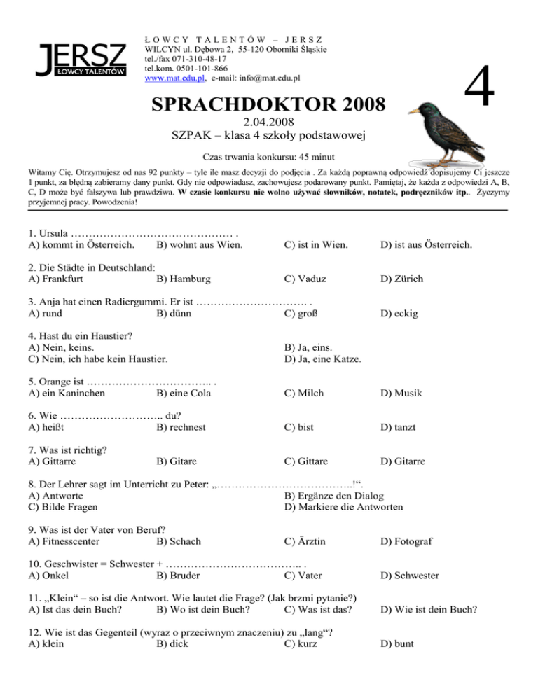 ŁOWCY TALENTÓW – JERSZ WILCYN ul. Dębowa 2, 55-120 Oborniki Śląskie tel./fax 071-310-48-17 tel.kom. 0501-101-866 www.mat.edu.pl, e-mail: [email protected] SPRACHDOKTOR 2008 2.04.2008 SZPAK – klasa 4 szkoły podstawowej 4 Czas trwania konkursu: 45 minut Witamy Cię. Otrzymujesz od nas 92 punkty – tyle ile masz decyzji do podjęcia . Za każdą poprawną odpowiedź dopisujemy Ci jeszcze 1 punkt, za błędną zabieramy dany punkt. Gdy nie odpowiadasz, zachowujesz podarowany punkt. Pamiętaj, że każda z odpowiedzi A, B, C, D może być fałszywa lub prawdziwa. W czasie konkursu nie wolno używać słowników, notatek, podręczników itp.. Życzymy przyjemnej pracy. Powodzenia! 1. Ursula ……………………………………… . A) kommt in Österreich. B) wohnt aus Wien. C) ist in Wien. D) ist aus Österreich. 2. Die Städte in Deutschland: A) Frankfurt B) Hamburg C) Vaduz D) Zürich 3. Anja hat einen Radiergummi. Er ist …………………………. . A) rund B) dünn C) groß D) eckig 4. Hast du ein Haustier? A) Nein, keins. C) Nein, ich habe kein Haustier. B) Ja, eins. D) Ja, eine Katze. 5. Orange ist …………………………….. . A) ein Kaninchen B) eine Cola C) Milch D) Musik 6. Wie ……………………….. du? A) heißt B) rechnest C) bist D) tanzt 7. Was ist richtig? A) Gittarre C) Gittare D) Gitarre B) Gitare 8. Der Lehrer sagt im Unterricht zu Peter: „………………………………..!“. A) Antworte B) Ergänze den Dialog C) Bilde Fragen D) Markiere die Antworten 9. Was ist der Vater von Beruf? A) Fitnesscenter B) Schach C) Ärztin D) Fotograf 10. Geschwister = Schwester + ……………………………….. . A) Onkel B) Bruder C) Vater D) Schwester 11. „Klein“ – so ist die Antwort. Wie lautet die Frage? (Jak brzmi pytanie?) A) Ist das dein Buch? B) Wo ist dein Buch? C) Was ist das? D) Wie ist dein Buch? 12. Wie ist das Gegenteil (wyraz o przeciwnym znaczeniu) zu „lang“? A) klein B) dick C) kurz D) bunt 13.Was ist richtig? A) Der Taxifahrer braucht ein Lineal. C) Der Programmierer braucht einen Pinsel. B) Der Schüler braucht ein Heft. D) Der Lehrer braucht ein Buch. 14. Was trinkst du? A) Joghurt C) Tee D) Eis 15. Was ist im Kinderzimmer? A) die Badewanne B) die Dusche C) das Regal D) das Bett 16. Wie heißt das auf Deutsch? – „krzesło“ A) Tisch B) Schrank C) Stuhl D) Tasche 17. Bist du dick? A) Ja, ich bin nicht dick. C) Nein, ich bin nicht dick. B) Nein, ich bin dick. D) Ja, ich bin dick. 18. Jak zapytasz kolegę, jaki jest jego brat? A) Wie ist dein Bruder? C) Was ist dein Bruder? B) Wo ist dein Bruder? D) Wer ist dein Bruder? 19. Powiedz, że nie lubisz pisać. A) Ich schreibe gern. B) Ich schreibe nicht gern. C) Ich schreibe oft. D) Ich schreibe viel. 20. Wie heißt du? A) Ich heiße Lotte. C) Ich bin Lotte. D) Das ist Lotte. B) Obst B) Mein Name ist Lotte. 21. Ich …………………….. Maria, ……………………… du? A) bin – und B) heiße – und C) heiße – aber 22. Ist das ein Computer? A) Ja, das ist ein Computer. C) Nein, das ist ein Telefon. D) Name – wie B) Nein, das ist kein Computer. D) Ja, das ist ein Telefon. 23. Hallo, ich bin Jennifer. Ich ……………………….. aus Toledo. A) wohne B) komme C) woher © Copyright by Łowcy Talentów – JERSZ, Wrocław 2008 D) bin