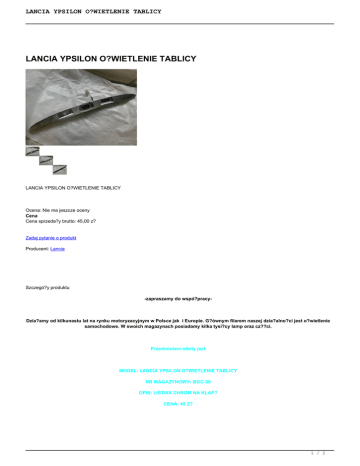 LANCIA YPSILON O?WIETLENIE TABLICY LANCIA YPSILON O?WIETLENIE TABLICY LANCIA YPSILON O?WIETLENIE TABLICY Ocena: Nie ma jeszcze oceny Cena Cena sprzeda?y brutto: 45,00 z? Zadaj pytanie o produkt Producent: Lancia Szczegó?y produktu -zapraszamy do wspó?pracy- Dzia?amy od kilkunastu lat na rynku motoryzacyjnym w Polsce jak i Europie. G?ównym filarem naszej dzia?alno?ci jest o?wietlenie samochodowe. W swoich magazynach posiadamy kilka tysi?cy lamp oraz cz??ci. Przedmiotem oferty jest MODEL: LANCIA YPSILON O?WIETLENIE TABLICY NR MAGAZYNOWY: B5/C-90 OPIS: LISTWA CHROM NA KLAP? CENA: 45 Z? 1 / 2 LANCIA YPSILON O?WIETLENIE TABLICY Lampy wysy?amy jeszcze tego samego dnia Kurierem Siódemka, dlatego masz pewno??, ?e zakupiony towar szybko trafi w Twoje r?ce. Udzielamy gwarancji rozruchowej na zakupione cz??ci. Magazyny 2 razy w tygodniu s? zaopatrywany w nowy towar, istnieje mo?liwo?? zamówienia cz??ci. Zajmujemy si? równie? napraw?, regeneracj? i tuningiem reflektorów samochodowych. Kontakt: Lampy Samochodowe Nowa 33 64-560 Ostroróg TEL.: 739-020-099 [email protected] Zapraszamy równie? do naszego punktu w Poznaniu 2 / 2 Powered by TCPDF (www.tcpdf.org)