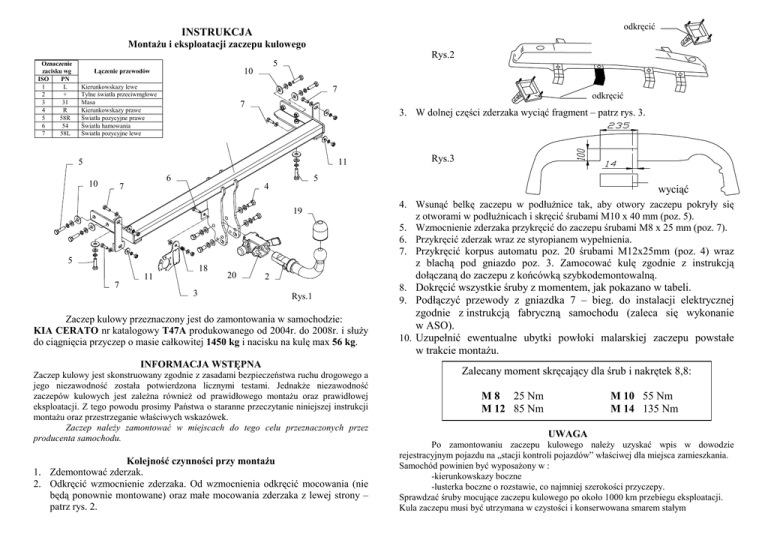 odkręcić INSTRUKCJA MontaŜu i eksploatacji zaczepu kulowego Oznaczenie zacisku wg ISO PN 1 L 2 + 3 31 4 R 5 58R 6 54 7 58L Rys.2 5 10 Łączenie przewodów Kierunkowskazy lewe Tylne światła przeciwmgłowe Masa Kierunkowskazy prawe Światła pozycyjne prawe Światła hamowania Światła pozycyjne lewe 7 odkręcić 7 3. W dolnej części zderzaka wyciąć fragment – patrz rys. 3. 1 5 11 6 10 Rys.3 5 7 4 wyciąć 19 5 18 11 20 2 7 3 Rys.1 Zaczep kulowy przeznaczony jest do zamontowania w samochodzie: KIA CERATO nr katalogowy T47A produkowanego od 2004r. do 2008r. i słuŜy do ciągnięcia przyczep o masie całkowitej 1450 kg i nacisku na kulę max 56 kg. INFORMACJA WSTĘPNA Zaczep kulowy jest skonstruowany zgodnie z zasadami bezpieczeństwa ruchu drogowego a jego niezawodność została potwierdzona licznymi testami. JednakŜe niezawodność zaczepów kulowych jest zaleŜna równieŜ od prawidłowego montaŜu oraz prawidłowej eksploatacji. Z tego powodu prosimy Państwa o staranne przeczytanie niniejszej instrukcji montaŜu oraz przestrzeganie właściwych wskazówek. Zaczep naleŜy zamontować w miejscach do tego celu przeznaczonych przez producenta samochodu. Kolejność czynności przy montaŜu 1. Zdemontować zderzak. 2. Odkręcić wzmocnienie zderzaka. Od wzmocnienia odkręcić mocowania (nie będą ponownie montowane) oraz małe mocowania zderzaka z lewej strony – patrz rys. 2. 4. Wsunąć belkę zaczepu w podłuŜnice tak, aby otwory zaczepu pokryły się z otworami w podłuŜnicach i skręcić śrubami M10 x 40 mm (poz. 5). 5. Wzmocnienie zderzaka przykręcić do zaczepu śrubami M8 x 25 mm (poz. 7). 6. Przykręcić zderzak wraz ze styropianem wypełnienia. 7. Przykręcić korpus automatu poz. 20 śrubami M12x25mm (poz. 4) wraz z blachą pod gniazdo poz. 3. Zamocować kulę zgodnie z instrukcją dołączaną do zaczepu z końcówką szybkodemontowalną. 8. Dokręcić wszystkie śruby z momentem, jak pokazano w tabeli. 9. Podłączyć przewody z gniazdka 7 – bieg. do instalacji elektrycznej zgodnie z instrukcją fabryczną samochodu (zaleca się wykonanie w ASO). 10. Uzupełnić ewentualne ubytki powłoki malarskiej zaczepu powstałe w trakcie montaŜu. Zalecany moment skręcający dla śrub i nakrętek 8,8: M 8 25 Nm M 12 85 Nm M 10 55 Nm M 14 135 Nm UWAGA Po zamontowaniu zaczepu kulowego naleŜy uzyskać wpis w dowodzie rejestracyjnym pojazdu na „stacji kontroli pojazdów” właściwej dla miejsca zamieszkania. Samochód powinien być wyposaŜony w : -kierunkowskazy boczne -lusterka boczne o rozstawie, co najmniej szerokości przyczepy. Sprawdzać śruby mocujące zaczepu kulowego po około 1000 km przebiegu eksploatacji. Kula zaczepu musi być utrzymana w czystości i konserwowana smarem stałym PPUH AUTO-HAK s.j. WyposaŜenie zaczepu: Produkcja Zaczepów Kulowych Henryk & Zbigniew Nejman 76-200 SŁUPSK ul. Słoneczna 16K tel/fax (059) 8-414-414; 8-414-413 E-mail: [email protected] www. autohak.com.pl Zaczep kulowy bez wyposaŜenia elektrycznego T47A Klasa: A50-X Nr kat. Przeznaczony do zamontowania w samochodzie: Producent: KIA Model: CERATO produkowanego od 2004r. do 2008r. Dane techniczne: Wartość siły D: 8,0 kN maksymalna masa przyczepy: 1450 kg maksymalny nacisk na kulę: 56 kg Numer homologacji zgodnie z wytycznymi regulaminu EKG/ONZ 55.01: E20-55R-01 1812 KARTA GWARANCYJNA Producent udziela gwarancji niniejszą kartą gwarancyjną na okres 24 miesięcy licząc od dnia zakupu zaczepu kulowego do samochodu: KIA CERATO produkowanego od 2004r. do 2008r. Data produkcji .............................. Data zakupu..................................... Zakres gwarancji obejmuje wyłącznie wady jakościowe wynikające z winy producenta. Gwarancja nie obejmuje natomiast uszkodzeń zawinionych przez nabywcę, wynikających z niewłaściwego montaŜu, uŜytkowania lub konserwacji, uszkodzeń mechanicznych, normalnego zuŜycia podczas eksploatacji itp. Gwarancja udzielona na zakupiony towar nie wyłącza, nie ogranicza ani nie zawiesza uprawnień kupującego wynikających z niezgodności towaru z umową. Reklamacje naleŜy zgłaszać w punkcie sprzedaŜy, składając jednocześnie kartę gwarancyjną. Usunięcie "wady" następuje po stwierdzeniu przez punkt sprzedaŜy wspólnie z producentem słuszności złoŜonej reklamacji. Reklamacja powinna być załatwiona w ciągu czternastu dni od dnia uznania reklamacji. Karta gwarancyjna jest niewaŜna jeŜeli nie jest wypełniona i podpisana. Data zgłoszenia reklamacji: ................................................................... INFORMACJA WSTĘPNA Zaczep kulowy jest skonstruowany zgodnie z zasadami bezpieczeństwa ruchu drogowego. Zaczep kulowy jest elementem wpływającym na bezpieczeństwo jazdy i moŜe zostać zainstalowany wyłącznie przez personel wyspecjalizowany. Niedopuszczalne jest dokonywanie jakichkolwiek zmian w konstrukcji zaczepu. Powoduje to wygaśniecie dopuszczenia do stosowania. W przypadku obecności masy izolacyjnej lub osłony podwozia w miejscu przylegania zaczepu, naleŜy ją usunąć. Nieosłonięte miejsca karoserii oraz wywiercone otwory naleŜy pomalować farbą antykorozyjną. Informacjami wiąŜącymi odnośnie wartości obciąŜeń są dane podawane przez producenta samochodu, względnie wartości maksymalnej masy przyczepy oraz maksymalnego nacisku na kulę, przy czym wartości parametrów zaczepu kulowego nie mogą być przekroczone. Wzór do obliczania wartości siły D: Maks. masa przyczepy [kg] x Masa całkowita samochodu [kg] 9,81 = X + 1000 Masa całkowita samochodu [kg] Maks. masa przyczepy [kg] + + D [kN]