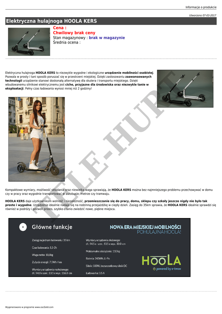 Informacje o produkcie Utworzono 07-03-2017 Elektryczna hulajnoga HOOLA KERS Cena : Chwilowy brak ceny Stan magazynowy : brak w magazynie Średnia ocena : TE LE -H U R T Elektryczna hulajnoga HOOLA KERS to niezwykle wygodne i ekologiczne urządzenie mobilności osobistej. Pozwala w prosty i tani sposób poruszać się w przestrzeni miejskiej. Dzięki zastosowaniu zaawansowanych technologii urządzenie stanowi doskonałą alternatywę dla skutera i transportu miejskiego. Dzięki wbudowanemu silnikowi elektrycznemu jest ciche, przyjazne dla środowiska oraz niezwykle tanie w eksploatacji. Pełny czas ładowania wynosi mniej niż 2 godziny! Kompaktowe wymiary, możliwość składania oraz niewielka waga sprawiają, że HOOLA KERS można bez najmniejszego problemu przechowywać w domu czy w pracy oraz wygodnie transportować w autobusie, metrze czy tramwaju. HOOLA KERS daje użytkownikom wolność i niezależność, przemieszczanie się do pracy, domu, sklepu czy szkoły jeszcze nigdy nie było tak proste i wygodne. Urządzenie idealnie nadaje się na rodzinną przejażdżkę w ciepły dzień. Zasięg do 35km sprawia, że HOOLA KERS idealnie sprawdzi się również w podróży i pozwoli prosto, szybko i tanio zwiedzić nowe, piękne miejsca. Wygenerowano w programie www.oscGold.com