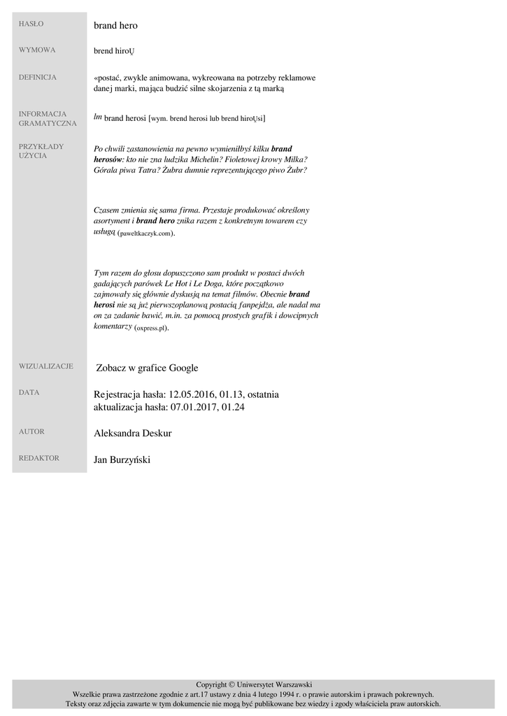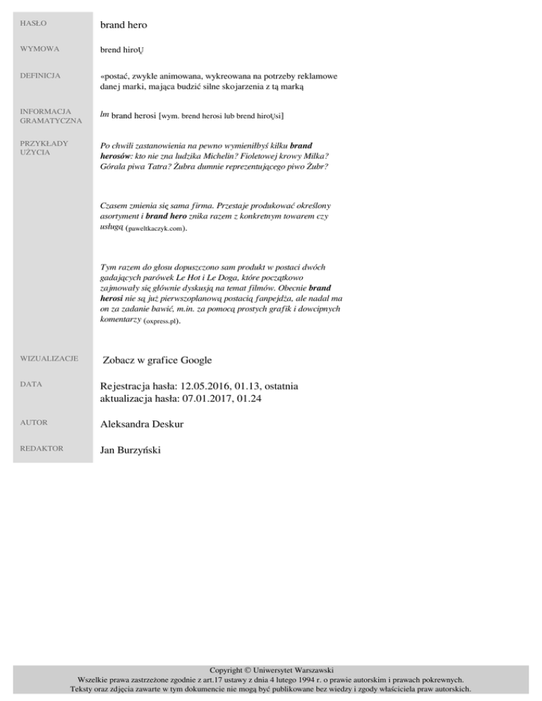 HASŁO brand hero WYMOWA brend hiroṶ DEFINICJA «postać, zwykle animowana, wykreowana na potrzeby reklamowe danej marki, mająca budzić silne skojarzenia z tą marką» INFORMACJA GRAMATYCZNA lm brand herosi [wym. brend herosi lub brend hiroṶsi] PRZYKŁADY UŻYCIA Po chwili zastanowienia na pewno wymieniłbyś kilku brand herosów: kto nie zna ludzika Michelin? Fioletowej krowy Milka? Górala piwa Tatra? Żubra dumnie reprezentującego piwo Żubr? Czasem zmienia się sama firma. Przestaje produkować określony asortyment i brand hero znika razem z konkretnym towarem czy usługą (paweltkaczyk.com). Tym razem do głosu dopuszczono sam produkt w postaci dwóch gadających parówek Le Hot i Le Doga, które początkowo zajmowały się głównie dyskusją na temat filmów. Obecnie brand herosi nie są już pierwszoplanową postacią fanpejdża, ale nadal ma on za zadanie bawić, m.in. za pomocą prostych grafik i dowcipnych komentarzy (oxpress.pl). WIZUALIZACJE Zobacz w grafice Google DATA Rejestracja hasła: 12.05.2016, 01.13, ostatnia aktualizacja hasła: 07.01.2017, 01.24 AUTOR Aleksandra Deskur REDAKTOR Jan Burzyński Copyright © Uniwersytet Warszawski Wszelkie prawa zastrzeżone zgodnie z art.17 ustawy z dnia 4 lutego 1994 r. o prawie autorskim i prawach pokrewnych. Teksty oraz zdjęcia zawarte w tym dokumencie nie mogą być publikowane bez wiedzy i zgody właściciela praw autorskich. Powered by TCPDF (www.tcpdf.org)
