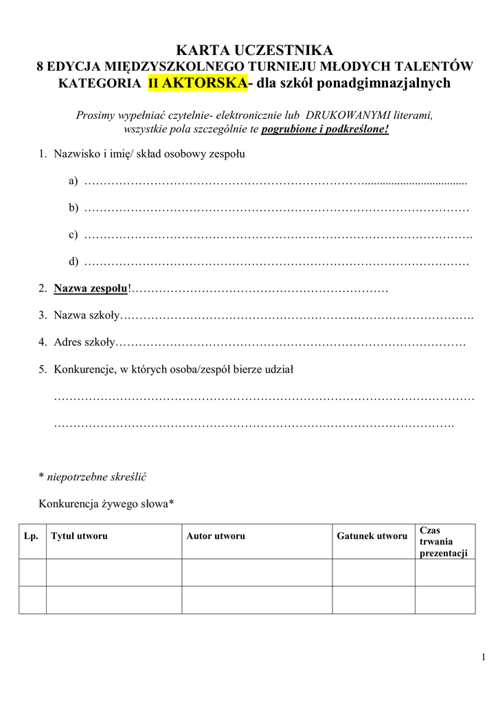 KARTA UCZESTNIKA 8 EDYCJA MIĘDZYSZKOLNEGO TURNIEJU MŁODYCH TALENTÓW KATEGORIA II AKTORSKA- dla szkół ponadgimnazjalnych Prosimy wypełniać czytelnie- elektronicznie lub DRUKOWANYMI literami, wszystkie pola szczególnie te pogrubione i podkreślone! 1. Nazwisko i imię/ skład osobowy zespołu a) ………………………………………………………………................................... b) ……………………………………………………………………………………… c) ………………………………………………………………………………………. d) ……………………………………………………………………………………… 2. Nazwa zespołu!………………………………………………………… 3. Nazwa szkoły………………………………………………………………………………. 4. Adres szkoły……………………………………………………………………………… 5. Konkurencje, w których osoba/zespół bierze udział ……………………………………………………………………………………………… …………………………………………………………………………………………. * niepotrzebne skreślić Konkurencja żywego słowa* Lp. Tytuł utworu Autor utworu Gatunek utworu Czas trwania prezentacji 1 Konkurencja małych form teatralnych* Lp. Tytuł Autor Gatunek Czas trwania prezentacji Konkurencja piosenki* Lp. Tytuł utworu Autor tekstu Akompaniament (instrument lub Muzyka (kompozytor) rodzaj podkładu dźwiękowego) Czas trwania prezentacji Konkurencja tańca* Lp. Rodzaj tańca Czas trwania prezentacji Muzyka 6. Imię i nazwisko opiekuna/ nauczyciela…………………………………………………… 7. Telefon i e-mail kontaktowy opiekuna/nauczyciela (ważne!)……………… .............................................................................................................................................. Akceptuję regulamin oraz wyrażam zgodę na upublicznienie w mediach zdjęć i materiałów filmowych zawierających mój wizerunek, zarejestrowanych podczas turnieju. ………………………… Miejscowość i data …… ………………… podpis uczestnika 2