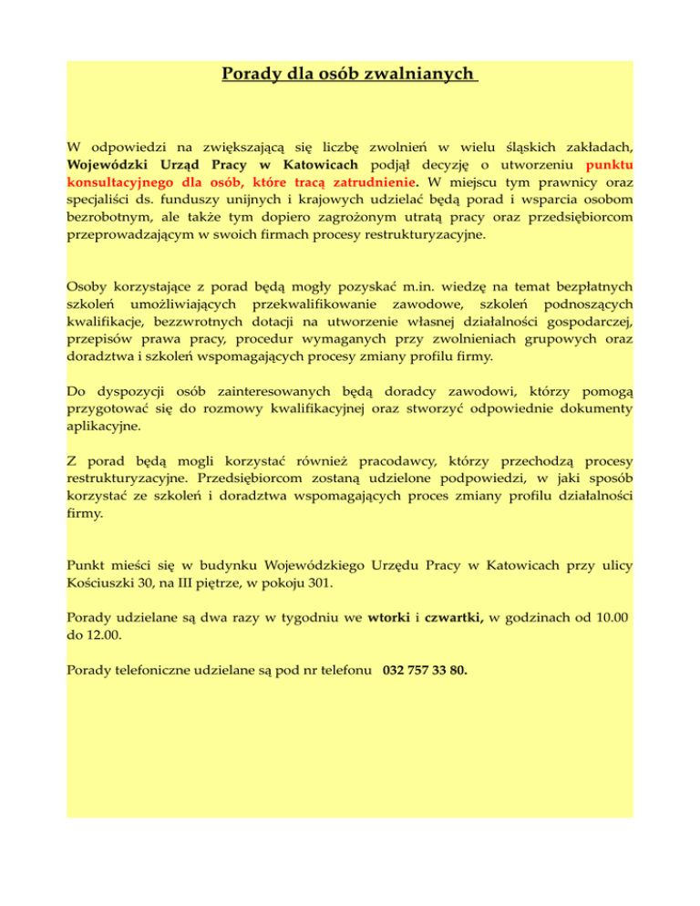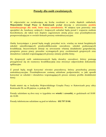Porady dla osób zwalnianych W odpowiedzi na zwiększającą się liczbę zwolnień w wielu śląskich zakładach, Wojewódzki Urząd Pracy w Katowicach podjął decyzję o utworzeniu punktu konsultacyjnego dla osób, które tracą zatrudnienie. W miejscu tym prawnicy oraz specjaliści ds. funduszy unijnych i krajowych udzielać będą porad i wsparcia osobom bezrobotnym, ale także tym dopiero zagrożonym utratą pracy oraz przedsiębiorcom przeprowadzającym w swoich firmach procesy restrukturyzacyjne. Osoby korzystające z porad będą mogły pozyskać m.in. wiedzę na temat bezpłatnych szkoleń umożliwiających przekwalifikowanie zawodowe, szkoleń podnoszących kwalifikacje, bezzwrotnych dotacji na utworzenie własnej działalności gospodarczej, przepisów prawa pracy, procedur wymaganych przy zwolnieniach grupowych oraz doradztwa i szkoleń wspomagających procesy zmiany profilu firmy. Do dyspozycji osób zainteresowanych będą doradcy zawodowi, którzy pomogą przygotować się do rozmowy kwalifikacyjnej oraz stworzyć odpowiednie dokumenty aplikacyjne. Z porad będą mogli korzystać również pracodawcy, którzy przechodzą procesy restrukturyzacyjne. Przedsiębiorcom zostaną udzielone podpowiedzi, w jaki sposób korzystać ze szkoleń i doradztwa wspomagających proces zmiany profilu działalności firmy. Punkt mieści się w budynku Wojewódzkiego Urzędu Pracy w Katowicach przy ulicy Kościuszki 30, na III piętrze, w pokoju 301. Porady udzielane są dwa razy w tygodniu we wtorki i czwartki, w godzinach od 10.00 do 12.00. Porady telefoniczne udzielane są pod nr telefonu 032 757 33 80.