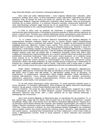 Kogo Alicja nie widziała, czyli ćwiczenia z represyjnej nieobecności Nasz świat jest pełen niedoskonałości i coraz większej nieobecności człowieka, pełen problemów, strategii, teorii, pytań, na które przestaliśmy szukać odpowiedzi; odpowiedzi bez znaków zapytania, dróg, po których nie mamy już ochoty iść, podróży bez celu i celów w nadmiarze bez turystycznego działania. Rygoryzm społecznych oczekiwań wobec jednostki, mimo jej emancypacji, utrzymuje się na stałym poziomie. A w pewnych obszarach potrzeba „użyteczności społecznej”, za cenę indywidualnego szczęścia ciągle stanowi łup nie do pogardzenia, co bywa w pełen pogardy sposób demonstrowane w tym „najnowocześniejszym” z możliwych czasie. A może to dobry czas na pozbycie się sztywności w oglądzie świata i rozumienia mechanizmów jego funkcjonowania. Potrzebujemy ponownie poszukać w sobie zdolności patrzenia na rzeczy z różnych stron. Potrzeba nam myślenia lateralnego (termin wprowadzony przez Edwarda de Bono), myślenia twórczego, by spojrzeć na rzeczywistość w sposób jak najmniej przekłamany. To, co znaleźć można w rysunkach Mariusza Gutowskiego jest strategią niezgody na zadekretowane kłamstwo, badaniem relacji nad tym, co stanowi różnicę między wyretuszowaną wersją zdarzenia, a taką na „poziomie zero pisania”. Rysunki ze względu na swój zeszytowy format wyglądają dziecinnie, niewinnie, chwilami wręcz naiwnie. Przy pomocy narysowanych bohaterów Gutowski łapie w dzienniku chwile, które nie pasują do oficjalnej wersji życia. Istnienia w wersji 2.0. Egzystencja u Gutowskiego wygląda opresywnie, fizjologicznie, śmiertelnie niebeztrosko, a wreszcie niedziecinnie (mimo wielodzietności jego prac). Tutaj nie spotkasz demograficznej zimy. Największym wrogiem dziecka może stać się dorosły albo w najlepszym przypadku mamy tutaj dzieci, które mogłyby być ilustracją tezy Zygmunta Baumana, że w naszych czasach dziecko jest przede wszystkim 1 przedmiotem uczuciowej konsumpcji. Mimo ironii autora można zauważyć, że w notatniku raczej mamy dowody na to, co Michel Houellebecq nazywa „poszerzaniem pola walki”. W obszarze społecznych aktywności jedyną jakością w uniformizującym się świecie jest zdobywanie pozycji zawodowej i władzy nad drugą osobą/ami. Do tego dochodzi jeszcze zmaganie się z cielesnością, bo przecież nie o uleganie niedoskonałości ciała tu chodzi. Tutaj trudno uciec w iluzję sztuki, w „piękny pozór”, tylko chce się wracać do życia w jego spektakularnej formule transmitowanej przez media. Dzięki „ładowi” medialnemu łatwiej wypierać to, co dla nas niewygodne, nieestetyczne, niepasujące, nieprzyjemne. Przedrostek nie staje się ważniejszy od słowa podstawowego. Co może nie istnieć, niech w takim razie nie istnieje. To „nie-istnienie” polega raczej na ukrywaniu, na przemilczaniu, na zakłamywaniu, wymazywaniu. Bycie zastąpić nie-bytem, miłość nie-miłością a myślenie nie-myśleniem. Coraz częściej rzeczywistość zaczyna mieć charakter uproszczony, ujednolicony, spłaszczony i pozornie zindywidualizowany. Pomimo coraz większej liczby kanałów telewizyjnych, prawie każdy z nich pokazuje to samo. To nie jest sztuka dekoracyjna, sztuka stosowana. To raczej pierwotne szukanie sensu w formie polowania. To rysowanie spekulatywne, które przejawia się zapisie obecności prawdziwego istnienia. Tak jak pisanie, o którym Roland Barthes pisał scribo: taciturio – pisanie milczkiem. Tak rysuje się, żeby docierać do rzeczy najprostszych, czających się w kąciku oka, odwołujących się do tego, co Walter Benjamin nazywał „nieświadomością optyczną”. Nie o odkrywaniu tajemnicy tutaj mowa, tylko o próby zbliżenia się do tego istnienia bolesnego i stawiającego nas na baczność. Jest w tych pracach niezgoda na fałszowanie tego, co najczęściej nam się przydarza. To, co jest, zamiast tego, czego nie ma. Nawet, jeśli prowadzi nas to do smutku, osamotnienia i rozpadu wszystkiego. Nawet, jeśli, może okazać się to dla odbiorcy śmiertelnie niebezpieczne. Pojawia się tu na pierwszym planie klęska istnienia albo człowiek, jako metafora egzystencjalna, jak nazwał to Jose Ortega y Gasset w pierwszym swoim eseju Medytacje o Don Kichocie opublikowanym w Madrycie w 1914 roku. Ludzie wrzuceni w istnienie, by użyć sformułowania Martina Heideggera, bez możliwości wyboru miejsca, imienia, dnia swoich narodzin jak i godziny śmierci. Narodziny – błąd największy, jaki nam spełnić kazano – powtarzał Artur Schopenhauer za Pedro Calderonem, a Emil Cioran mówił po prostu o niedogodności narodzin. Świat to raczej więzienie, w którym oddychać nam przychodzi oparami lęku. 1 Zygmunt Bauman, Razem, osobno, tłum. Tomasz Kunz, Wydawnictwo Literackie, Kraków 2003, s. 132 Jak to być może tak wiele, w takich niewielkich rysunkach? Dla jednych może nie widać tego wystarczająco ostro lub walor ten jest zbyt wyostrzony. Tylko właściwie można by rzec tak, jak mawiała Julia Margaret Cameron: Co to jest ostrość? I kto ma prawo powiedzieć, jaka ostrość jest prawdziwą ostrością? Angielska fotografka przygodę z aparatem rozpoczęła się w 1864 roku. Miała 48 lat kiedy dostała od jednej ze swych córek i jej męża aparat fotograficzny. Może cię zabawi, mamo próba fotografowania podczas twojej samotności – wręczając prezent miała powiedzieć córka. Rysunki na Papierze Mariusza Gutowskiego ze względu na rozmiar mogą przejść zupełnie niezauważone. A może próba poszukania pytań zabawi nas podczas Naszej zbiorowej niesamotności i nie-bezradności. Aż będzie trzeba zobaczyć NIKOGO. Jak w Alicji w krainie czarów: Wyjrzyj na drogę i powiedz mi czy kogoś nie widać. [powiedział Król] Czy widzę kogoś na drodze? Nikogo! – rzekła Alicja. Ach, żebym ja miał taki wzrok – powiedział z żalem Król. – Nikogo! Na taką 2 odleg