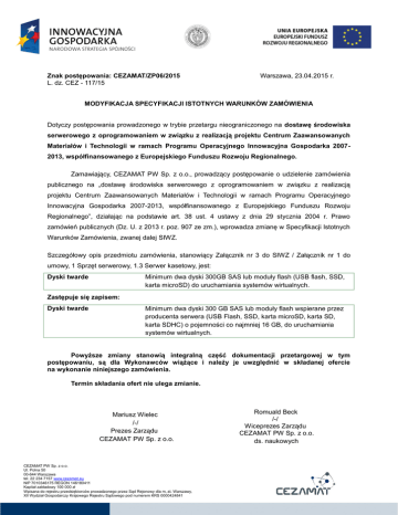 Znak postępowania: CEZAMAT/ZP06/2015 L. dz. CEZ - 117/15 Warszawa, 23.04.2015 r. MODYFIKACJA SPECYFIKACJI ISTOTNYCH WARUNKÓW ZAMÓWIENIA Dotyczy postępowania prowadzonego w trybie przetargu nieograniczonego na dostawę środowiska serwerowego z oprogramowaniem w związku z realizacją projektu Centrum Zaawansowanych Materiałów i Technologii w ramach Programu Operacyjnego Innowacyjna Gospodarka 20072013, współfinansowanego z Europejskiego Funduszu Rozwoju Regionalnego. Zamawiający, CEZAMAT PW Sp. z o.o., prowadzący postępowanie o udzielenie zamówienia publicznego na „dostawę środowiska serwerowego z oprogramowaniem w związku z realizacją projektu Centrum Zaawansowanych Materiałów i Technologii w ramach Programu Operacyjnego Innowacyjna Gospodarka 2007-2013, współfinansowanego z Europejskiego Funduszu Rozwoju Regionalnego”, działając na podstawie art. 38 ust. 4 ustawy z dnia 29 stycznia 2004 r. Prawo zamówień publicznych (Dz. U. z 2013 r. poz. 907 ze zm.), wprowadza zmianę w Specyfikacji Istotnych Warunków Zamówienia, zwanej dalej SIWZ. Szczegółowy opis przedmiotu zamówienia, stanowiący Załącznik nr 3 do SIWZ / Załącznik nr 1 do umowy, 1 Sprzęt serwerowy, 1.3 Serwer kasetowy, jest: Minimum dwa dyski 300GB SAS lub moduły flash (USB flash, SSD, karta microSD) do uruchamiania systemów wirtualnych. Dyski twarde Zastępuje się zapisem: Dyski twarde Minimum dwa dyski 300 GB SAS lub moduły flash wspierane przez producenta serwera (USB Flash, SSD, karta microSD, karta SD, karta SDHC) o pojemności co najmniej 16 GB, do uruchamiania systemów wirtualnych. Powyższe zmiany stanowią integralną część dokumentacji przetargowej w tym postępowaniu, są dla Wykonawców wiążące i należy je uwzględnić w składanej ofercie na wykonanie niniejszego zamówienia. Termin składania ofert nie ulega zmianie. Mariusz Wielec /-/ Prezes Zarządu CEZAMAT PW Sp. z o.o. CEZAMAT PW Sp. z o.o. Ul. Polna 50 00-644 Warszawa tel. 22 234 7157 www.cezamat.eu NIP 7010346175 REGON 146180411 Kapitał zakładowy 100 000 zł Wpisana do rejestru przedsiębiorców prowadzonego przez Sąd Rejonowy dla m,.st. Warszawy, XII Wydział Gospodarczy Krajowego Rejestru Sądowego pod numerem KRS 0000424841 Romuald Beck /-/ Wiceprezes Zarządu CEZAMAT PW Sp. z o.o. ds. naukowych