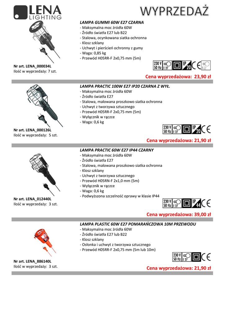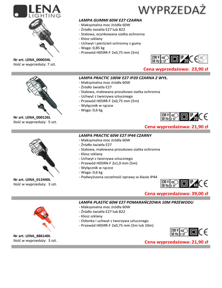 LAMPA GUMMI 60W E27 CZARNA - Maksymalna moc źródła 60W - Źródło światła E27 lub B22 - Stalowa, ocynkowana siatka ochronna - Klosz szklany - Uchwyt i pierścień ochronny z gumy - Waga: 0,85 kg - Przewód H05RR-F 2x0,75 mm (5m) Nr art. LENA_000034L Ilość w wyprzedaży: 7 szt. Cena wyprzedażowa: 23,90 zł LAMPA PRACTIC 100W E27 IP20 CZARNA Z WYŁ. - Maksymalna moc źródła 60W - Źródło światła E27 - Stalowa, malowana proszkowo siatka ochronna - Uchwyt z tworzywa sztucznego - Przewód H05RR-F 2x0,75 mm (5m) - Wyłącznik w rączce - Waga: 0,6 kg Nr art. LENA_000126L Ilość w wyprzedaży: 5 szt. Cena wyprzedażowa: 21,90 zł LAMPA PRACTIC 60W E27 IP44 CZARNY Nr art. LENA_012440L Ilość w wyprzedaży: 3 szt. - Maksymalna moc źródła 60W - Źródło światła E27 - Stalowa, malowana proszkowo siatka ochronna - Klosz szklany - Uchwyt z tworzywa sztucznego - Przewód H05RN-F 2x1,0 mm (5m) - Wyłącznik w rączce - Waga: 0,6 kg - Podwyższona szczelność oprawy w klasie IP44 Cena wyprzedażowa: 39,00 zł LAMPA PLASTIC 60W E27 POMARAŃCZOWA 10M PRZEWODU - Maksymalna moc źródła 60W - Źródło światła E27 lub B22 - Klosz szklany - Osłonka i uchwyt z tworzywa sztucznego - Przewód H05RR-F 2x0,75 mm (5m lub 10m) Nr art. LENA_886140L Ilość w wyprzedaży: 3 szt. Cena wyprzedażowa: 21,90 zł LAMPA EFFECT 11W IP20 Nr art. LENA_000072L Ilość w wyprzedaży: 1 szt. - Moc: 11W - Źródło światła: świetlówka energooszczędna TC-S (G23) - Obudowa wykonana z polipropylenu - Klosz wykonany z uderzenioodpornego poliwęglanu - Obrotowy wieszak - Waga: 0,4 kg - Przewód H05RN-F 2x0,75 mm (5m) Cena wyprzedażowa: 33,90 zł LAMPA PROFI DUO LED Z PRZEWODEM 24V - Maksymalna moc źródła 3,5W - Źródło światła 36 LED - 24V AC/DC Nr art. LENA_890277 Ilość w wyprzedaży: 2 szt. Cena wyprzedażowa: 149,00 zł LAMPA LENA MOBIL 12V 8W ŻÓŁTA Ręczna oprawa świetlówkowa bez możliwości wymiany świetlówki: - Moc 8W - Źródło światła: energooszczędna świetlówka T5 (G5) - Osłona świetlówki wykonana z PCV - Kapa i gryf z polietylenu - Waga: 0,3 kg - samochodowa 12V (model Mobil) Nr art. LENA_009013L Ilość w wyprzedaży: 1 szt. Cena wyprzedażowa: 19,00 zł LAMPA LENA TRUCK 24V 8W CZARNA Ręczna oprawa świetlówkowa bez możliwości wymiany świetlówki: - Moc 8W - Źródło światła: energooszczędna świetlówka T5 (G5) - Osłona świetlówki wykonana z PCV - Kapa i gryf z polietylenu - Waga: 0,3 kg - sieciowa 24V (model Truc) Nr art. LENA_009020L Ilość w wyprzedaży: 1 szt Cena wyprzedażowa: 29,00 zł LAMPA PROFI 11W 230V Nr art. LENA_111372L Ilość w wyprzedaży: 4 szt. Przewodowa oprawa świetlówkowa: - Moc: 11W - 83% niższe zużycie prądu (w porównaniu do 75W źródła żar.) - Źródło światła: energooszczędna świetlówka TC-S (G23) lub TC-S (2G7) - Klosz transparentny wykonany z poliwęglanu - Gryf i kapa wykonane z gumy - Obrotowy wieszak - Waga: 0,8 kg - Przewód gumowy H05RN-F 2x1 mm o długości 5m - Wyłącznik w rączce (w wersji 12V lub 24V) - Możliwość dokupienia i wymiany podzespołów Cena wyprzedażowa: 79,00 zł LAMPA PROFI DUO 11W 230V Nr art. LENA_111471L Ilość w wyprzedaży: 3 szt. Przewodowa oprawa świetlówkowa z funkcja latarki: - Moc: 11W - 83% niższe zużycie prądu (w porównaniu do 75W źródła żar. - Źródło światła: energooszczędna świetlówka TC-S (2G7) - Klosz transparentny wykonany z poliwęglanu - Gryf i kapa wykonane z gumy - Obrotowy wieszak - Waga: 0,8 kg - Przewód gumowy H05RN-F 2x1 mm o długości 5m - Wyłącznik w rączce (w wersji 12V lub 24V) - Możliwość dokupienia i wymiany podzespołów Cena wyprzedażowa: 89,00 zł LAMPA LENA PROFI DUO LED Nr art. LENA_111600L Ilość w wyprzedaży: 1 szt. Akumulatorowa oprawa diodowa z funkcją latarki - Moc 4,2 W - Źródło światła SMD LED - Kąt świecenia 110º - Klosz matowy wykonany z poliwęglanu - Gryf i kapa wykonane z gumy - Obrotowy wieszak - Wyłącznik w rączce - Akumulator Ni-MH 3,6V 1,8Ah - Czas ładowania: 4h - Czas pracy: 3h część główna, 16h część czołowa - Zasilacz μUSB 230V / 5V 1000mA (w opcji) - Możliwość dokupienia i wymiany podzespołów Cena wyprzedażowa: 229,00 zł LAMPA SPARK LED 3.24W Nr art. LENA_111648L Ilość w wyprzedaży: 15 szt. Akumulatorowa oprawa diodowa: - Moc 3,2W - Źródło światła LED - Kąt świecenia 110º - Klosz transparentny wykonany z poliwęglanu - Gryf i kapa wykonane z gumy - Obrotowy wieszak - Wyłącznik elektroniczny w rączce - Akumulator Ni-MH 3,6V 1,8Ah - Czas ładowania: 4h - Czas pracy: 4h - W komplecie z zasilaczem μUSB 230V / 5V 1000mA - Możliwość dokupienia i wymiany podzespołów Cena wyprzedażowa: 139,00 zł GOTAR LAMPA PRZENOŚNA 8W 230V Nr art. LENA_281006 Ilość w wyprzedaży: 1 szt. Przewodowa oprawa świetlówkowa o bardzo małej średnicy: - Moc: 8W - 83% niższe zużycie prądu (w porównaniu do 45W źródła żar.) - Źródło światła: energooszczędna świetlówka T5 (G5) - Klosz transparentny wykonany z PCV - Gryf i kapa wykonane z gumy - Obrotowy wieszak - Waga: 0,7 kg - Przewód gumowy H05RN-F 2x1 mm o długości 5m - Możliwość dokupienia i wymiany podzespołów Cena wyprzedażowa: 39,00 zł UCHWYT DO MAGNUM 127LED MAGNETYCZNY GUMOWY Nr art. LENA_894947 Ilość w wyprzedaży: 1 szt. Cena wyprzedażowa: 89,00 zł ŚWIETLÓWKA TL5 840 8W G5 <99208> - Moc 8W - Długość 28cm Nr art. LENA_WS00501L Ilość w wyprzedaży: 19 szt. Cena wyprzedażowa: 3,90 zł ŚWIETLÓWKA PL-S 840 11W G23 OSRAM DULUX-S 11W Nr art. LENA_WS11510L Ilość w wyprzedaży: 8 szt. Cena wyprzedażowa: 8,90 zł LAMPA MAGNUM 36W/230V Z GNIAZDEM PL-FR - Klosz i obudowa z tworzywa oderzenioodpornego - Wielopozycyjne ramię - Gniazdo 230V w tylnej części lampy - Źródło światła – dwie świetlówki PL-L 18W - IP 54 - Przewód 5 metrów 3x1,5mm2 Nr art. LENA_016769L Ilość w wyprzedaży: 1 szt . Cena wyprzedażowa: 139,00 zł UKŁAD GOTOWY PROFI 11W 230V VK05 . Nr art. LENA_10