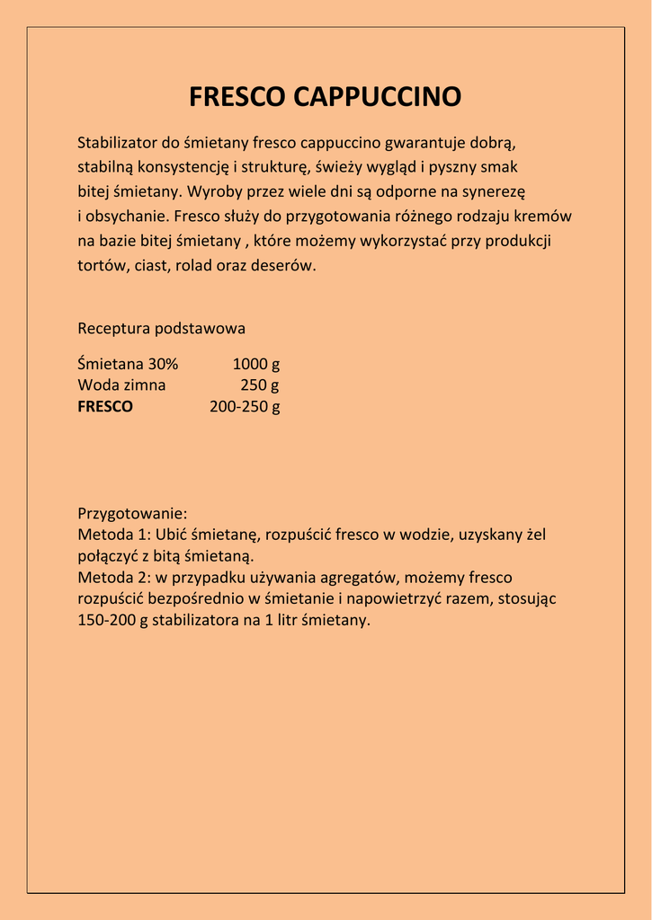 FRESCO CAPPUCCINO Stabilizator do śmietany fresco cappuccino gwarantuje dobrą, stabilną konsystencję i strukturę, świeży wygląd i pyszny smak bitej śmietany. Wyroby przez wiele dni są odporne na synerezę i obsychanie. Fresco służy do przygotowania różnego rodzaju kremów na bazie bitej śmietany , które możemy wykorzystać przy produkcji tortów, ciast, rolad oraz deserów. Receptura podstawowa Śmietana 30% Woda zimna FRESCO 1000 g 250 g 200-250 g Przygotowanie: Metoda 1: Ubić śmietanę, rozpuścić fresco w wodzie, uzyskany żel połączyć z bitą śmietaną. Metoda 2: w przypadku używania agregatów, możemy fresco rozpuścić bezpośrednio w śmietanie i napowietrzyć razem, stosując 150-200 g stabilizatora na 1 litr śmietany.