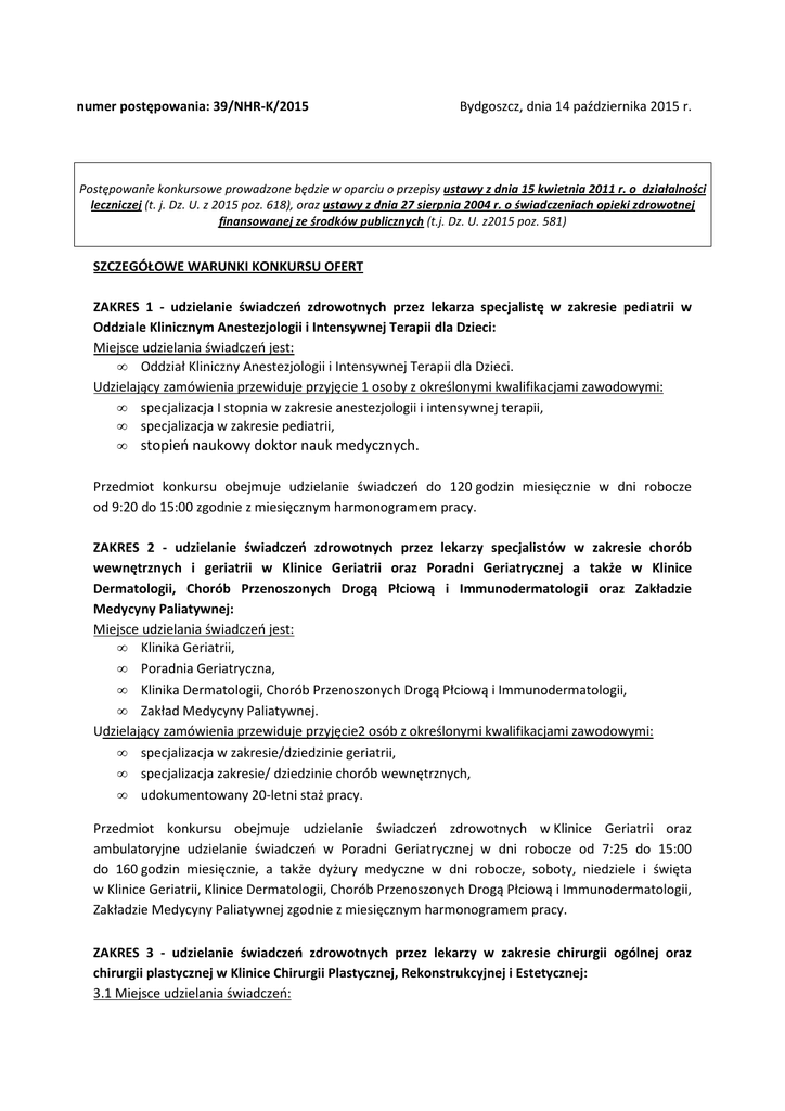 numer postępowania: 39/NHR-K/2015 Bydgoszcz, dnia 14 października 2015 r. Postępowanie konkursowe prowadzone będzie w oparciu o przepisy ustawy z dnia 15 kwietnia 2011 r. o działalności leczniczej (t. j. Dz. U. z 2015 poz. 618), oraz ustawy z dnia 27 sierpnia 2004 r. o świadczeniach opieki zdrowotnej finansowanej ze środków publicznych (t.j. Dz. U. z2015 poz. 581) SZCZEGÓŁOWE WARUNKI KONKURSU OFERT ZAKRES 1 - udzielanie świadczeń zdrowotnych przez lekarza specjalistę w zakresie pediatrii w Oddziale Klinicznym Anestezjologii i Intensywnej Terapii dla Dzieci: Miejsce udzielania świadczeń jest: • Oddział Kliniczny Anestezjologii i Intensywnej Terapii dla Dzieci. Udzielający zamówienia przewiduje przyjęcie 1 osoby z określonymi kwalifikacjami zawodowymi: • specjalizacja I stopnia w zakresie anestezjologii i intensywnej terapii, • specjalizacja w zakresie pediatrii, • stopień naukowy doktor nauk medycznych. Przedmiot konkursu obejmuje udzielanie świadczeń do 120 godzin miesięcznie w dni robocze od 9:20 do 15:00 zgodnie z miesięcznym harmonogramem pracy. ZAKRES 2 - udzielanie świadczeń zdrowotnych przez lekarzy specjalistów w zakresie chorób wewnętrznych i geriatrii w Klinice Geriatrii oraz Poradni Geriatrycznej a także w Klinice Dermatologii, Chorób Przenoszonych Drogą Płciową i Immunodermatologii oraz Zakładzie Medycyny Paliatywnej: Miejsce udzielania świadczeń jest: • Klinika Geriatrii, • Poradnia Geriatryczna, • Klinika Dermatologii, Chorób Przenoszonych Drogą Płciową i Immunodermatologii, • Zakład Medycyny Paliatywnej. Udzielający zamówienia przewiduje przyjęcie2 osób z określonymi kwalifikacjami zawodowymi: • specjalizacja w zakresie/dziedzinie geriatrii, • specjalizacja zakresie/ dziedzinie chorób wewnętrznych, • udokumentowany 20-letni staż pracy. Przedmiot konkursu obejmuje udzielanie świadczeń zdrowotnych w Klinice Geriatrii oraz ambulatoryjne udzielanie świadczeń w Poradni Geriatrycznej w dni robocze od 7:25 do 15:00 do 160 godzin miesięcznie, a także dyżury medyczne w dni robocze, soboty, niedziele i święta w Klinice Geriatrii, Klinice Dermatologii, Chorób Przenoszonych Drogą Płciową i Immunodermatologii, Zakładzie Medycyny Paliatywnej zgodnie z miesięcznym harmonogramem pracy. ZAKRES 3 - udzielanie świadczeń zdrowotnych przez lekarzy w zakresie chirurgii ogólnej oraz chirurgii plastycznej w Klinice Chirurgii Plastycznej, Rekonstrukcyjnej i Estetycznej: 3.1 Miejsce udzielania świadczeń: • Klinika Chirurgii Plastycznej Rekonstrukcyjnej i Estetycznej. Udzielający zamówienia przewiduje przyjęcie 1 osoby z określonymi kwalifikacjami zawodowymi: • specjalizacja w zakresie/dziedzinie chirurgii ogólnej, • specjalizacja w zakresie/dziedzinie chirurgii plastycznej, • stopień naukowy doktora habilitowanego nauk medycznych, • udokumentowane 3 letnie doświadczenie zawodowe w zakresie chirurgii plastycznej. Przedmiot konkursu obejmuje udzielanie świadczeń medycznych w zakresie zabiegów komercyjnych wg potrzeb Udzielającego zamówienia. 3.2 Miejsce udzielania świadczeń: • Klinika Chirurgii Plastycznej Rekonstrukcyjnej i Estetycznej. Udzielający zamówienia przewiduje przyjęcie 1 osoby z określonymi kwalifikacjami zawodowymi: • specjalizacja w zakresie/dziedzinie chirurgii ogólnej, • w trakcie specjalizacji w zakresie/dziedzinie chirurgii plastycznej. Przedmiot konkursu obejmuje udzielanie świadczeń medycznych w zakresie zabiegów komercyjnych wg potrzeb Udzielającego zamówienia. ZAKRES 4 - udzielanie świadczeń zdrowotnych przez lekarza w Klinice Otolaryngologii i Onkologii Laryngologicznej z Pododdziałem Audiologii i Foniatrii. Miejsce udzielania świadczeń jest: • Klinika Otolaryngologii i Onkologii Laryngologicznej z Pododdziałem Audiologii i Foniatrii. Udzielający zamówienia przewiduje przyjęcie 1 osoby z określonymi kwalifikacjami zawodowymi: • w trakcie ostatniego roku specjalizacji w dziedzinie otolaryngologii. Przedmiot konkursu obejmuje udzielanie świadczeń zdrowotnych do 100 godzin miesięcznie w dni robocze oraz dyżury medyczne w dni robocze, soboty, niedziele i święta zgodnie z miesięcznym harmonogramem pracy. Wymagania konieczne dla Oferentów zainteresowanych świadczeniem usług. a) W konkursie ofert w myśl art. 26 ust. 1 ustawy o działalności leczniczej, zamówienie może być udzielone podmiotowi wykonującemu działalność leczniczą lub osobie legitymującej się nabyciem fachowych kwalifikacji do udzielania świadczeń zdrowotnych (przyjmujący zamówienie). b) Przedmiot zamówienia nie może wykraczać poza rodzaj działalności leczniczej lub zakres świadczeń zdrowotnych wykonywanych przez przyjmującego zamówienie, zgodnie z wpisem do rejestru podmiotów wykonujących działalność leczniczą c) Do konkursu ofert stosuje się odpowiednio art. 140, art. 141, art. 146 ust. 1, art. 147150, 151 ust. 1, 2, 4-6, art. 152, 153 i art. 154 ust. 1 i 2 ustawy z dnia 27 sierpnia 2004 roku o świadczeniach opieki zdrowotnej finansowanych ze środków publicznych d) Przyjmujący zamówienie zobowiązuje się do udzielania świadczeń zdrowotnych w zakresie oraz na zasadach określonych w umowie, a udzielający zamówienia do zapłaty wynagrodzenia za udzielanie tych świadczeń. e) Osoby udzielające świadczeń w imieniu Oferenta lub sam Oferent (w przypadku osobistego udzielania świadczeń) nie pozostają w stosunku pracy z Udzielającym zamówienie i Oferent zobowiąże się do utrzymania takiego stanu w trakcie trwania umowy, zawartej w wyniku niniejszego konkursu, w zakresie świadczeń zdrowotnych. W przypadku wyłonienia oferty oferenta związanego stosunkiem pracy z Udzielającym zamówienia, oferent (w przypadku osobistego udzielania świadczeń) zobowiązuje się do rozwiązania umowy o pracę z dniem zawarcia umowy o świadczenia zdrowotne. Do konkursu mogą przystąpić tylko i wyłącznie osoby spełniające wymagania 
