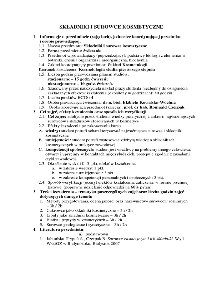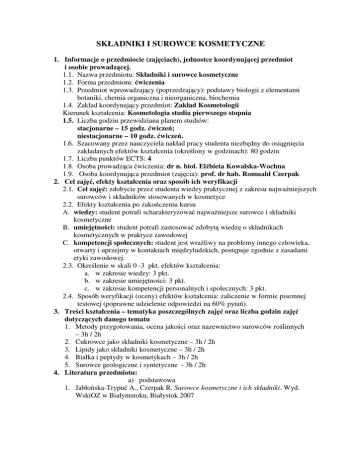 SKŁADNIKI I SUROWCE KOSMETYCZNE 1. Informacje o przedmiocie (zajęciach), jednostce koordynującej przedmiot i osobie prowadzącej. 1.1. Nazwa przedmiotu: Składniki i surowce kosmetyczne 1.2. Forma przedmiotu: ćwiczenia 1.3. Przedmiot wprowadzający (poprzedzający): podstawy biologii z elementami botaniki, chemia organiczna i nieorganiczna, biochemia 1.4. Zakład koordynujący przedmiot: Zakład Kosmetologii Kierunek kształcenia: Kosmetologia studia pierwszego stopnia 1.5. Liczba godzin przewidziana planem studiów: stacjonarne – 15 godz. ćwiczeń; niestacjonarne – 10 godz. ćwiczeń. 1.6. Szacowany przez nauczyciela nakład pracy studenta niezbędny do osiągnięcia zakładanych efektów kształcenia (określony w godzinach): 80 godzin 1.7. Liczba punktów ECTS: 4 1.8. Osoba prowadząca ćwiczenia: dr n. biol. Elżbieta Kowalska-Wochna 1.9. Osoba koordynująca przedmiot (zajęcia): prof. dr hab. Romuald Czerpak 2. Cel zajęć, efekty kształcenia oraz sposób ich weryfikacji 2.1. Cel zajęć: zdobycie przez studenta wiedzy praktycznej z zakresu najważniejszych surowców i składników stosowanych w kosmetyce 2.2. Efekty kształcenia po zakończeniu kursu A. wiedzy: student potrafi scharakteryzować najważniejsze surowce i składniki kosmetyczne B. umiejętności: student potrafi zastosować zdobytą wiedzę o składnikach kosmetycznych w praktyce zawodowej C. kompetencji społecznych: student jest wrażliwy na problemy innego człowieka, otwarty i uprzejmy w kontaktach międzyludzkich, postępuje zgodnie z zasadami etyki zawodowej. 2.3. Określenie w skali 0 -3 pkt. efektów kształcenia: a. w zakresie wiedzy: 3 pkt. b. w zakresie umiejętności: 3 pkt. c. w zakresie kompetencji personalnych i społecznych: 3 pkt. 2.4. Sposób weryfikacji (oceny) efektów kształcenia: zaliczenie w formie pisemnej testowej (poprawne udzielenie odpowiedzi na 60% pytań). 3. Treści kształcenia – tematyka poszczególnych zajęć oraz liczba godzin zajęć dotyczących danego tematu 1. Metody przygotowania, ocena jakości oraz nazewnictwo surowców roślinnych – 3h / 2h 2. Cukrowce jako składniki kosmetyczne – 3h / 2h 3. Lipidy jako składniki kosmetyczne – 3h / 2h 4. Białka i peptydy w kosmetykach – 3h / 2h 5. Surowce geologiczne i syntetyczne - 3h / 2h 4. Literatura przedmiotu: a) podstawowa 1. Jabłońska-Trypuć A., Czerpak R. Surowce kosmetyczne i ich składniki. Wyd. WskiOZ w Białymstoku, Białystok 2007 2. Lamer-Zarawska E., Noculak-Palczewska A. Kosmetyki naturalne. Przewodnik dla zielarzy, farmaceutów i zakładów kosmetycznych. Wyd. ASTRUM, Wrocław, 1994 b) uzupełniająca 1. Jędrzejko K., Kowalczyk B., Bacler B. Rośliny kosmetyczne. Wyd. Śląski Uniwersytet Medyczny, Katowice 2007 2. Wybrane artykuły z prasy branżowej 5. Inne pomoce dydaktyczne: Rzutnik multimedialny z komputerem, tablica, mieszanki i preparaty ziołowe, surowce roślinne, preparaty mikroskopowe.