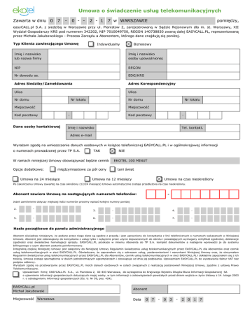 Umowa o świadczenie usług telekomunikacyjnych Zawarta w dniu 0 7 - 0 - - 2 - 1 7 w WARSZAWIE pomiędzy, easyCALL.pl S.A. z siedzibą w Warszawie przy ul. Pianistow 2, zarejestrowaną w Sądzie Rejonowym dla m. st. Warszawy, XII Wydział Gospodarczy KRS pod numerem 342202, NIP 7010049750, REGON 140738830 zwaną dalej EASYCALL.PL, reprezentowaną przez Michała Jakubowskiego - Prezesa Zarządu a Abonentem, którego dane znajdują się poniżej. Typ Klienta zawierającego Umowę Indywidualny Biznesowy Imię i nazwisko lub nazwa firmy Imię i nazwisko osoby upoważnionej NIP REGON Nr dowodu os. EDG/KRS Adres Siedziby/Zameldowania Adres Korespondencyjny Ulica Ulica Nr domu Nr lokalu Nr domu Miejscowość Nr lokalu Miejscowość Kod pocztowy - Dane osoby kontaktowej Kod pocztowy - Imię i nazwisko Tel. kontakt. Adres e-mail Wyrażam zgodę na umieszczenie danych osobowych w książce telefonicznej EASYCALL.PL i w ogólnokrajowej informacji o numerach prowadzonej przez TP S.A. TAK NIE W ramach niniejszej Umowy obowiązywać będzie cennik Opcje dodatkowe: EKOTEL 100 MINUT międzymiastowe za pół ceny Umowa na 24 miesiące tani świat Umowa na 12 miesięcy Umowa na czas nieokreślony Po zakończeniu Umowy zawartej na czas określony (12/24 miesiące) Umowa automatycznie zostaje przedłużona na czas nieokreślony. Abonent zawiera Umowę na następujących numerach telefonów: - Jeżeli zamówienie dotyczy większej ilości numerów prosimy wpisać kolejne numery poniżej 2. - 5. - 3. - 4. - 6. - 7. - Hasło początkowe do panelu administracyjnego Abonent oświadcza niniejszym, że podane przez niego dane są zgodne z prawdą i jest uprawniony do korzystania z linii telefonicznych o numerach wskazanych w Niniejszej Umowie. Abonent jest zobowiązany do korzystania z usług tylko i wyłącznie przez użycie dopuszczonych do obrotu i posiadających wymagany certyfikat zgodności, deklaracje zgodności oraz świadectwo homologacji sprzętu. EASYCALL.PL przekaże w imieniu Abonenta do TP S.A. komplet dokumentów a następnie wprowadzi je do systemu billingowego o czym abonent zostanie poinformowany. Integralną częścią Niniejszej Umowy jest załączony do Niniejszej Umowy Regulamin świadczenia usług telekomunikacyjnych przez EASYCALL.PL dla Abonentów oraz cennik usług telekomunikacyjnych w sieci EASYCALL.PL. Oświadczam, że zapoznałem się z zakresem usług, postanowieniami i warunkami Niniejszej Umowy oraz, że otrzymałem Regulamin świadczenia usług telekomunikacyjnych przez EASYCALL.PL dla Abonentów, cennik usług telekomunikacyjnych w sieci EASYCALL.PL i dokładnie zapoznałem się z ich treścią. Umowa zostaje sporządzona w dwóch jednobrzmiących egzemplarzach i obowiązuje od dnia jej podpisania. Upoważniam EASYCALL.PL do wystawiania faktur VAT bez podpisu odbiorcy. Wyrażam zgodę na przetwarzanie przez EASYCALL.PL moich danych osobowych w celach związanych z realizacją postanowień Niniejszej Umowy, zgodnie z ustawą Prawo Telekomunikacyjne. Upoważniam firmę EASYCALL.PL S.A., ul. Pianistow 2, 02-403 Warszawa, do wystąpienia do Krajowego Rejestru Długów Biura Informacji Gospodarczej SA o ujawnienie informacji gospodarczych dotyczących mojej osoby, w tym informacji o zobowiązaniach powstałych przed dniem wejścia w życie Ustawy z 14. lutego 2003 r. o udostępnieniu informacji gospodarczych (Dz. U. Nr 50, poz. 424). EASYCALL.pl Michał Jakubowski Abonent Miejscowość Warszawa Data 0 7 - 0 3 - 2 0 1 7 Umowa o świadczenie usług telekomunikacyjnych Zawarta w dniu 0 7 - 0 - - 2 - 1 7 w WARSZAWIE pomiędzy, easyCALL.pl S.A. z siedzibą w Warszawie przy ul. Pianistow 2, zarejestrowaną w Sądzie Rejonowym dla m. st. Warszawy, XII Wydział Gospodarczy KRS pod numerem 342202, NIP 7010049750, REGON 140738830 zwaną dalej EASYCALL.PL, reprezentowaną przez Michała Jakubowskiego - Prezesa Zarządu a Abonentem, którego dane znajdują się poniżej. Typ Klienta zawierającego Umowę Indywidualny Biznesowy Imię i nazwisko lub nazwa firmy Imię i nazwisko osoby upoważnionej NIP REGON Nr dowodu os. EDG/KRS Adres Siedziby/Zameldowania Adres Korespondencyjny Ulica Ulica Nr domu Nr lokalu Nr domu Miejscowość Nr lokalu Miejscowość Kod pocztowy - Dane osoby kontaktowej Kod pocztowy - Imię i nazwisko Tel. kontakt. Adres e-mail Wyrażam zgodę na umieszczenie danych osobowych w książce telefonicznej EASYCALL.PL i w ogólnokrajowej informacji o numerach prowadzonej przez TP S.A. TAK NIE W ramach niniejszej Umowy obowiązywać będzie cennik Opcje dodatkowe: EKOTEL 100 MINUT międzymiastowe za pół ceny Umowa na 24 miesiące tani świat Umowa na 12 miesięcy Umowa na czas nieokreślony Po zakończeniu Umowy zawartej na czas określony (12/24 miesiące) Umowa automatycznie zostaje przedłużona na czas nieokreślony. Abonent zawiera Umowę na następujących numerach telefonów: - Jeżeli zamówienie dotyczy większej ilości numerów prosimy wpisać kolejne numery poniżej 2. - 5. - 3. - 4. - 6. - 7. - Hasło początkowe do panelu administracyjnego Abonent oświadcza niniejszym, że podane przez niego dane są zgodne z prawdą i jest uprawniony do korzystania z linii telefonicznych o numerach wskazanych w Niniejszej Umowie. Abonent jest zobowiązany do korzystania z usług tylko i wyłącznie przez użycie dopuszczonych do obrotu i posiadających wymagany certyfikat zgodności, deklaracje zgodności oraz świadectwo homologacji sprzętu. EASYCALL.PL przekaże w imieniu Abonenta do TP S.A. komplet dokumentów a następnie wprowadzi je do systemu billingowego o czym abonent zostanie poinformowany. Integralną częścią Niniejszej Umowy jest załączony do Niniejszej Umowy Regulamin świadczenia usług telekomunikacyjnych przez EASYCALL.PL dla Abonentów oraz cennik usług telekomunikacyjnych w sieci EASYCALL.PL. Oświadczam, że zapoznałem się z zakresem usług, postanowieniami i warunkami Niniejszej Umowy oraz, że otrzymałem Regulamin świadczenia usług telekomunikacyjnyc