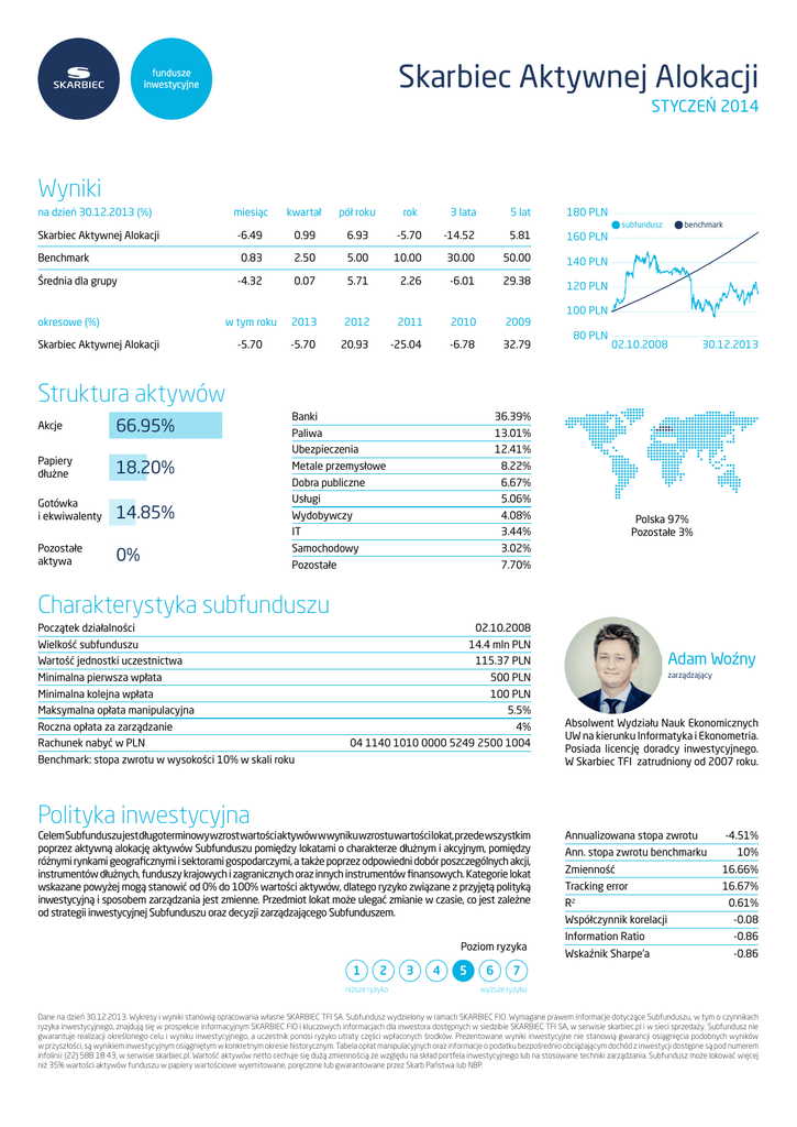 Skarbiec Aktywnej Alokacji STYCZEŃ 2014 Wyniki 3 lata 5 lat 180 PLN -5.70 -14.52 5.81 160 PLN 5.00 10.00 30.00 50.00 140 PLN 0.07 5.71 2.26 -6.01 29.38 120 PLN w tym roku 2013 2012 2011 2010 2009 -5.70 -5.70 20.93 -25.04 -6.78 32.79 na dzień 30.12.2013 (%) Skarbiec Aktywnej Alokacji Benchmark Średnia dla grupy okresowe (%) Skarbiec Aktywnej Alokacji miesiąc kwartał pół roku rok -6.49 0.99 6.93 0.83 2.50 -4.32 subfundusz benchmark 100 PLN 80 PLN 02.10.2008 30.12.2013 Struktura aktywów Akcje Papiery dłużne Gotówka i ekwiwalenty Pozostałe aktywa 66.95% 18.20% 14.85% 0% Banki 36.39% Paliwa 13.01% Ubezpieczenia 12.41% Metale przemysłowe 8.22% Dobra publiczne 6.67% Usługi 5.06% Wydobywczy 4.08% IT 3.44% Samochodowy 3.02% Pozostałe 7.70% Polska 97% Pozostałe 3% Charakterystyka subfunduszu Początek działalności 02.10.2008 Wielkość subfunduszu 14.4 mln PLN Wartość jednostki uczestnictwa 500 PLN Minimalna kolejna wpłata 100 PLN Maksymalna opłata manipulacyjna 5.5% Roczna opłata za zarządzanie Rachunek nabyć w PLN Adam Woźny 115.37 PLN Minimalna pierwsza wpłata 4% 04 1140 1010 0000 5249 2500 1004 Benchmark: stopa zwrotu w wysokości 10% w skali roku zarządzający Absolwent Wydziału Nauk Ekonomicznych UW na kierunku Informatyka i Ekonometria. Posiada licencję doradcy inwestycyjnego. W Skarbiec TFI zatrudniony od 2007 roku. Polityka inwestycyjna CelemSubfunduszujestdługoterminowywzrostwartościaktywówwwynikuwzrostuwartościlokat,przedewszystkim poprzez aktywną alokację aktywów Subfunduszu pomiędzy lokatami o charakterze dłużnym i akcyjnym, pomiędzy różnymi rynkami geograficznymi i sektorami gospodarczymi, a także poprzez odpowiedni dobór poszczególnych akcji, instrumentów dłużnych, funduszy krajowych i zagranicznych oraz innych instrumentów finansowych. Kategorie lokat wskazane powyżej mogą stanowić od 0% do 100% wartości aktywów, dlatego ryzyko związane z przyjętą polityką inwestycyjną i sposobem zarządzania jest zmienne. Przedmiot lokat może ulegać zmianie w czasie, co jest zależne od strategii inwestycyjnej Subfunduszu oraz decyzji zarządzającego Subfunduszem. Poziom ryzyka 1 2 niższe ryzyko 3 4 5 6 Annualizowana stopa zwrotu Ann. stopa zwrotu benchmarku -4.51% 10% Zmienność 16.66% Tracking error 16.67% R2 0.61% Współczynnik korelacji -0.08 Information Ratio -0.86 Wskaźnik Sharpe’a -0.86 7 wyższe ryzyko Dane na dzień 30.12.2013. Wykresy i wyniki stanowią opracowania własne SKARBIEC TFI SA. Subfundusz wydzielony w ramach SKARBIEC FIO. Wymagane prawem informacje dotyczące Subfunduszu, w tym o czynnikach ryzyka inwestycyjnego, znajdują się w prospekcie informacyjnym SKARBIEC FIO i kluczowych informacjach dla inwestora dostępnych w siedzibie SKARBIEC TFI SA, w serwisie skarbiec.pl i w sieci sprzedaży. Subfundusz nie gwarantuje realizacji określonego celu i wyniku inwestycyjnego, a uczestnik ponosi ryzyko utraty części wpłaconych środków. Prezentowane wyniki inwestycyjne nie stanowią gwarancji osiągnięcia podobnych wyników w przyszłości, są wynikiem inwestycyjnym osiągniętym w konkretnym okresie historycznym. Tabela opłat manipulacyjnych oraz informacje o podatku bezpośrednio obciążającym dochód z inwestycji dostępne są pod numerem infolinii: (22) 588 18 43, w serwisie skarbiec.pl. Wartość aktywów netto cechuje się dużą zmiennością ze względu na skład portfela inwestycyjnego lub na stosowane techniki zarządzania. Subfundusz może lokować więcej niż 35% wartości aktywów funduszu w papiery wartościowe wyemitowane, poręczone lub gwarantowane przez Skarb Państwa lub NBP.