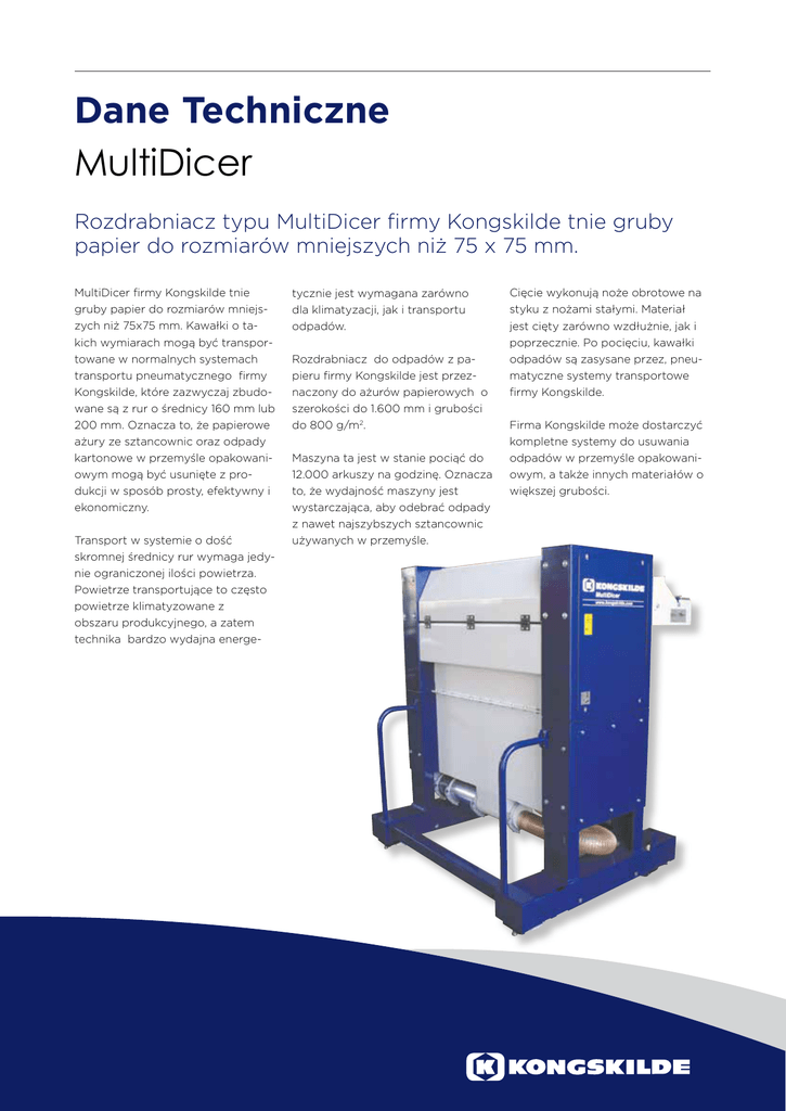 Dane Techniczne MultiDicer Rozdrabniacz typu MultiDicer firmy Kongskilde tnie gruby papier do rozmiarów mniejszych niż 75 x 75 mm. MultiDicer firmy Kongskilde tnie gruby papier do rozmiarów mniejszych niż 75x75 mm. Kawałki o takich wymiarach mogą być transportowane w normalnych systemach transportu pneumatycznego firmy Kongskilde, które zazwyczaj zbudowane są z rur o średnicy 160 mm lub 200 mm. Oznacza to, że papierowe ażury ze sztancownic oraz odpady kartonowe w przemyśle opakowaniowym mogą być usunięte z produkcji w sposób prosty, efektywny i ekonomiczny. Transport w systemie o dość skromnej średnicy rur wymaga jedynie ograniczonej ilości powietrza. Powietrze transportujące to często powietrze klimatyzowane z obszaru produkcyjnego, a zatem technika bardzo wydajna energe- tycznie jest wymagana zarówno dla klimatyzacji, jak i transportu odpadów. Rozdrabniacz do odpadów z papieru firmy Kongskilde jest przeznaczony do ażurów papierowych o szerokości do 1.600 mm i grubości do 800 g/m2. Maszyna ta jest w stanie pociąć do 12.000 arkuszy na godzinę. Oznacza to, że wydajność maszyny jest wystarczająca, aby odebrać odpady z nawet najszybszych sztancownic używanych w przemyśle. Cięcie wykonują noże obrotowe na styku z nożami stałymi. Materiał jest cięty zarówno wzdłużnie, jak i poprzecznie. Po pocięciu, kawałki odpadów są zasysane przez, pneumatyczne systemy transportowe firmy Kongskilde. Firma Kongskilde może dostarczyć kompletne systemy do usuwania odpadów w przemyśle opakowaniowym, a także innych materiałów o większej grubości. Informacje techniczne Typ Maksymalny rozmiar arkusza (szerokość) Maks. liczba arkuszy na godzinę (przy maks. 8% pozostałości na arkusz) Materiały, które mogą być cięte Grubość* (przed cięciem w sztancownicy) KMD 12 KMD 18 1.060 mm 1.630 mm 12.000 7.000 Papier, tektura, tektura falista Papier, tektura, tektura falista 90 g/m - 800 g/m 90 g/m2 - 800 g/m2 2 2 Silniki: Wał z nożami i wałek podający 7,5 kW, 1.400 obr./min Przenośnik taśmowy 2,2 kW, 900 obr./min 2,2 kW, 900 obr./min 0,75 kW, 2.900 obr./min 0,75 kW, 2.900 obr./min 1.115 kg 1.360 kg Dmuchawa Masa maszyny 7,5 kW, 1.400 obr./min * Gdyby urządzenie miało być używane do cięcia materiałów o grubości materiałów większej niż 800g/m2, zaleca się, aby firma Kongskilde przeprowadziła wcześniej test materiału w celu upewnienia się, że maszyna może pociąć dany materiał w zadowalający sposób. Wymiary KMD 12 598 17 1125 515 2833 3037 268 1603 1807 OK160 1592 1200 1700 219 KMD 18 596 MULTIDICER Måleskitse KMD12 01 572 Revision: 121117957 1678 266 2833 1653 2858 OK200 2168 1200 123001643 KPL/PL/MultiDicer/0416 Zastrzega się prawo do wprowadzania zmian Kongskilde Polska Sp. z o.o. Tel. 024 355 96 15 [email protected] www.kongskilde.com