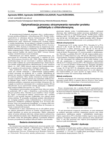 Prosimy cytować jako: Inż. Ap. Chem. 2016, 55, 5, 201-202 Nr 5/2016 INŻYNIERIA I APARATURA CHEMICZNA str. 201 Agnieszka SEBAI, Agnieszka GADOMSKA-GAJADHUR, Paweł RUŚKOWSKI, e-mail: [email protected] Laboratorium Procesów Technologicznych, Wydział Chemiczny, Politechnika Warszawska, Warszawa Optymalizacja procesu otrzymywania nanosfer proleku polilaktydu z chlorofenezyną Wstęp W prezentowanych badaniach otrzymano sfery z wielkocząsteczkowego proleku polilaktydu z chlorofenezyną (CF). Proleki wielkocząsteczkowe to substancje aktywne farmaceutycznie API (Active Pharmaceutical Ingredient,) chemicznie związane z łańcuchem polimerowym, które właściwości terapeutyczne uzyskują dopiero w wyniku metabolizmu. Są one jednym z rodzajów systemów leków o kontrolowanym czasie uwalniania DDS (Drug Delivery Systems,) [Hoffmann, 2001]. Systemy te charakteryzują się stopniowym uwalnianiem substancji aktywnej w organizmie, co powoduje wydłużenie efektu terapeutycznego. Proleki z polimerów ulegających degradacji mogą stanowić budulec dla innych form DDS i tworzyć złożone systemy o kontrolowanym czasie uwalniania. Chlorofenezyna jest lekiem bakterio- i grzybostatycznym, dopuszczonym do stosowania jako konserwant, w stężeniu do 0,3% mas. [Dziewiętnasta Dyrektywa KE, 1996]. Mimo silnego działania grzybostatycznego nie jest stosowania w praktyce medycznej, ponieważ słabo wchłania się z przewodu pokarmowego. Znane dotychczas proleki wielkocząsteczkowe chlorofenezyny to estry winylowe [Quan i in., 2007; 2008], których wadą jest brak biodegradowalności, co ogranicza ich zastosowanie w farmacji i medycynie. Sfery polimerowe można otrzymać kilkoma metodami. Jedną z nich jest metoda emulsyjna z odparowaniem rozpuszczalnika, w której otrzymuje się dyspersję sfer w wodzie. Modyfikacją tej metody jest metoda wysalania poprzez dodanie nierozpuszczalnika do roztworu polimeru. Sfery można otrzymywać również poprzez suszenie rozpyłowe. Ostatnią metoda jest rozprężanie nadkrytycznego ditlenku węgla. Jeżeli w formie nadkrytycznej jest on rozpuszczalnikiem polimeru, rozprężenie gazu powoduje wytrącenie sfer. Ze względu na możliwość otrzymania sfer o rozmiarze poniżej 100 nm zdecydowano się na zastosowanie metody emulsyjnej z odparowaniem rozpuszczalnika [Nawagarma i in., 2012]. Potencjalnym zastosowaniem otrzymanej formy leku jest naskórne podawanie API w walce z kłopotliwą, a powszechną chorobą, jaką jest grzybicą skóry. Choroba ta jest uciążliwa i dosyć wstydliwa, słynie z nawracających infekcji. Zastosowanie sfer z proleku PLA-CF w jej leczeniu znacznie wydłużyłaby czas ochrony przed wtórną infekcją. W przypadku naskórnego podanie chlorofenezyny nie występuje problem z niską wchłanialnością w przewodzie pokarmowym. Dodatkowo polilaktyd degraduje m.in. do kwasu mlekowego, który jest promotorem przenikania, co wzmaga efekt terapeutyczny. Domyślną formą leku byłby liofilizat do tworzenia zawiesin w maściach lub kremach. Przedstawiona w pracy optymalizacja ma na celu głębsze poznanie wpływu parametrów procesu na rozmiar otrzymywanych sfer, a także określenie czy proces jest powtarzalny. Wpływ zmiennych zależy od użytej substancji aktywnej, rodzaju matrycy polimerowej, a także oddziaływań między nimi. Określenie powtarzalności procesu jest bardzo ważne dla potencjalnej aplikacji w przemyśle farmaceutycznym, jest podstawą do podjęcia dalszych badań w tym kierunku. Badania doświadczalne Surowce Do otrzymywania nanosfer polimerowych stosowano prolek wielkocząsteczkowy poli-L-laktydu z chlorofenezyną o średniej liczbowo masie molowej 3300 g/mol (PLA-CF). Prolek otrzymano w Laboratorium Procesów Technologicznych Wydziału Chemicznego Politechniki Warszawskiej metodą polimeryzacji z otwarciem pierścienia laktydu wobec 2-etyloheksanianu cynku i substancji aktywnej. Jako stabilizatory emulsji stosowano poli(alkohol winylowy) PVA Mowiol, o symbolach 4_88 (Mw 30 000 g/mol, stopień hydrolizy 88%), 18_88 (Mw 130 000 g/mol, stopień hydrolizy 88%) oraz 40_88 (Mw 210 000 g/mol, stopień hydrolizy 88%). Rozpuszczalnikiem proleku był dichlorometan cz.d.a. produkcji POCh SA. Metoda otrzymywania Przygotowano 0,1% wodny roztwór PVA. Naważkę 0,5 g PVA (Mowiol 4_88, 18_88 lub 40_88) i 400 mL wody destylowanej pozostawiono w kolbie miarowej o poj. 500 mL na dwa dni do całkowitego rozpuszczenia polialkoholu. Następnie uzupełniono wodą do kreski. Przygotowano 1% roztwór proleku w dichlorometanie. Naważkę 1 g proleku PLA-CF i 80 mL rozpuszczalnika pozostawiono w kolbie miarowej o poj. 100 mL do całkowitego rozpuszczenia polimeru. Następnie uzupełniono dichlorometanem do kreski. W celu otrzymania sfer polimerowych, do kolby kulistej o poj. 250 mL zaopatrzonej w mieszadło magnetyczne wprowadzano 100 mL 0,1% wodnego roztworu PVA. We wkraplaczu umieszczano 5 mL 1% roztworu proleku w dichlorometanie. Następnie wkraplano przez 15 minut mieszając z szybkością 300, 600 lub 900 min–1, w temp. 20, 25 lub 30°C. Po wkropleniu całego roztworu polimeru zawiesinę sfer polimerowych mieszano przez 1 h w celu odparowania rozpuszczalnika, po czym sączono na lejku Schotta 3G oraz zmierzono rozmiar sfer wykorzystując analizę DLS. Metody analityczne Rozmiar otrzymanych sfer oznaczono metodą dynamicznego rozpraszania światła (DLS) w aparacie Malvern Zetasizer Nano model ZEN 3600. Pomiary wykonywano w kuwetach polistyrenowych. Optymalizacja procesu Proces otrzymywania sfer z proleku PLA-CF zoptymalizowano z wykorzystaniem matematycznych metod planowania doświadczeń. W pierwszej kolejności określono strukturę procesu i zmienne mające wpływ na rozmiar sfer (Rys. 1). Rys. 1. Struktura procesu (tzw. czarna skrzynka) W serii doświadczeń wstępnych stwierdzono, że tymi zmiennymi są szybkość mieszania roztworu, temperatura procesu oraz ciężar cząsteczkowy stabilizatora emulsji – poli(alkoholu winylowego). Ci