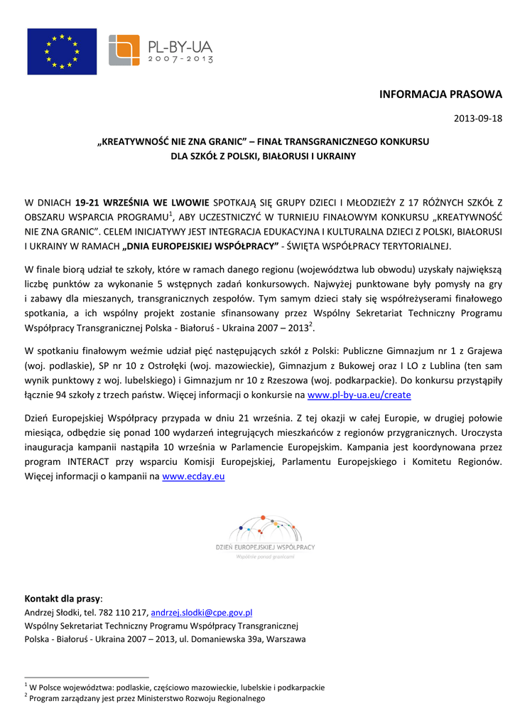 INFORMACJA PRASOWA 2013-09-18 „KREATYWNOŚĆ NIE ZNA GRANIC” – FINAŁ TRANSGRANICZNEGO KONKURSU DLA SZKÓŁ Z POLSKI, BIAŁORUSI I UKRAINY W DNIACH 19-21 WRZEŚNIA WE LWOWIE SPOTKAJĄ SIĘ GRUPY DZIECI I MŁODZIEŻY Z 17 RÓŻNYCH SZKÓŁ Z OBSZARU WSPARCIA PROGRAMU1, ABY UCZESTNICZYĆ W TURNIEJU FINAŁOWYM KONKURSU „KREATYWNOŚĆ NIE ZNA GRANIC”. CELEM INICJATYWY JEST INTEGRACJA EDUKACYJNA I KULTURALNA DZIECI Z POLSKI, BIAŁORUSI I UKRAINY W RAMACH „DNIA EUROPEJSKIEJ WSPÓŁPRACY” - ŚWIĘTA WSPÓŁPRACY TERYTORIALNEJ. W finale biorą udział te szkoły, które w ramach danego regionu (województwa lub obwodu) uzyskały największą liczbę punktów za wykonanie 5 wstępnych zadań konkursowych. Najwyżej punktowane były pomysły na gry i zabawy dla mieszanych, transgranicznych zespołów. Tym samym dzieci stały się współreżyserami finałowego spotkania, a ich wspólny projekt zostanie sfinansowany przez Wspólny Sekretariat Techniczny Programu Współpracy Transgranicznej Polska - Białoruś - Ukraina 2007 – 20132. W spotkaniu finałowym weźmie udział pięć następujących szkół z Polski: Publiczne Gimnazjum nr 1 z Grajewa (woj. podlaskie), SP nr 10 z Ostrołęki (woj. mazowieckie), Gimnazjum z Bukowej oraz I LO z Lublina (ten sam wynik punktowy z woj. lubelskiego) i Gimnazjum nr 10 z Rzeszowa (woj. podkarpackie). Do konkursu przystąpiły łącznie 94 szkoły z trzech państw. Więcej informacji o konkursie na www.pl-by-ua.eu/create Dzień Europejskiej Współpracy przypada w dniu 21 września. Z tej okazji w całej Europie, w drugiej połowie miesiąca, odbędzie się ponad 100 wydarzeń integrujących mieszkańców z regionów przygranicznych. Uroczysta inauguracja kampanii nastąpiła 10 września w Parlamencie Europejskim. Kampania jest koordynowana przez program INTERACT przy wsparciu Komisji Europejskiej, Parlamentu Europejskiego i Komitetu Regionów. Więcej informacji o kampanii na www.ecday.eu Kontakt dla prasy: Andrzej Słodki, tel. 782 110 217, [email protected] Wspólny Sekretariat Techniczny Programu Współpracy Transgranicznej Polska - Białoruś - Ukraina 2007 – 2013, ul. Domaniewska 39a, Warszawa 1 2 W Polsce województwa: podlaskie, częściowo mazowieckie, lubelskie i podkarpackie Program zarządzany jest przez Ministerstwo Rozwoju Regionalnego